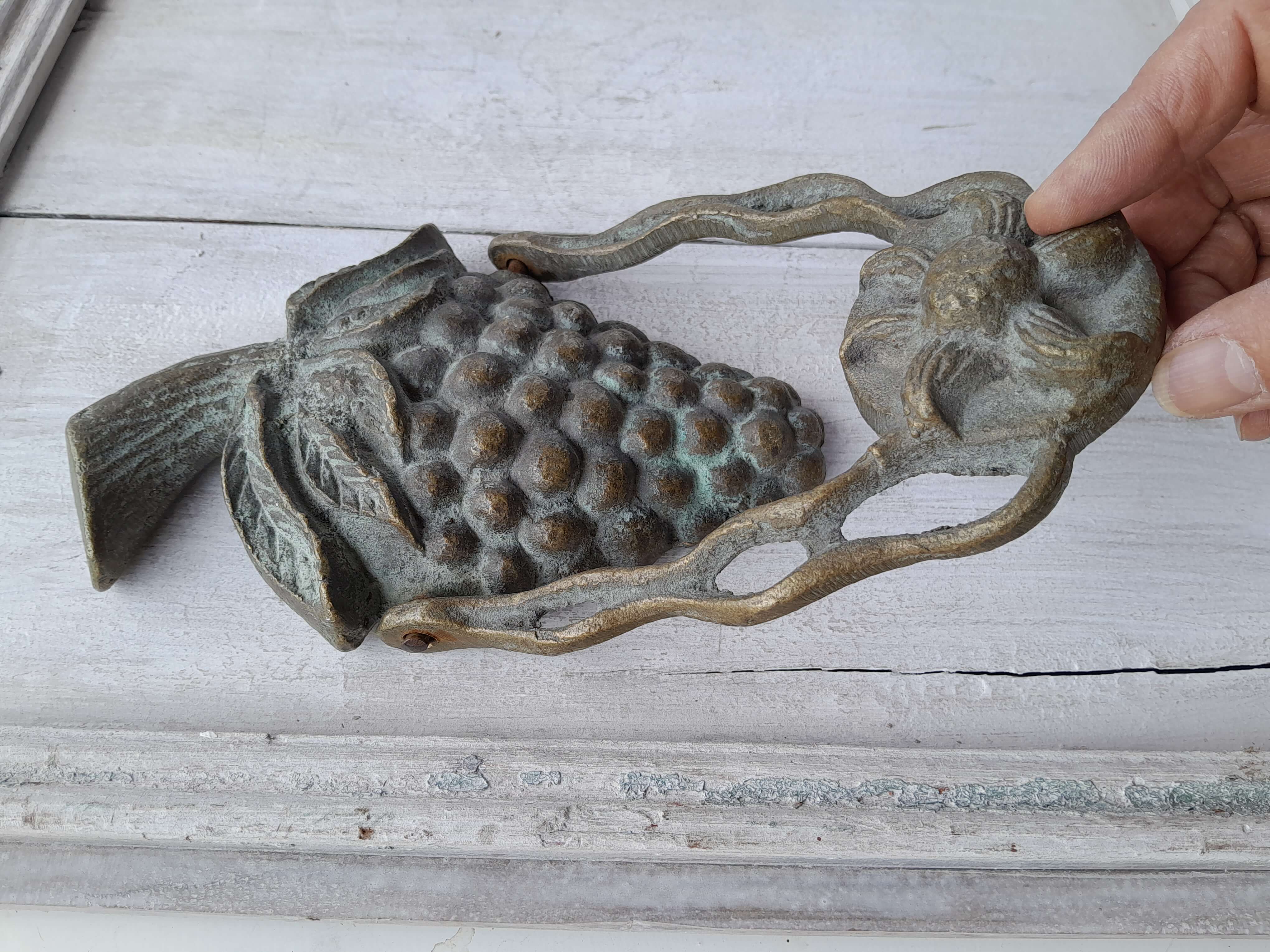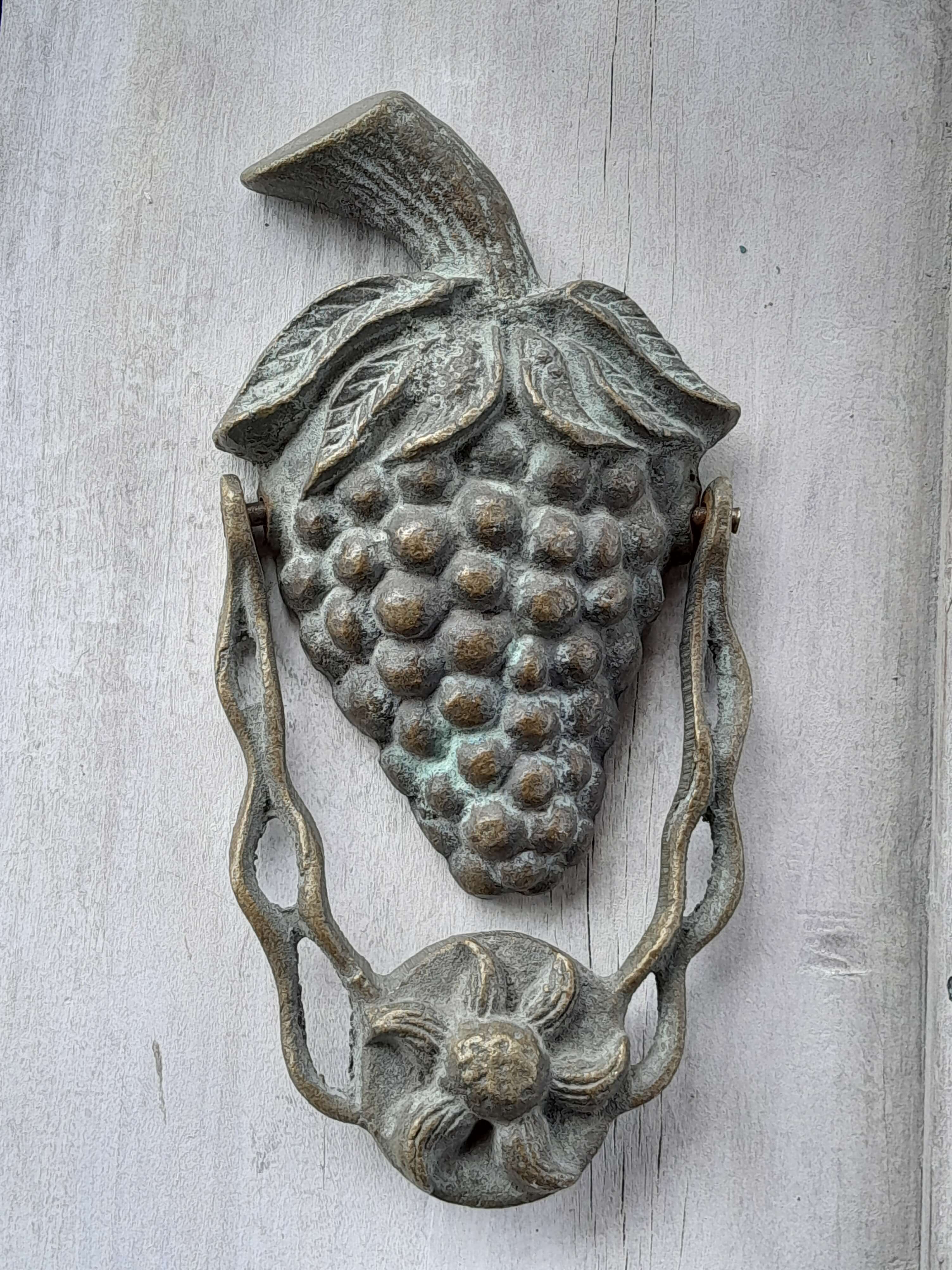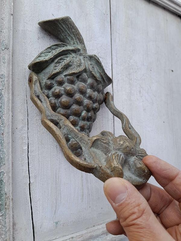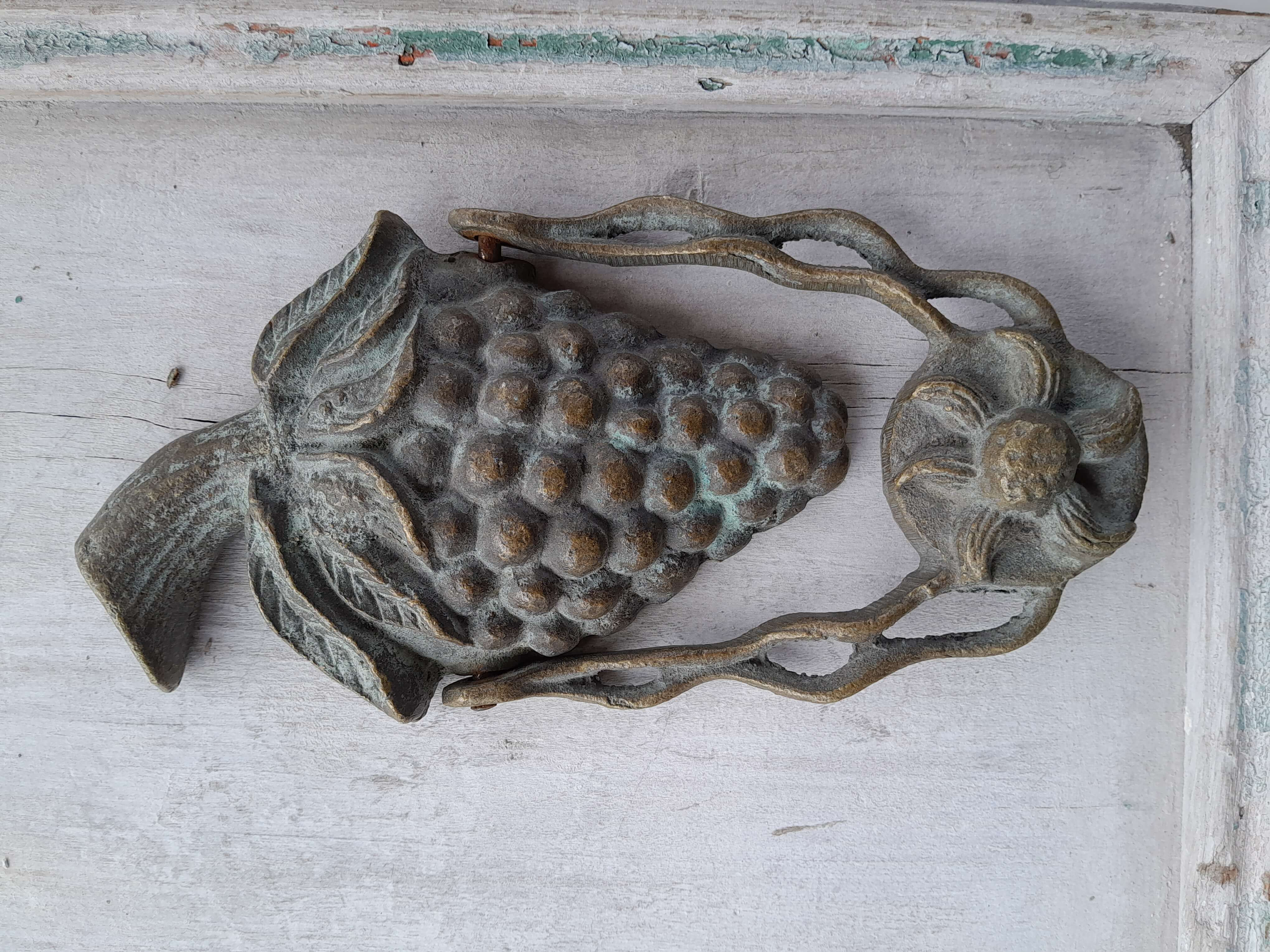 Aldaba de fruta artesanal en bronce fundido, elaborada recientemente con apariencia de antigua. Se ha patinado dándole un acabado envejecido