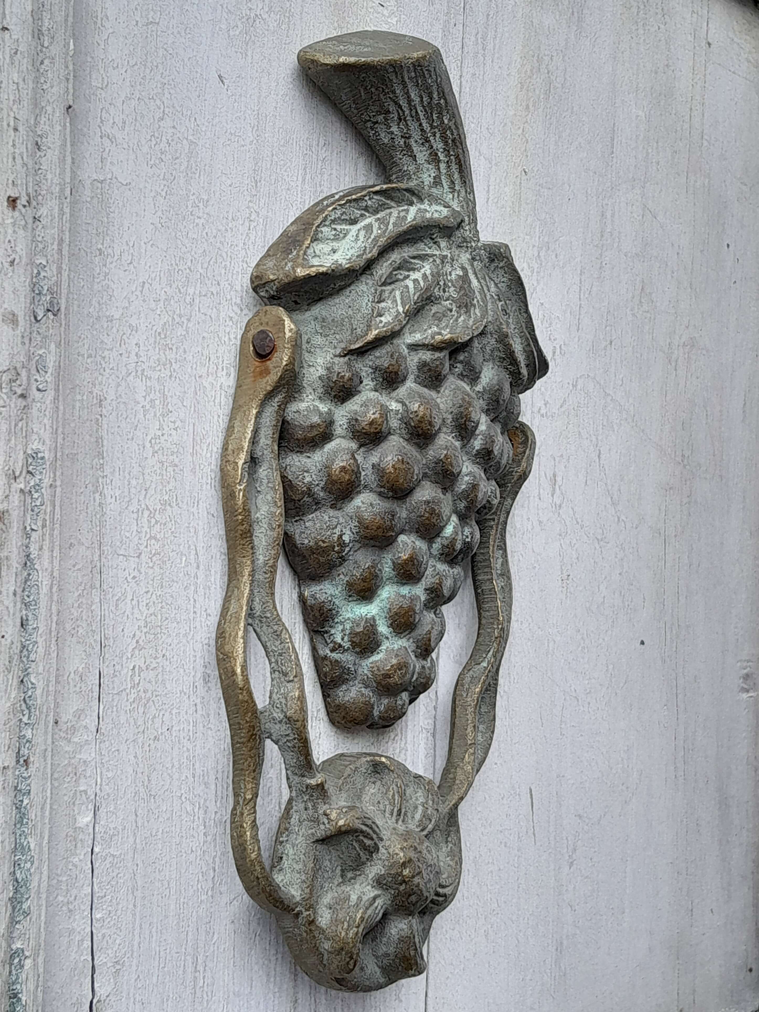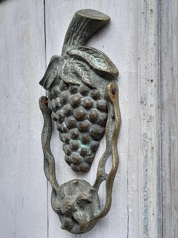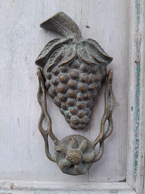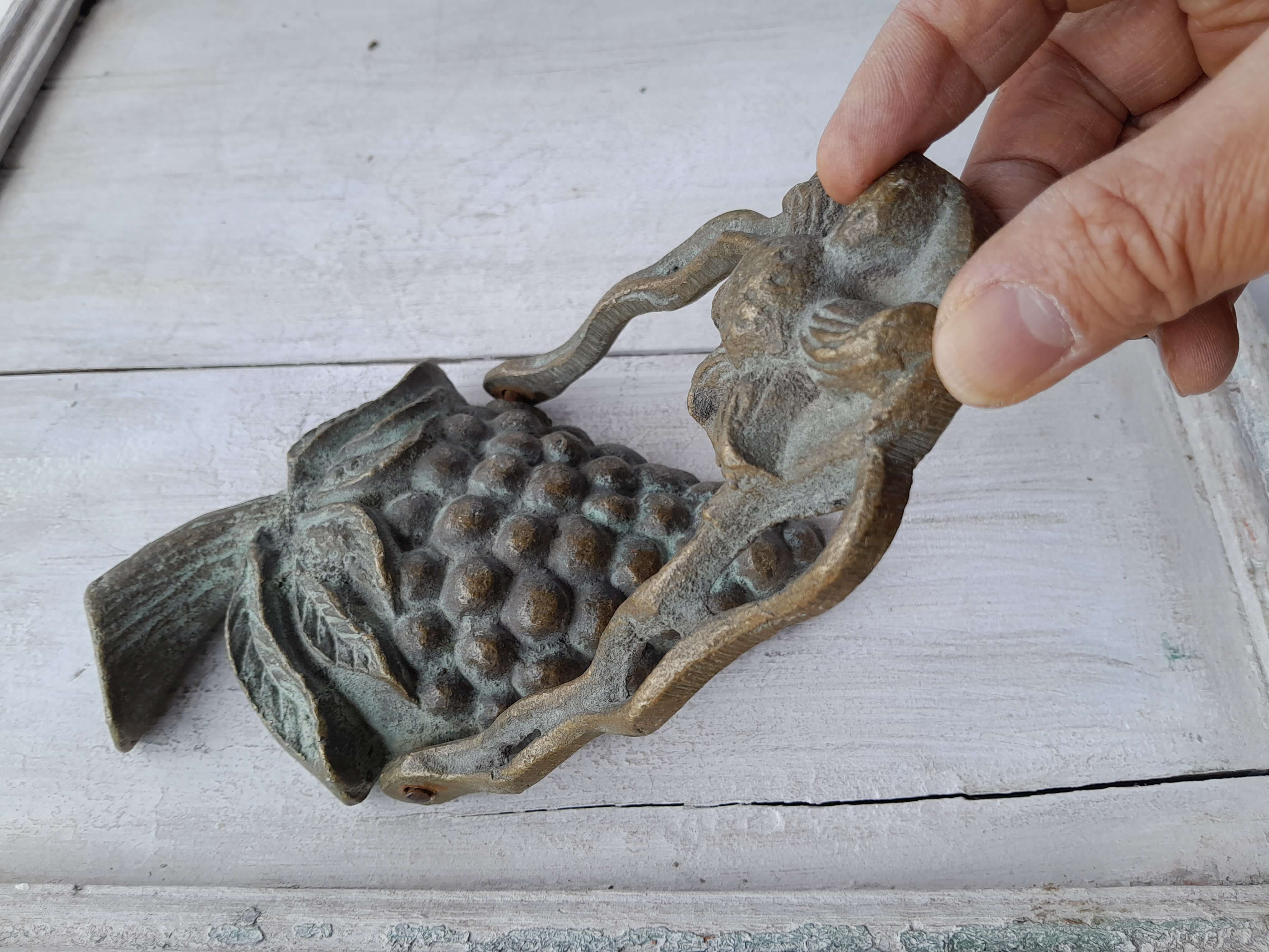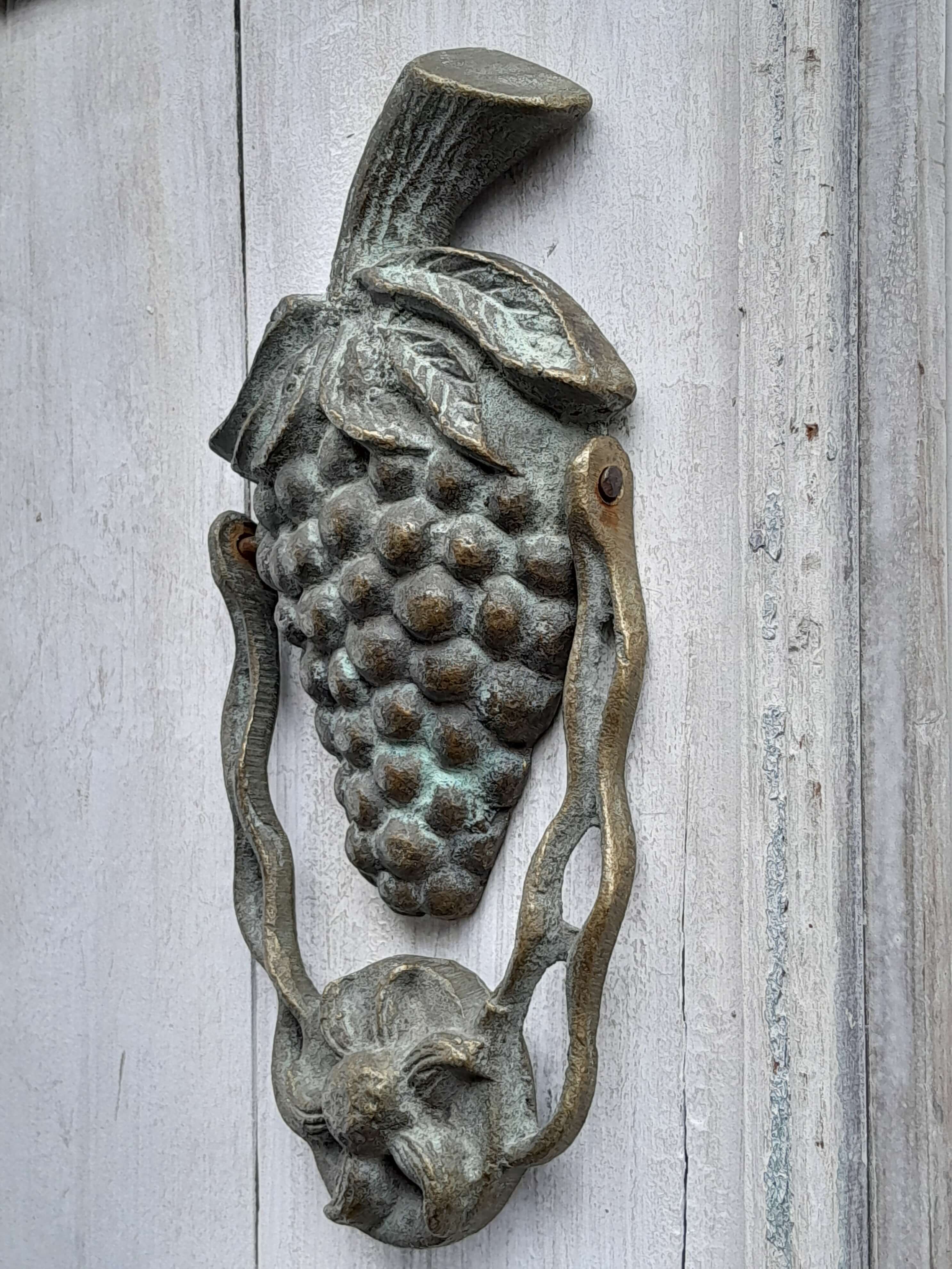 Aldaba de fruta artesanal en bronce fundido, elaborada recientemente con apariencia de antigua. Se ha patinado dándole un acabado envejecido