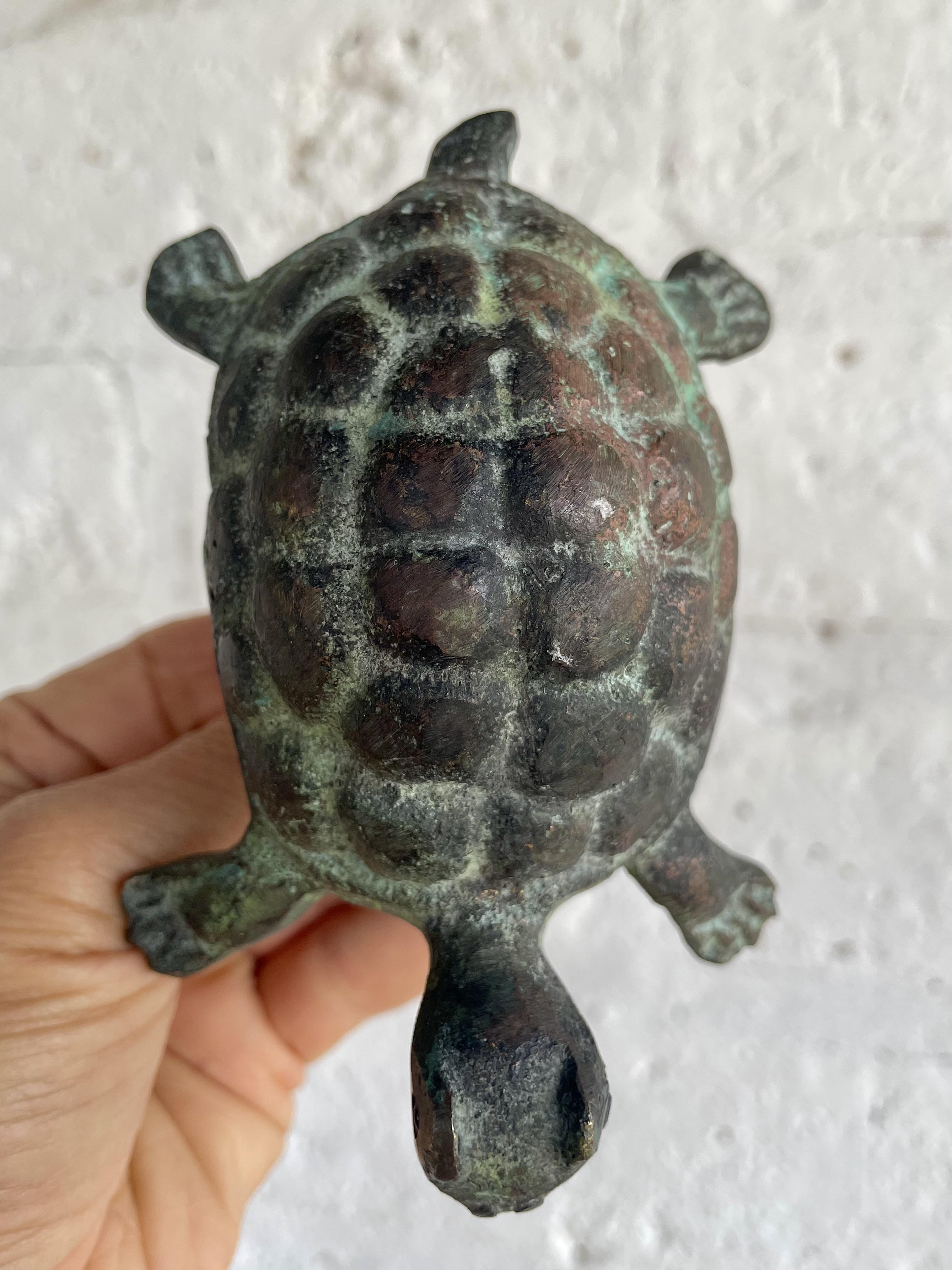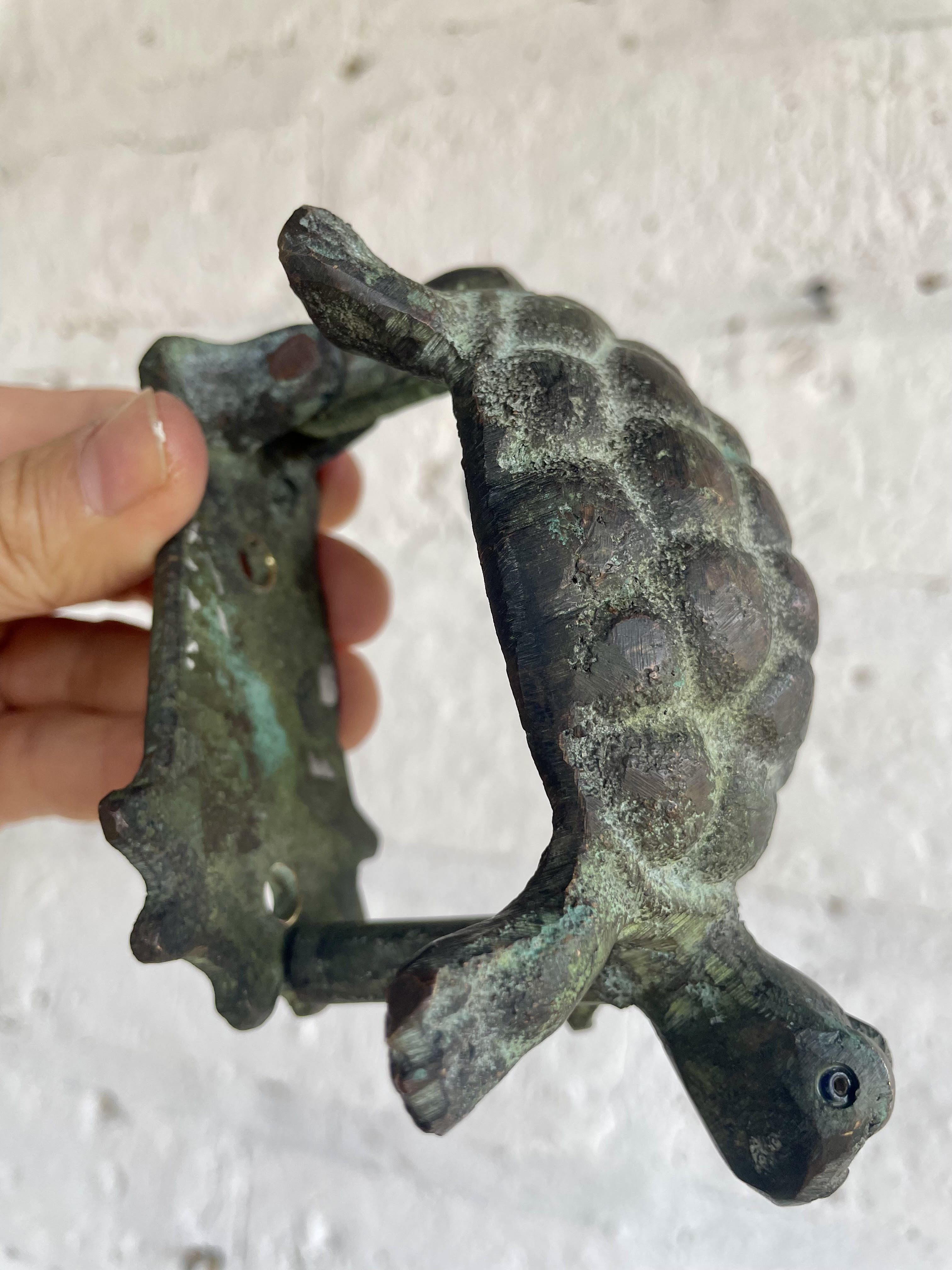 Golpeador de puerta artesanal de bronce con forma de tortuga patinado.