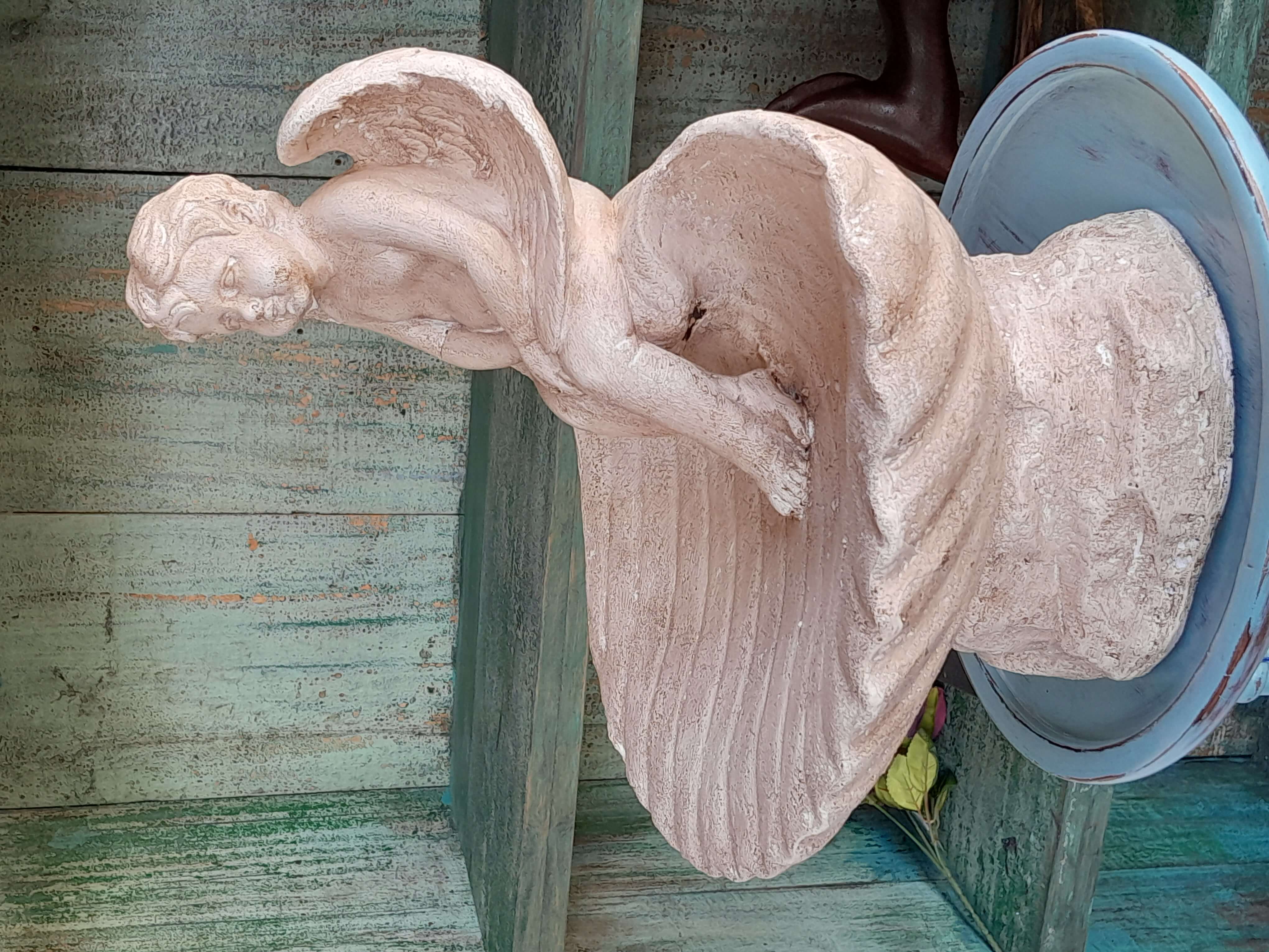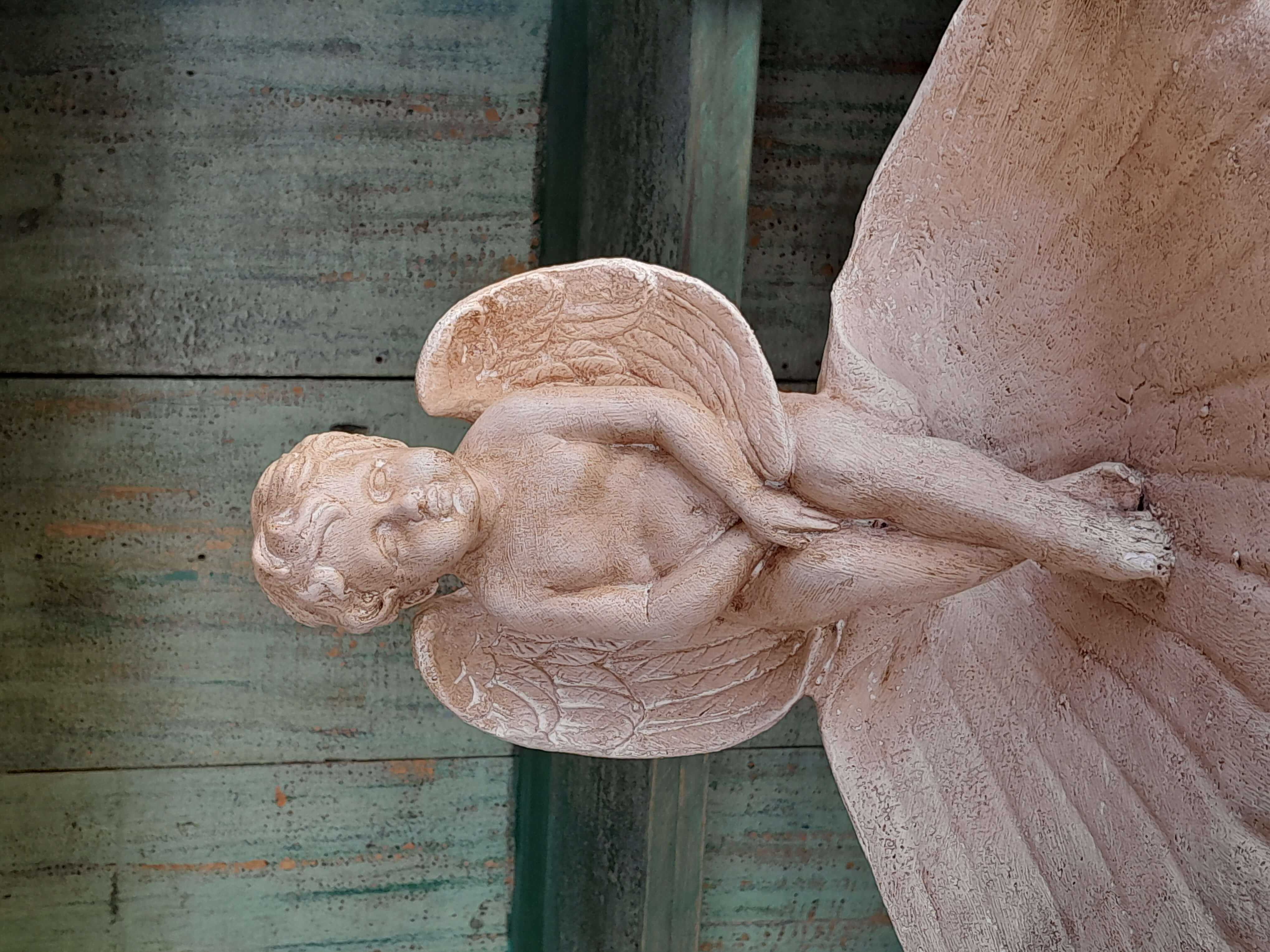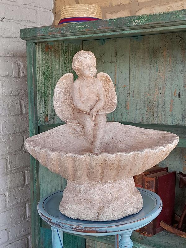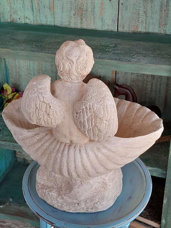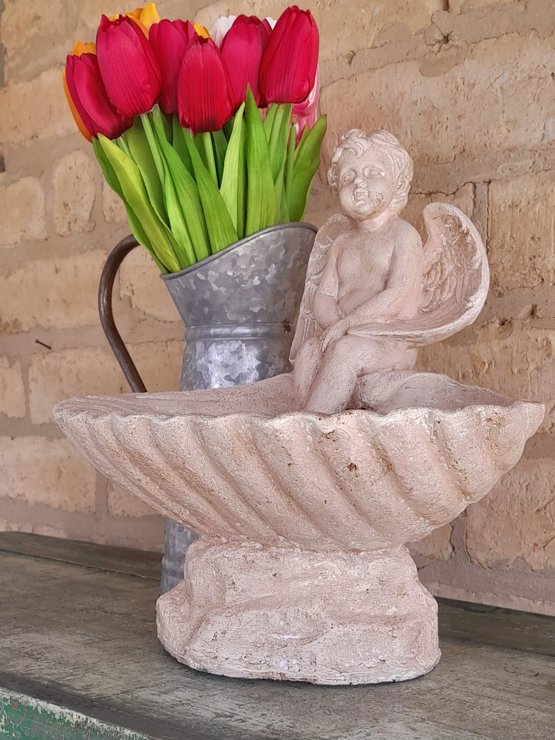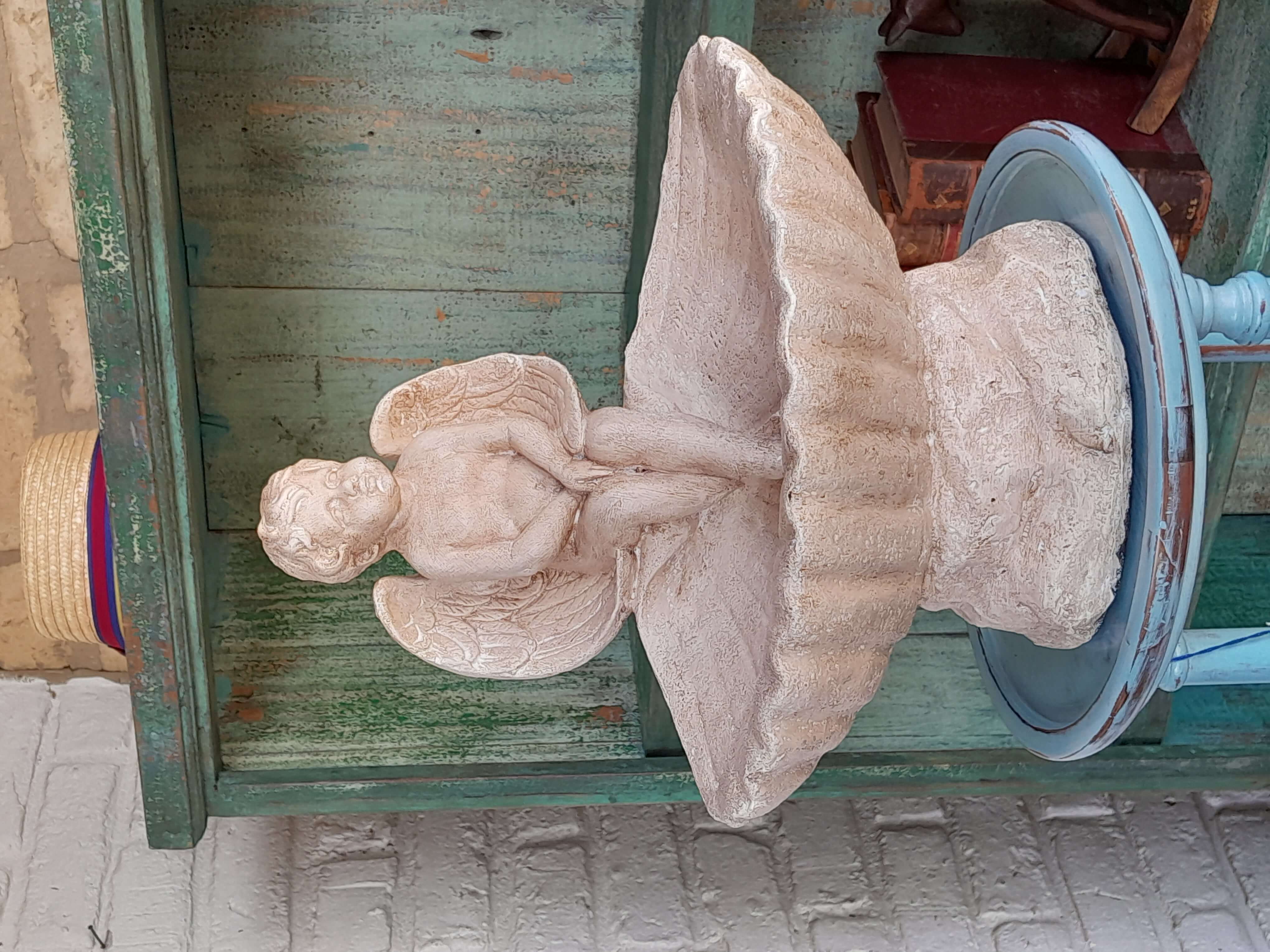 Figura de ángel sentado sobre una concha en resina resistente para jardines.