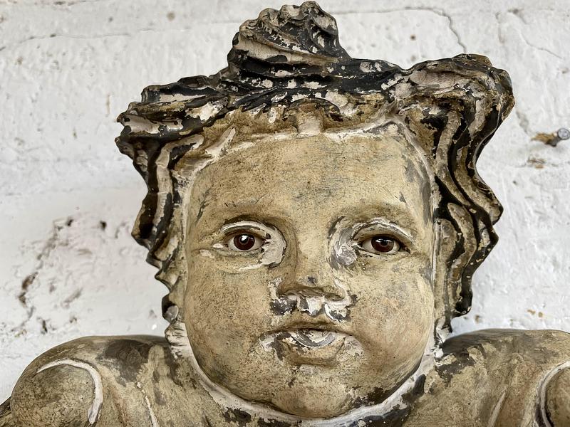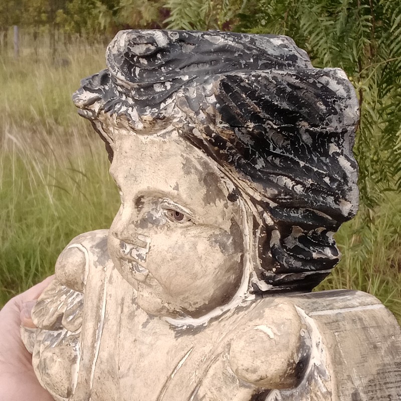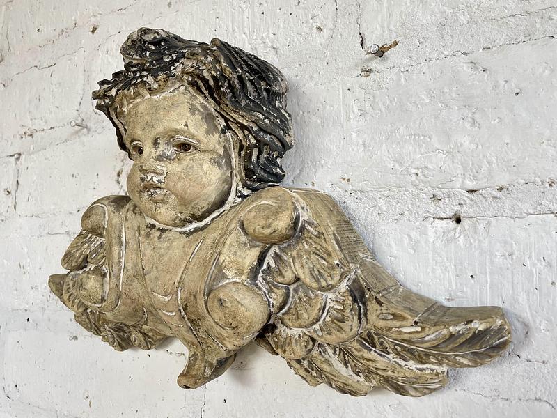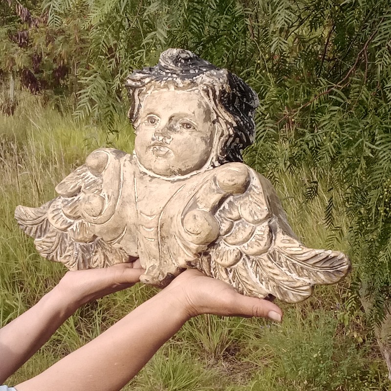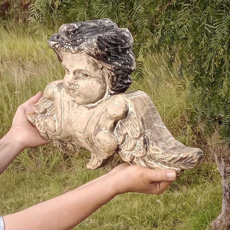 Querubín francés del S XIX con ojos de cristal y madera tallada artesanalmente. Este querubín fue traído, por su anterior dueño, procedente de una casa de la hermosa comuna de Puy-En-Velay en el departamento de Alto Loira en el centro-sur de Francia. La zona es conocida por sus magníficas catedrales y estatuas. Posiblemente esta figura formaba parte originalmente de una pieza arquitectónica mayor o incluso haber sido parte de un púlpito.