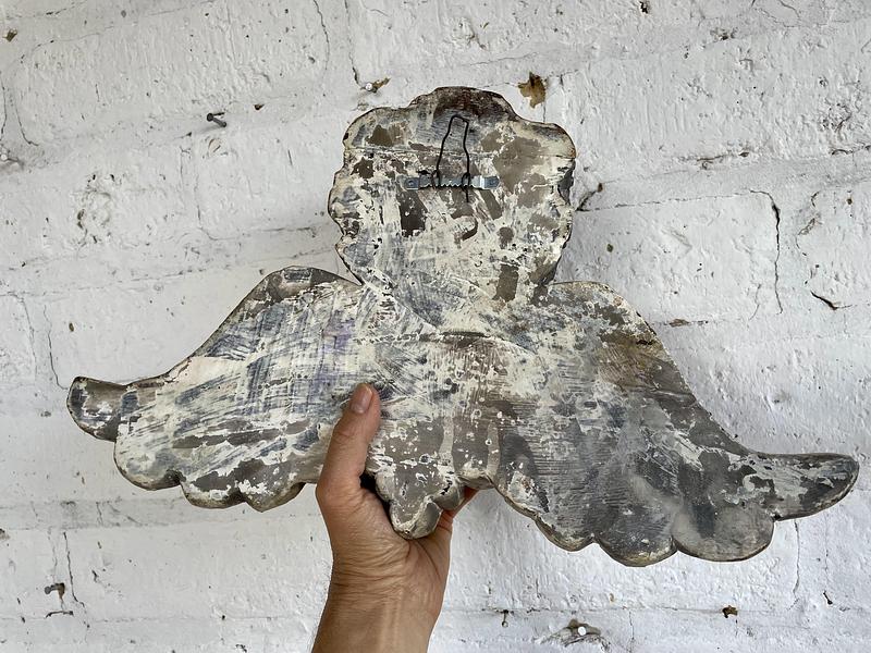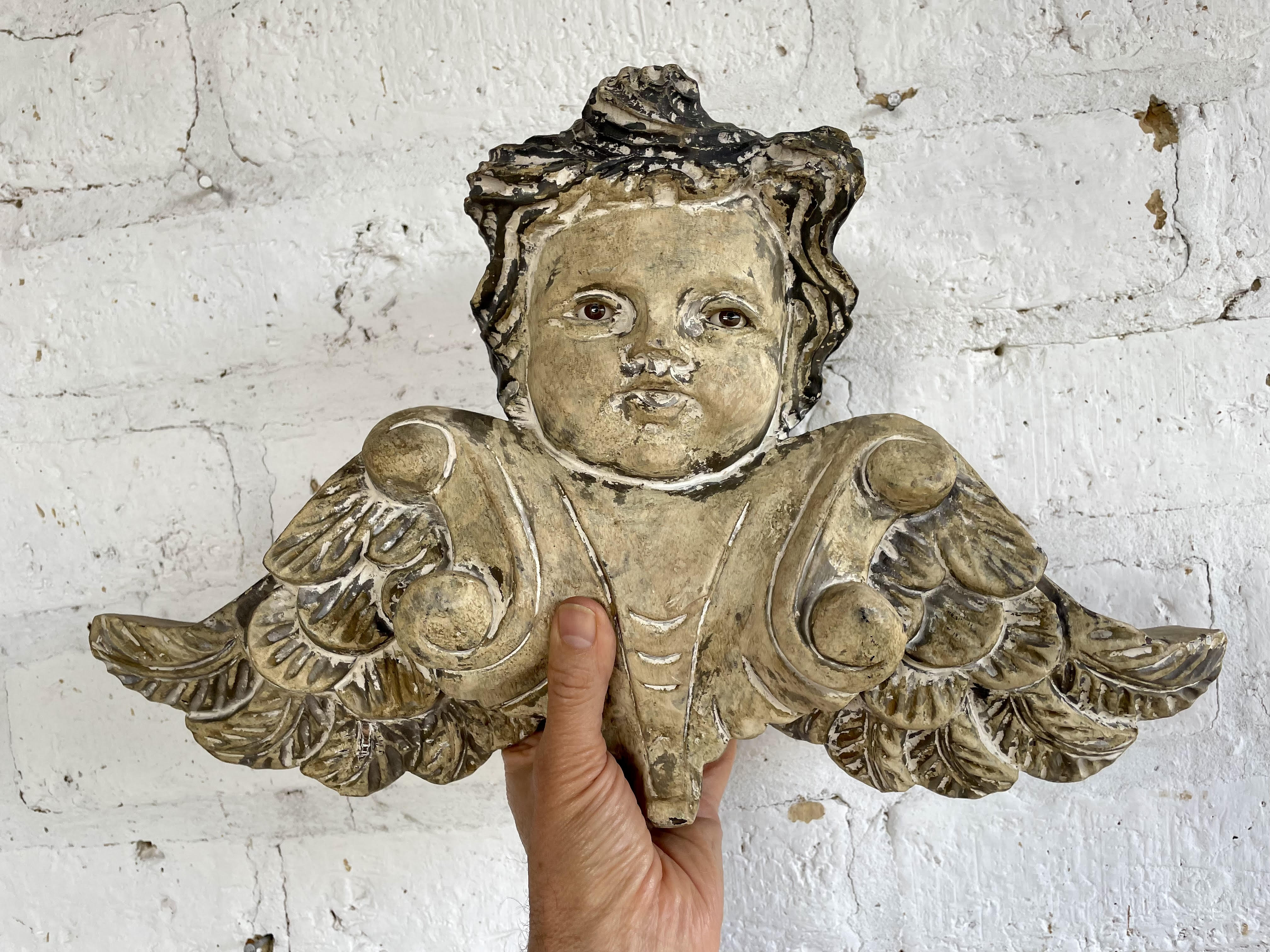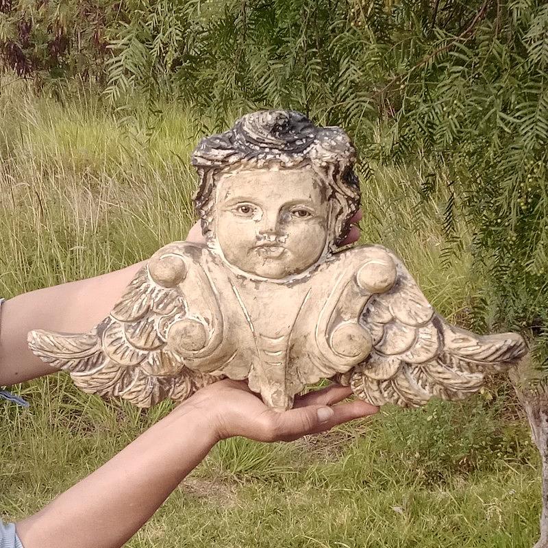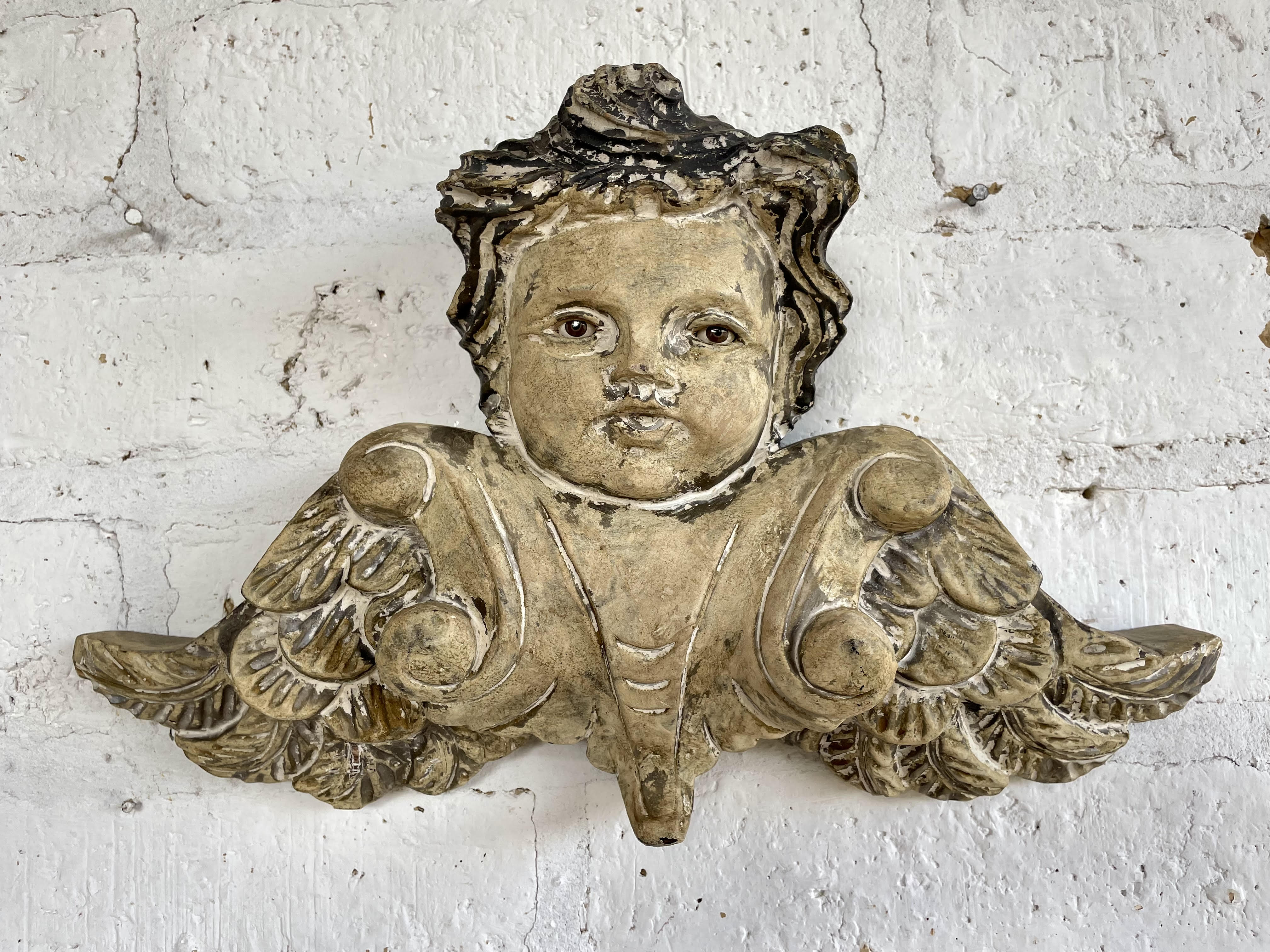 Querubín francés del S XIX con ojos de cristal y madera tallada artesanalmente. Este querubín fue traído, por su anterior dueño, procedente de una casa de la hermosa comuna de Puy-En-Velay en el departamento de Alto Loira en el centro-sur de Francia. La zona es conocida por sus magníficas catedrales y estatuas. Posiblemente esta figura formaba parte originalmente de una pieza arquitectónica mayor o incluso haber sido parte de un púlpito.