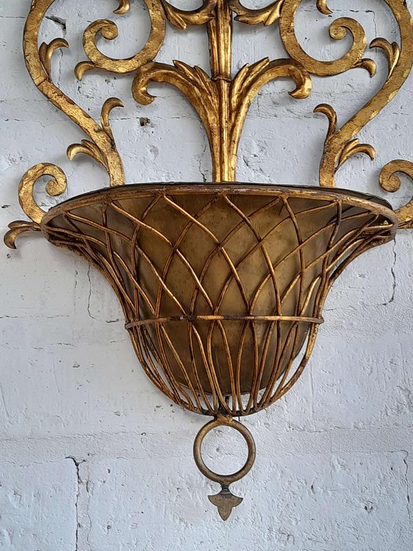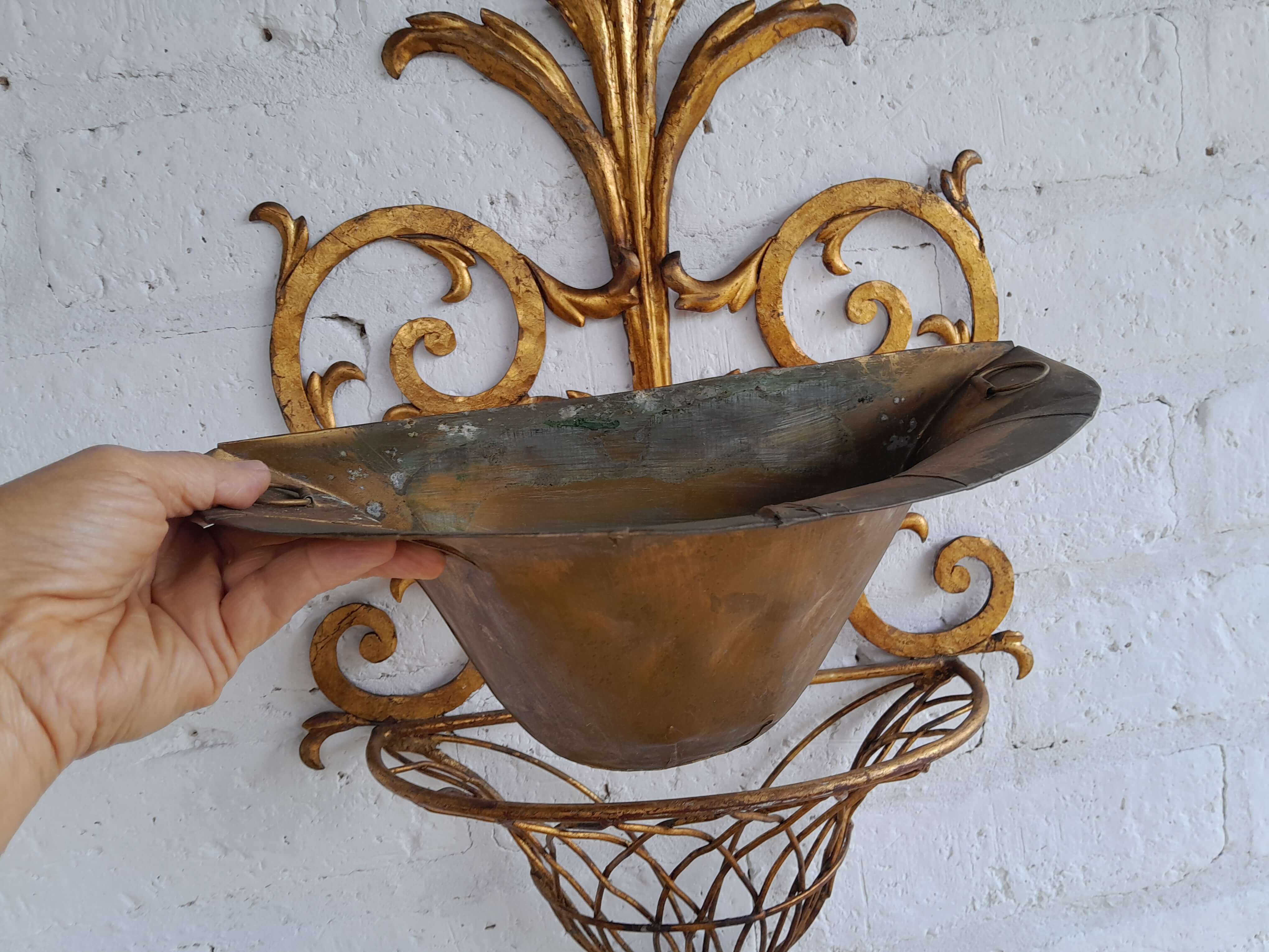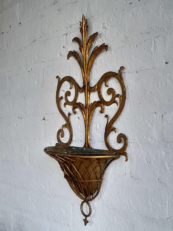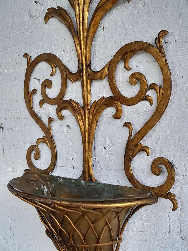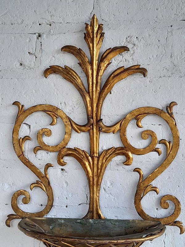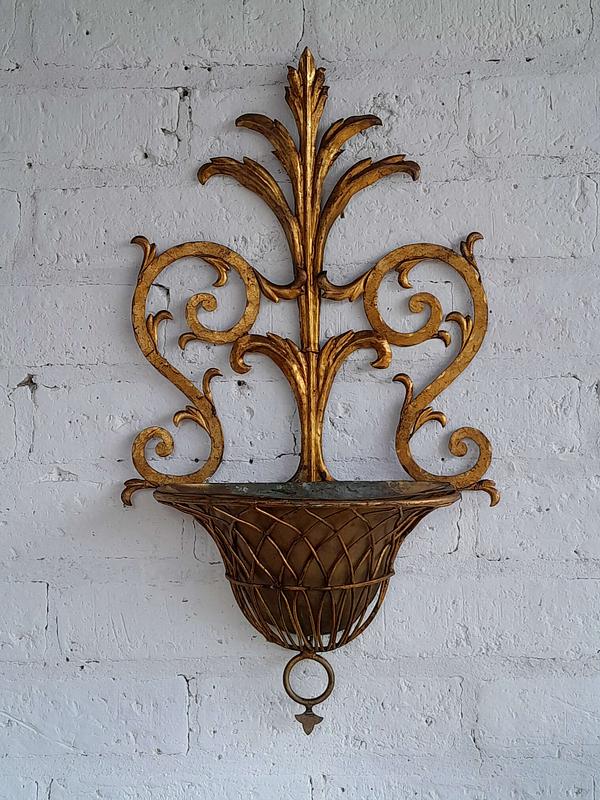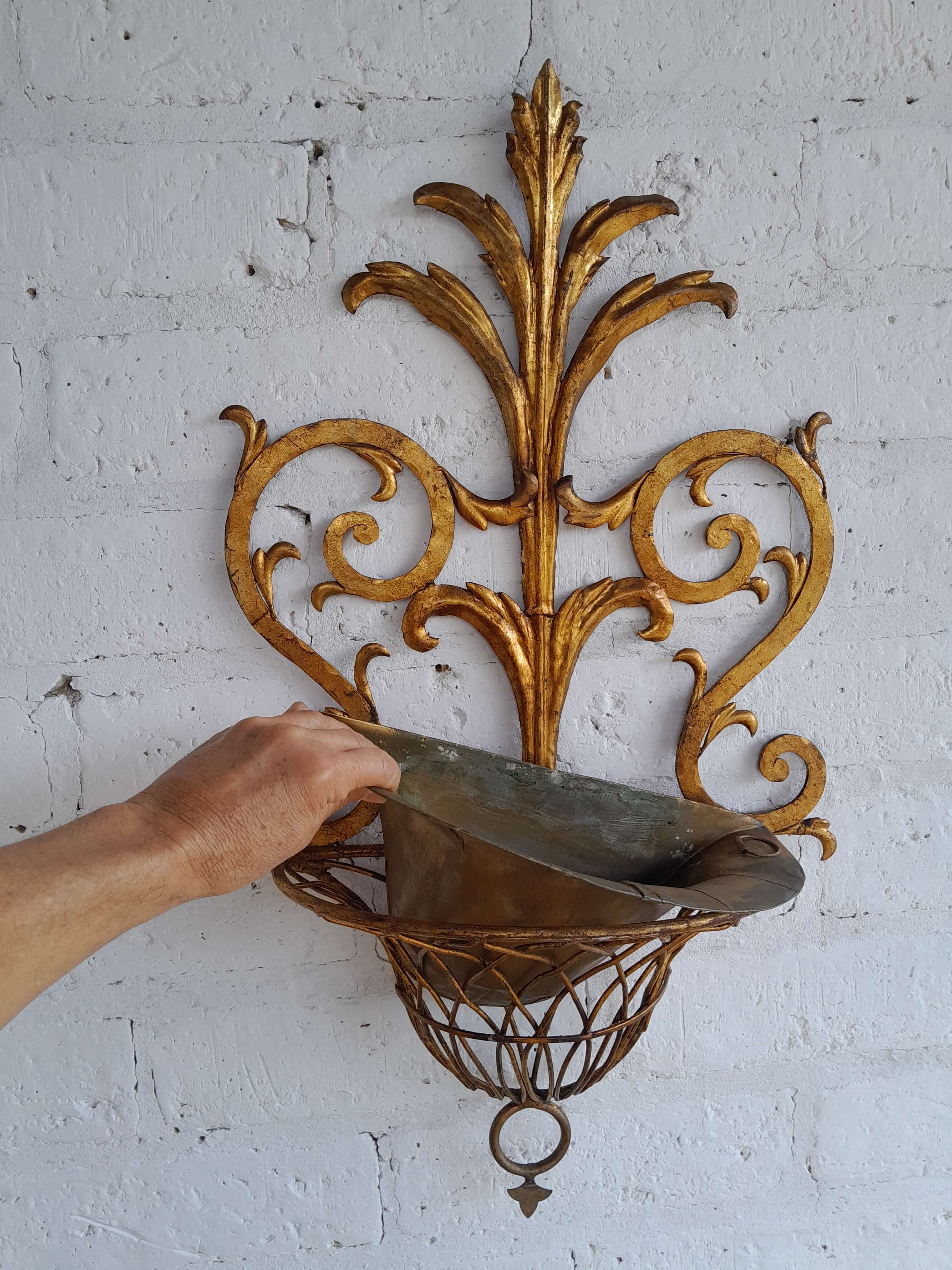 Soporte de pared en lámina metálica gruesa decorada en tonos dorados, artesanía florentina de los años sesenta, la base tiene un recipiente removible. Tiene desgastes en la pintura.