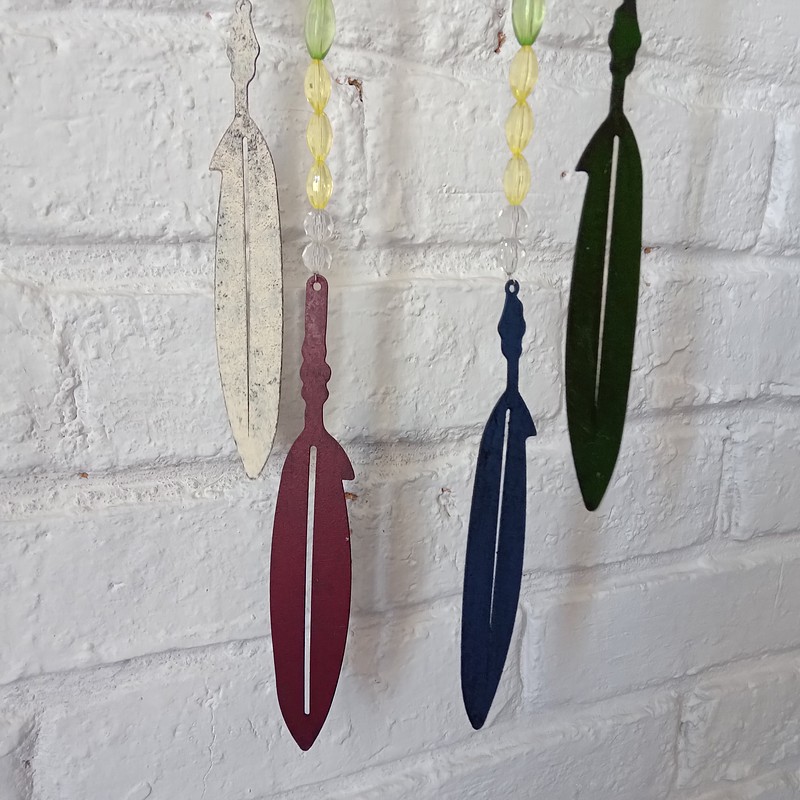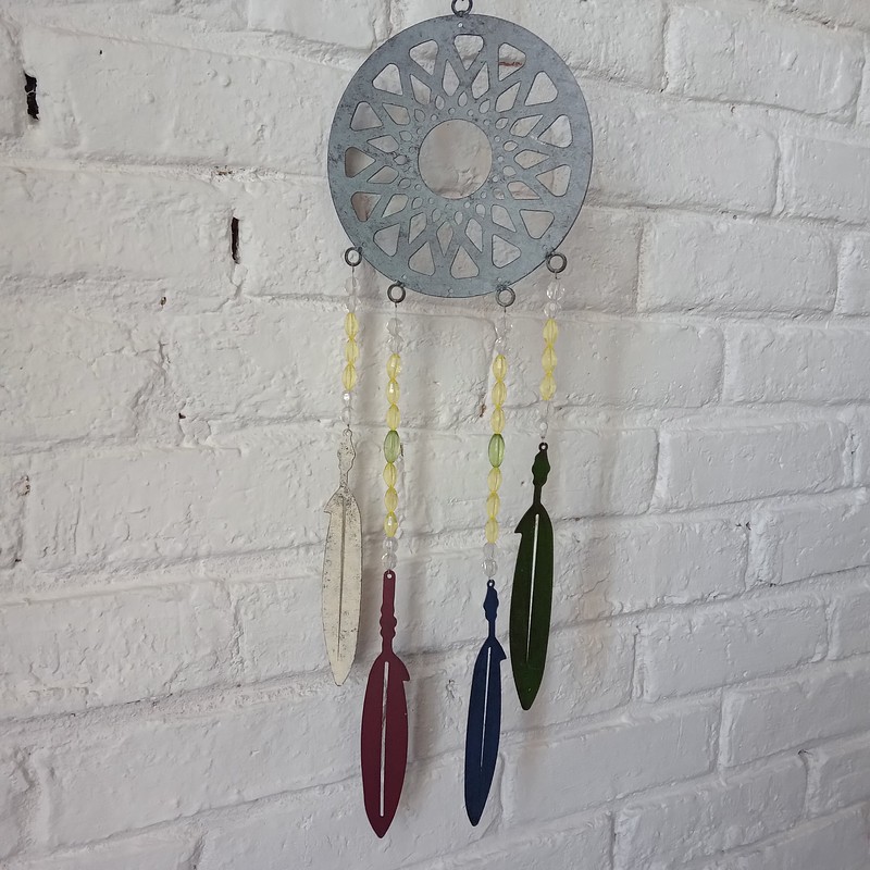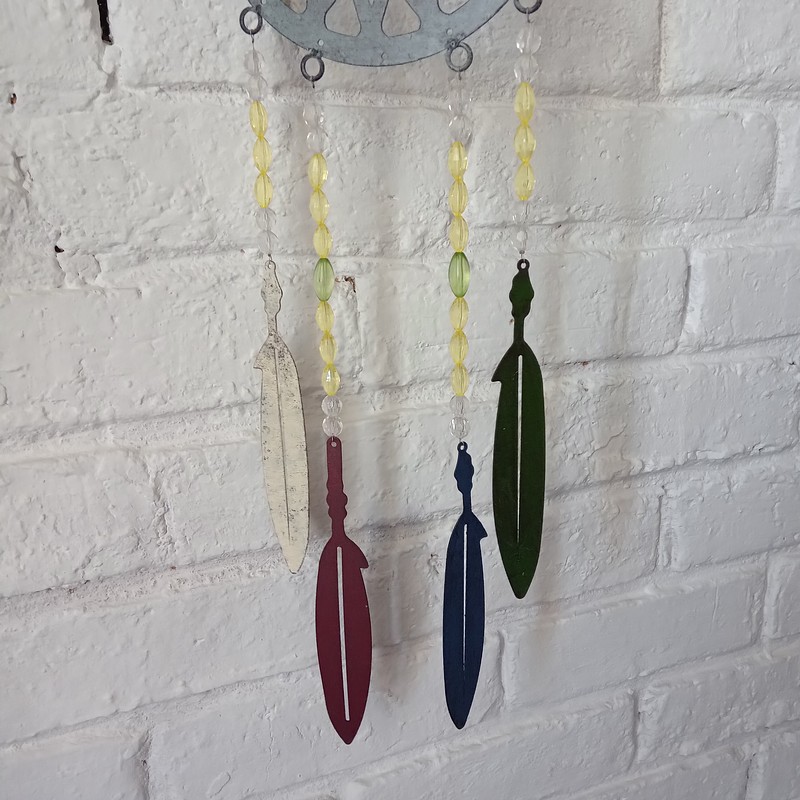 Atrapasueño metálico decorado con pintura desgastada, plunas metálicas y chaquiras.
