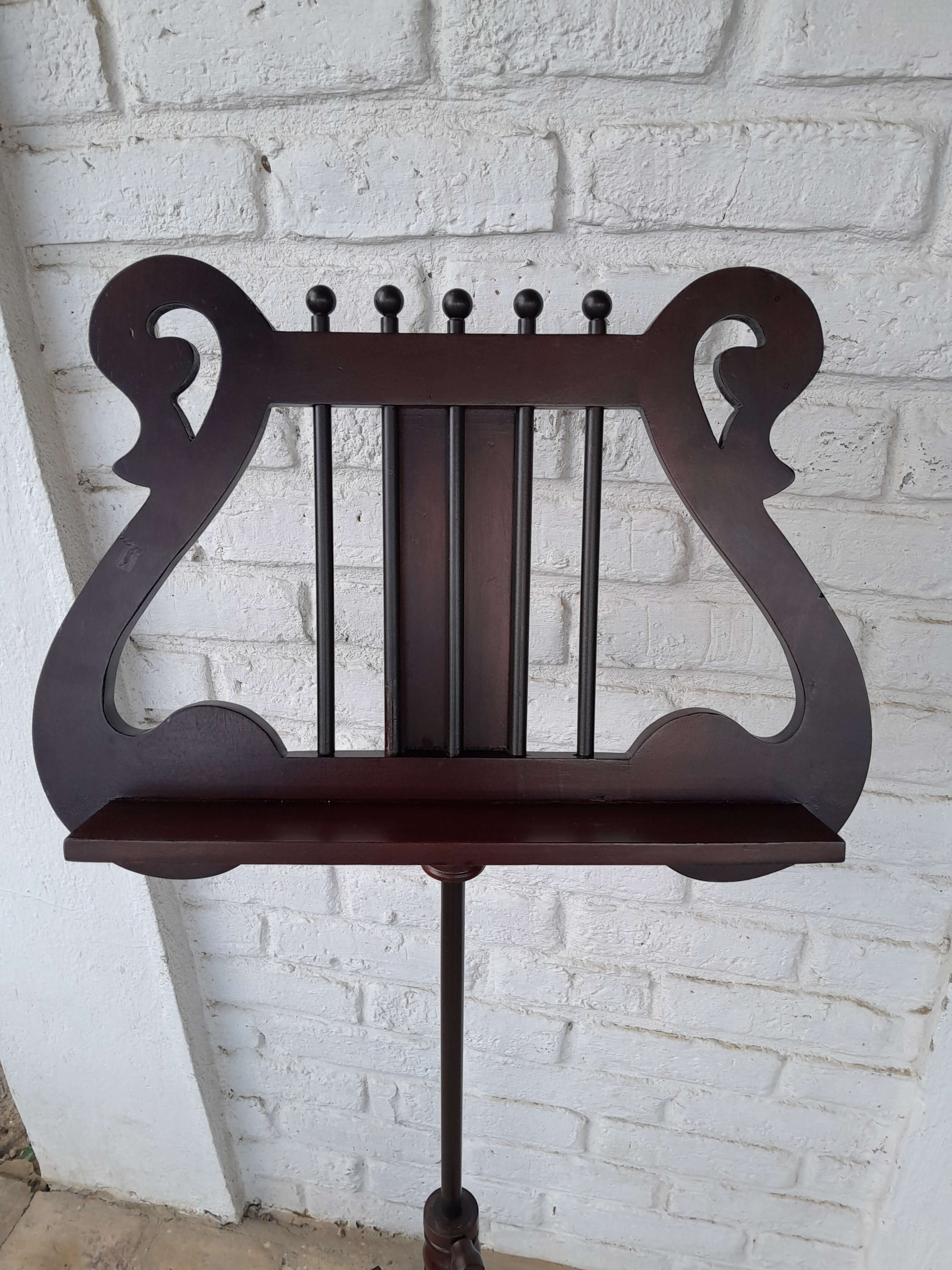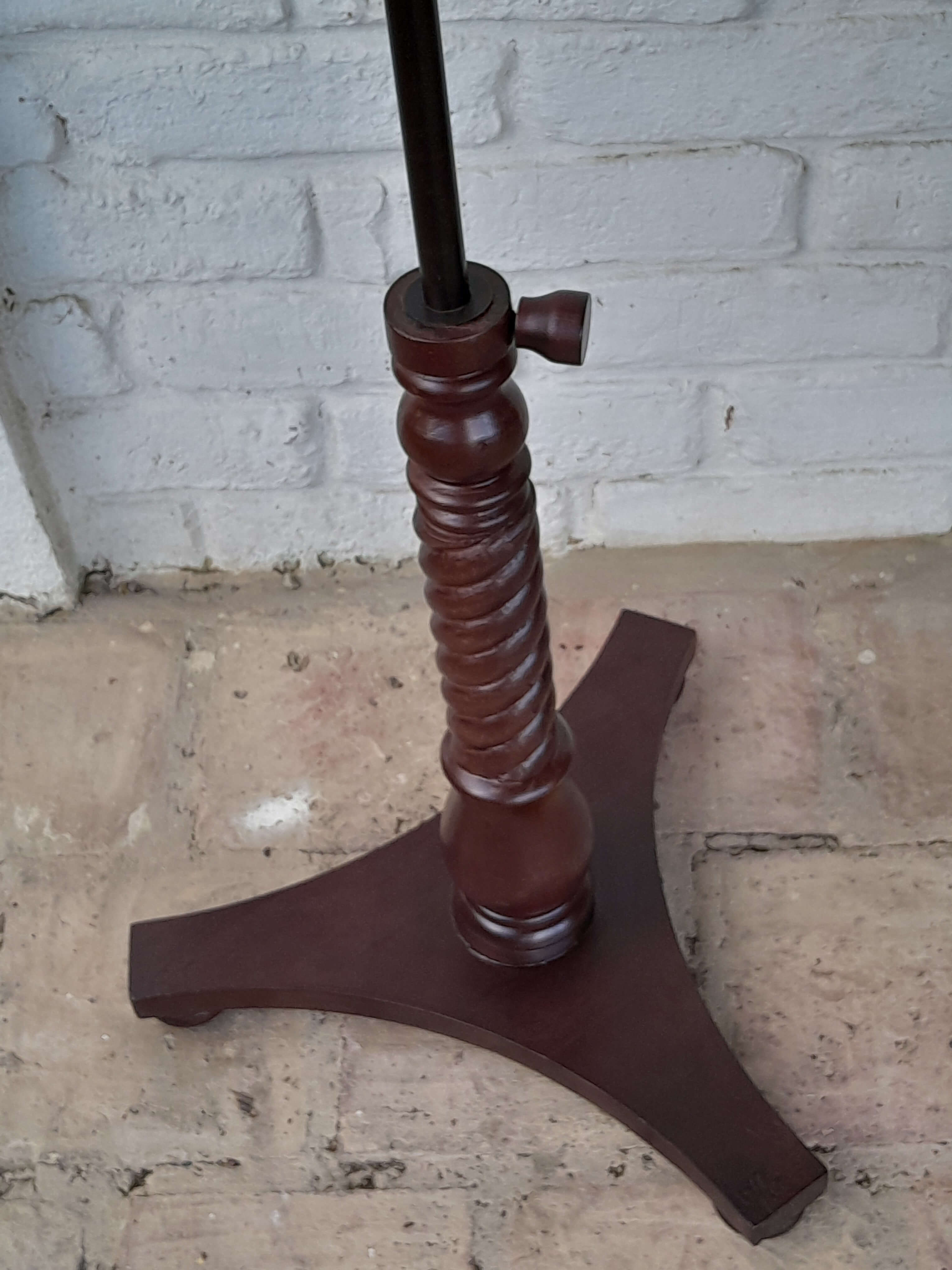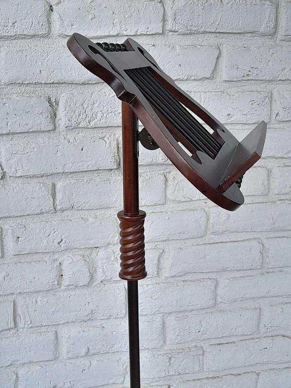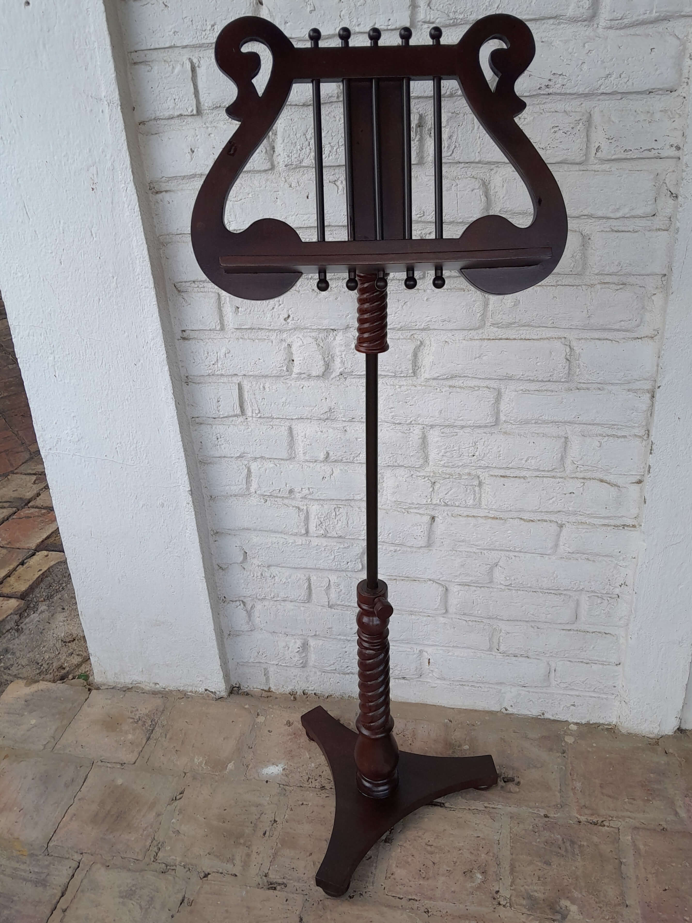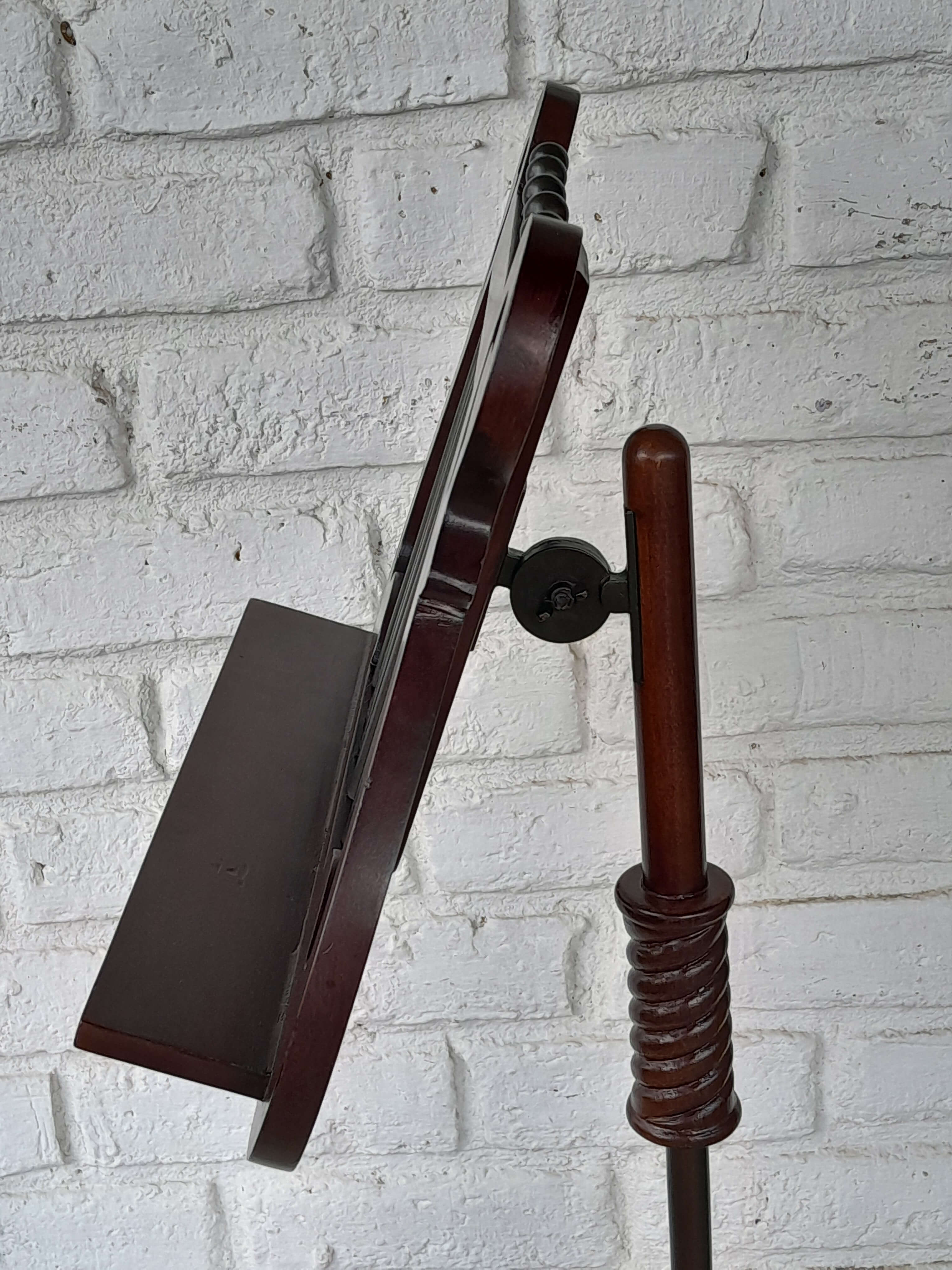 Atril de madera ajustable, tiene un herraje metálico que permite graduar la inclinación. La columna en madera tallada tiene un soporte metálico interno y un tornillo que permite ajustar la altura.