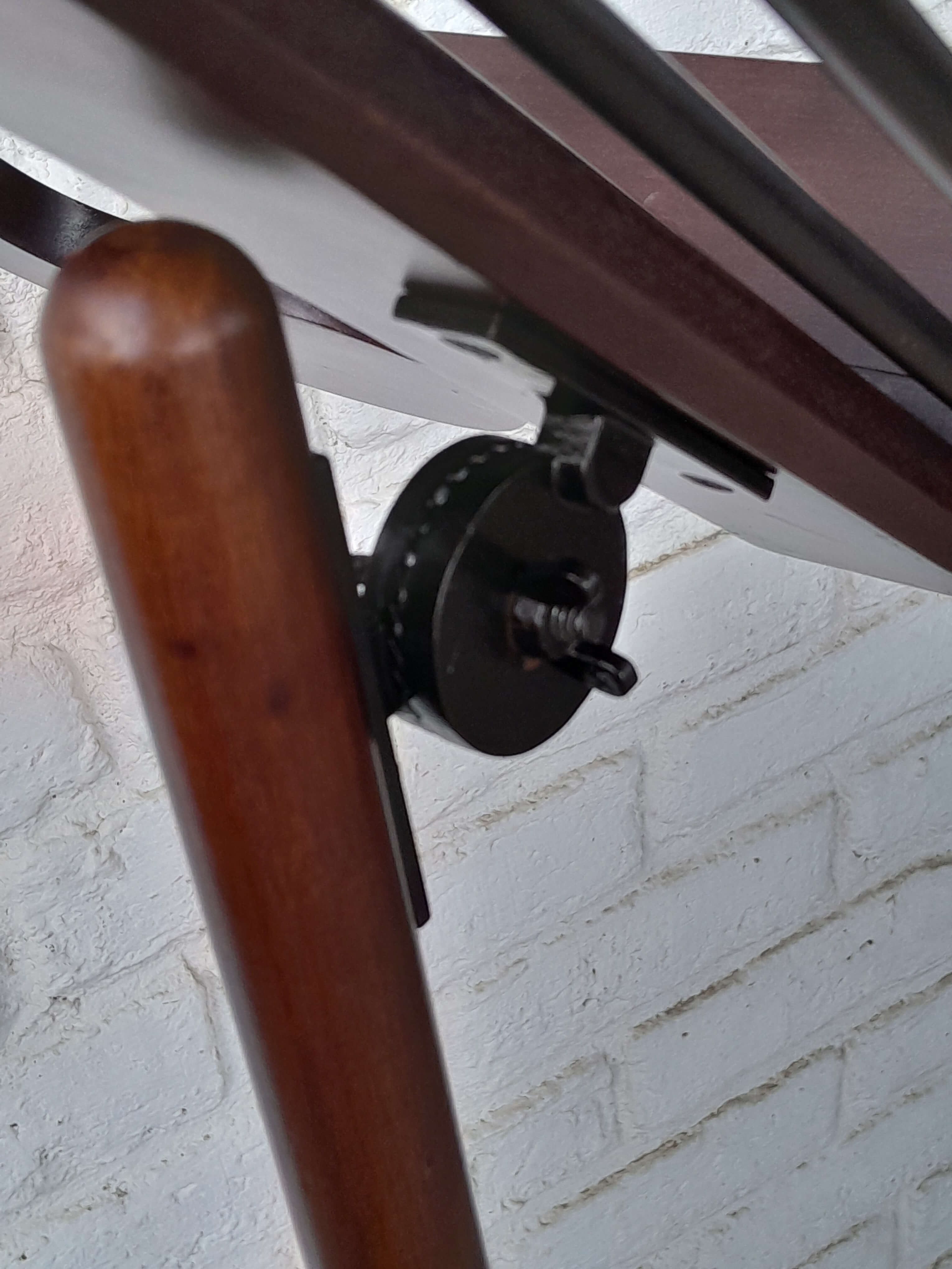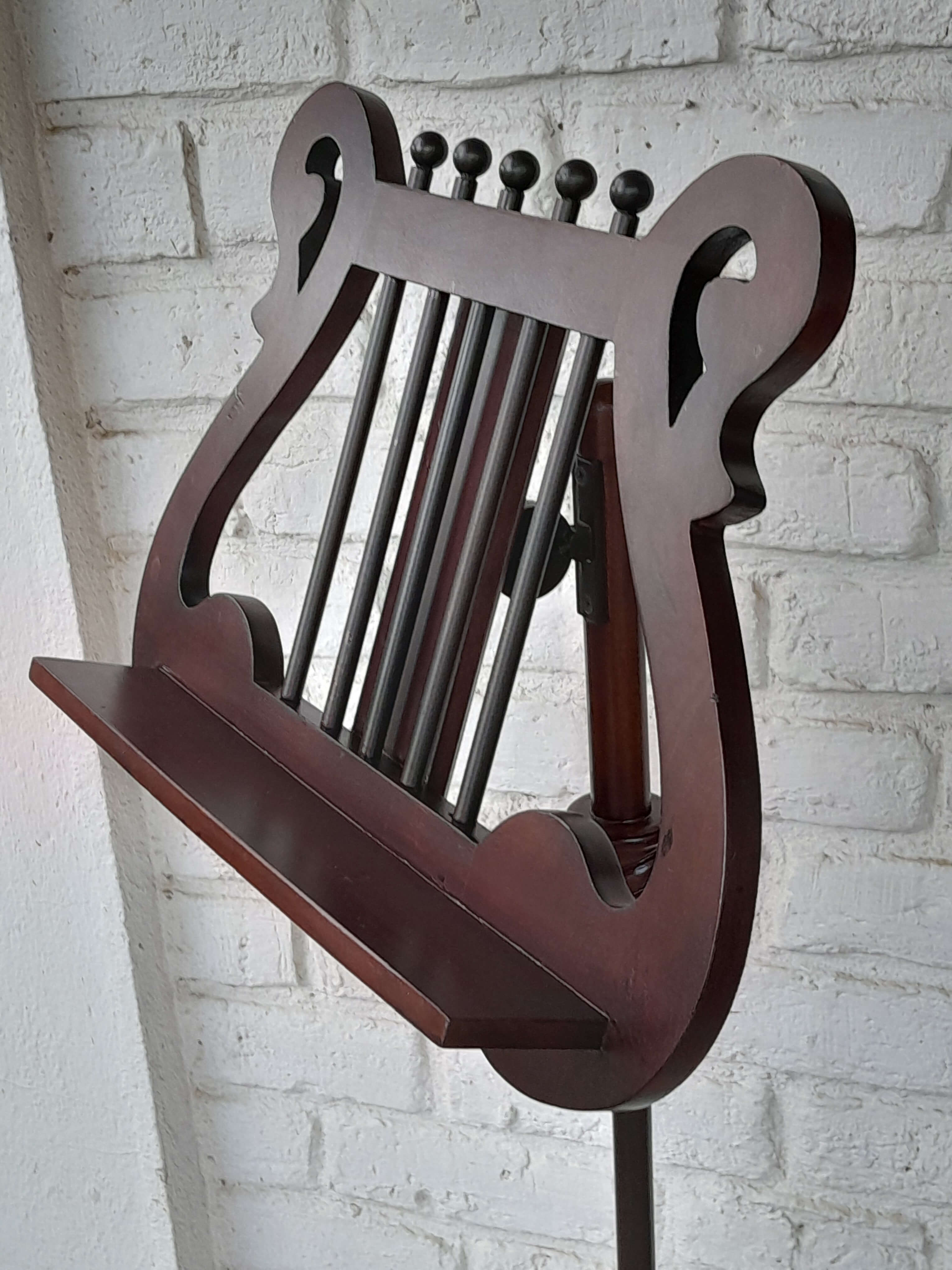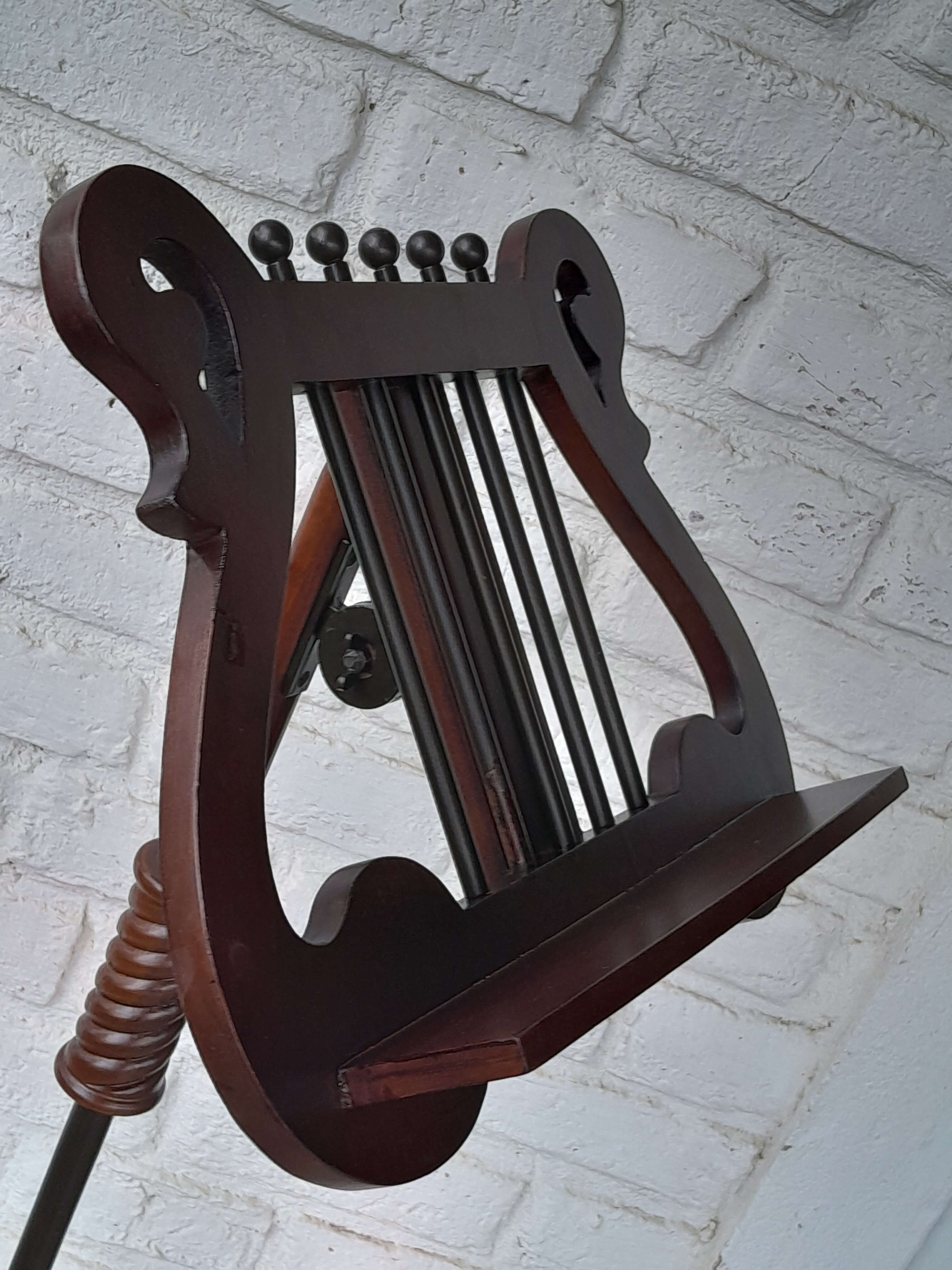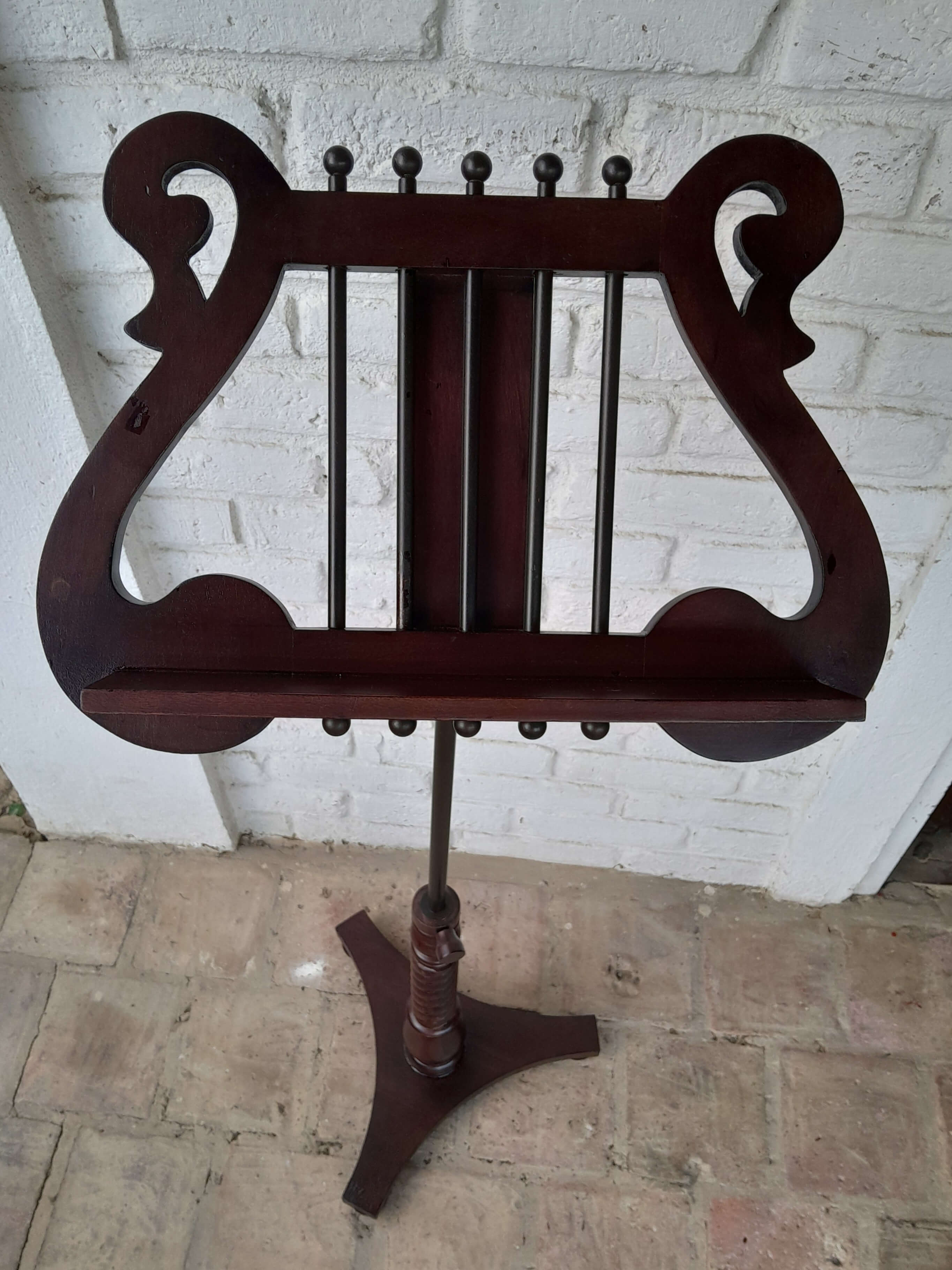 Atril de madera ajustable, tiene un herraje metálico que permite graduar la inclinación. La columna en madera tallada tiene un soporte metálico interno y un tornillo que permite ajustar la altura.
