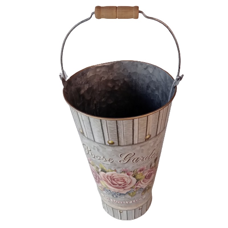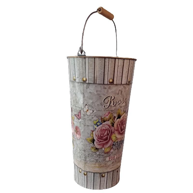 Recipiente metálico decorado con motivos retro. Decoupage.
