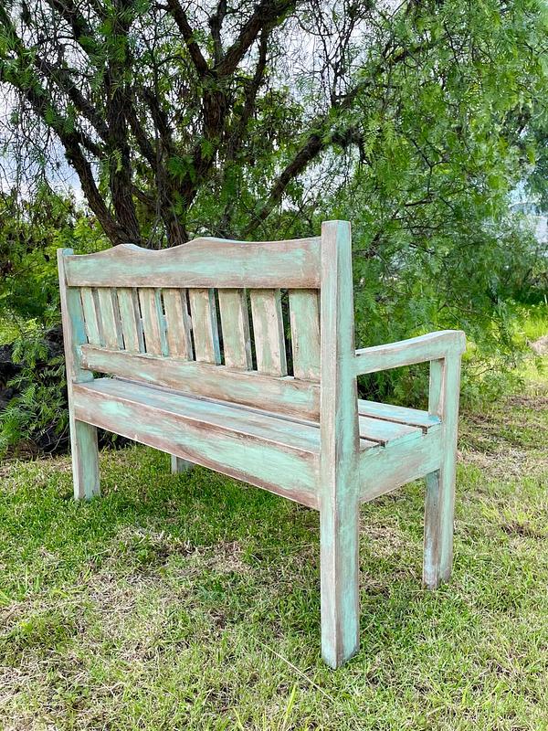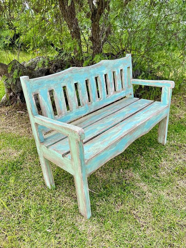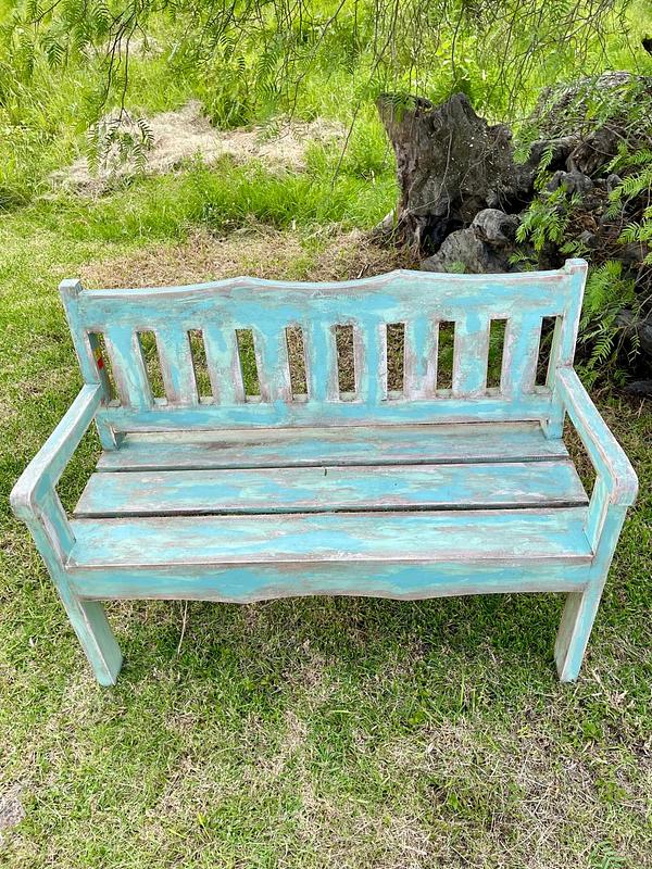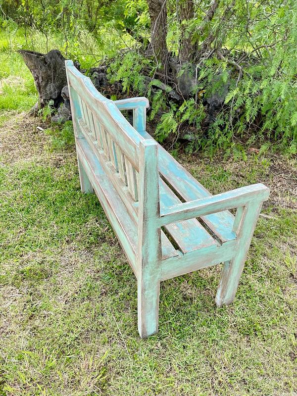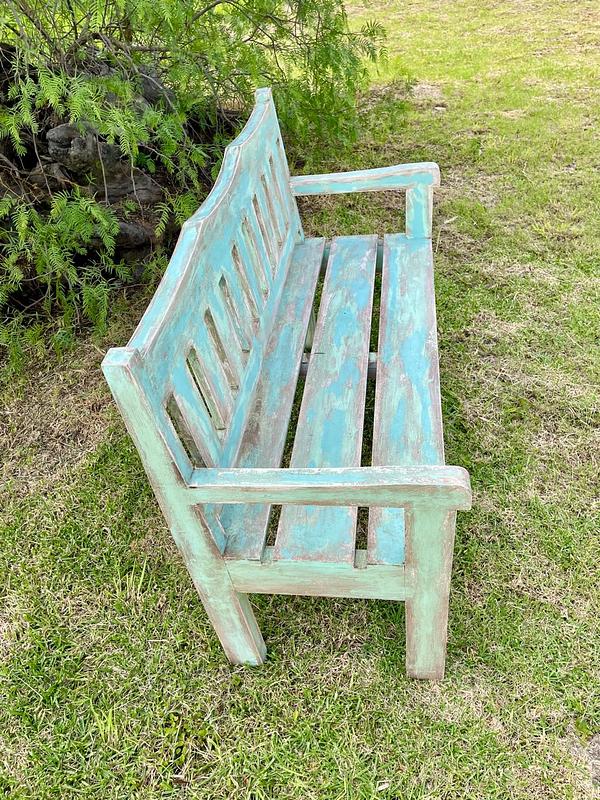 Banca vintage de madera maciza tiene diferentes capas de pintura original recibida a través de los años.