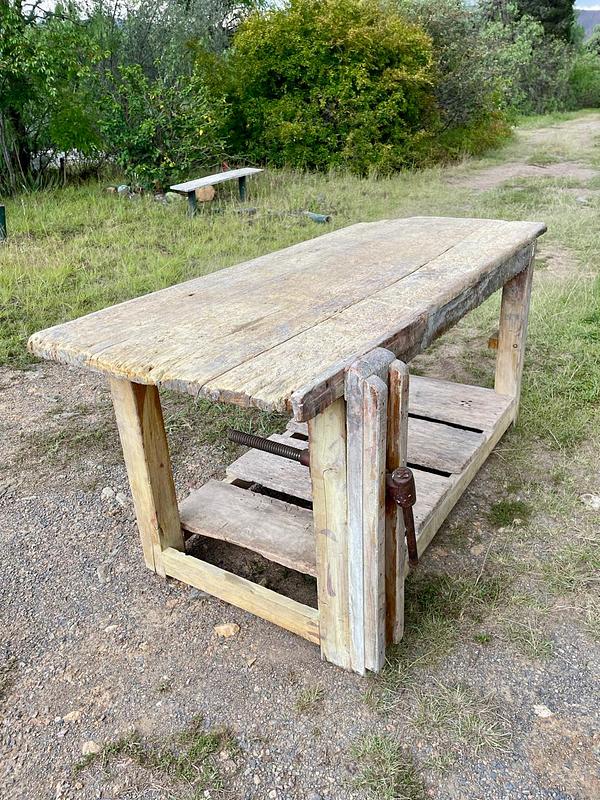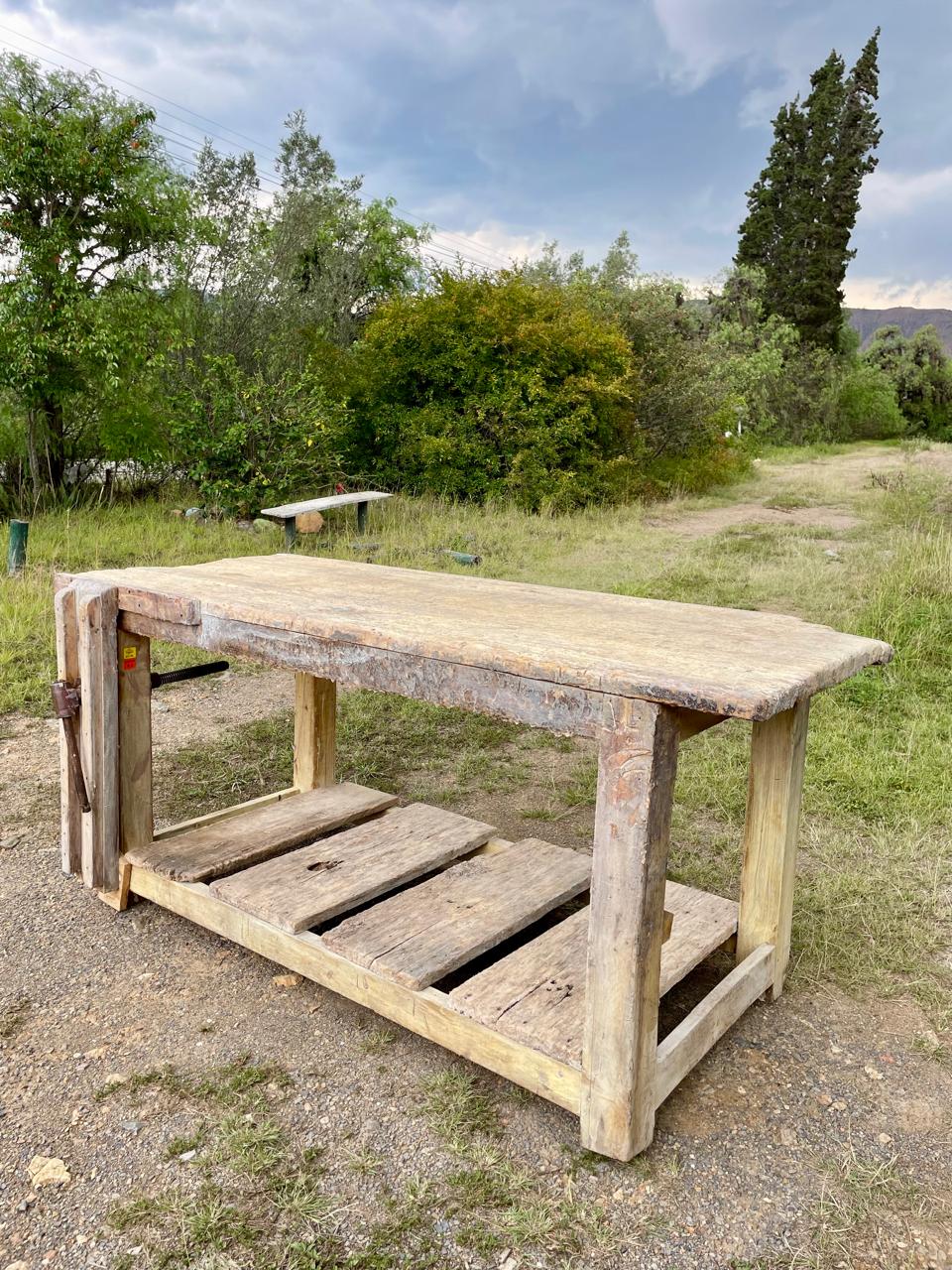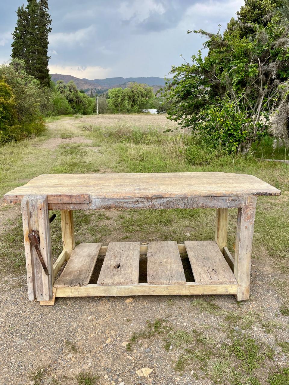 Banco de trabajo de carpintero de mediados del S XX perteneció a un taller ubicado en Sutamarchán en Boyacá. Tiene la prensa de tornillo y los desgastes que muestran las huellas de su pasado: abolladuras, restos de pintura y pegante, desastilladuras, huecos de broca y todos los golpes que le dió el trabajo.