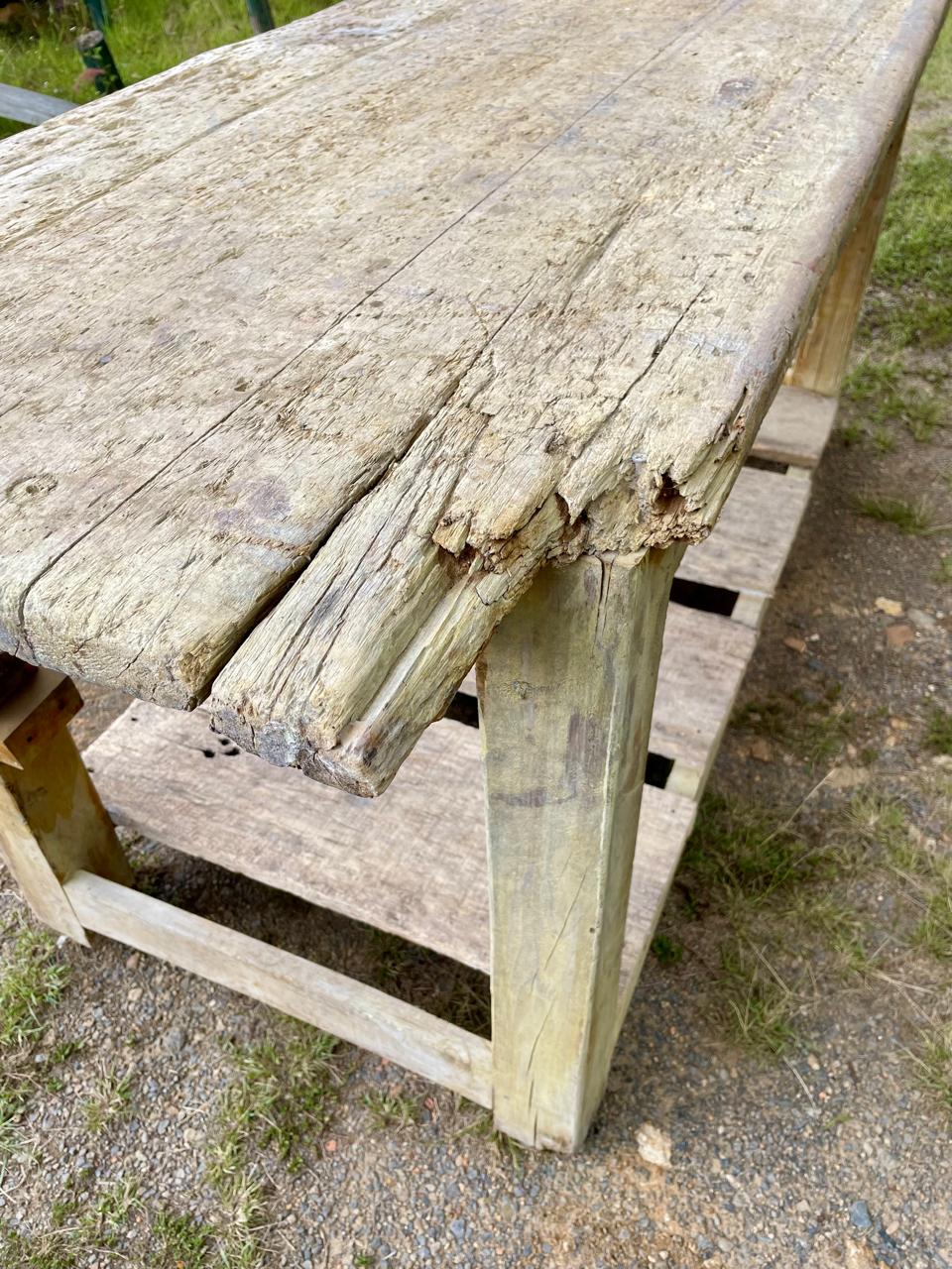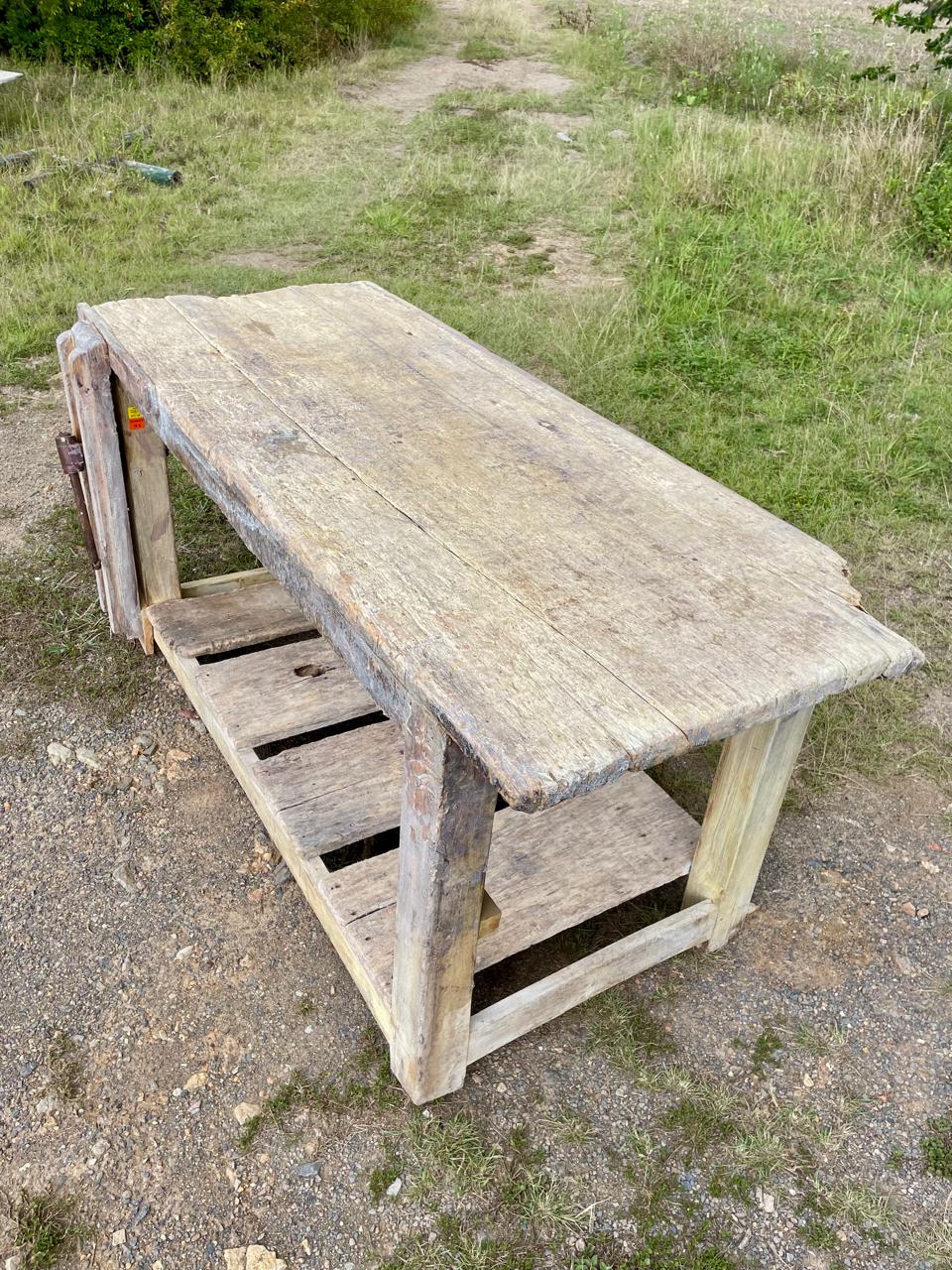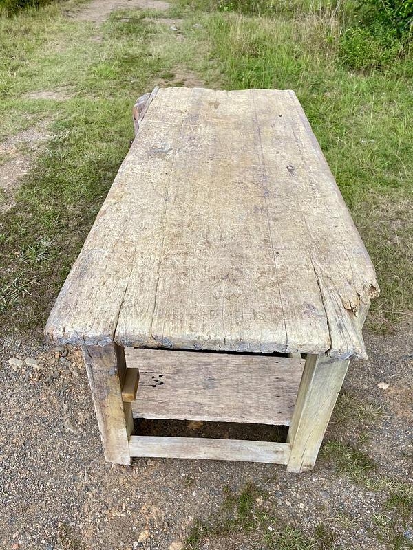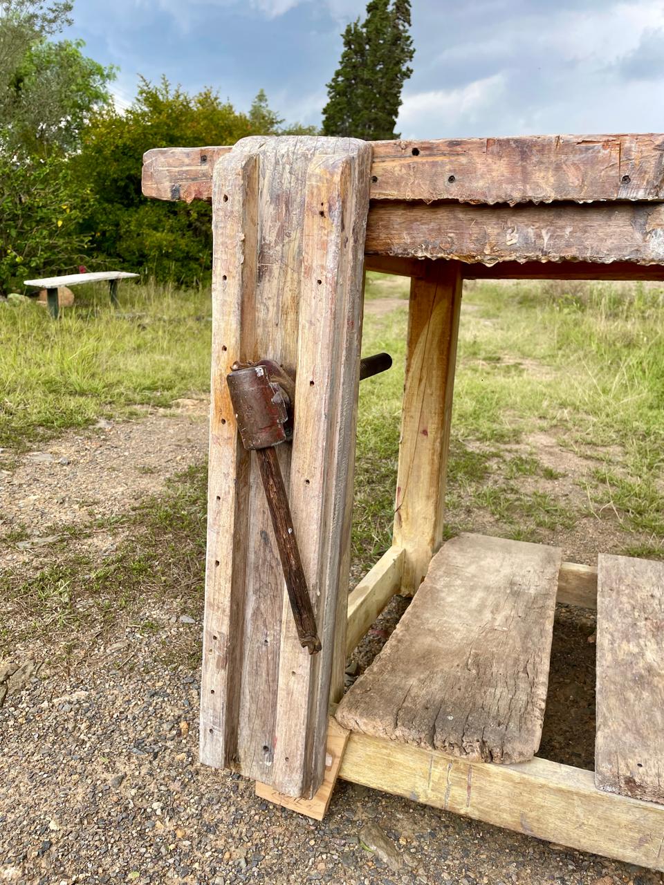 Banco de trabajo de carpintero de mediados del S XX perteneció a un taller ubicado en Sutamarchán en Boyacá. Tiene la prensa de tornillo y los desgastes que muestran las huellas de su pasado: abolladuras, restos de pintura y pegante, desastilladuras, huecos de broca y todos los golpes que le dió el trabajo.