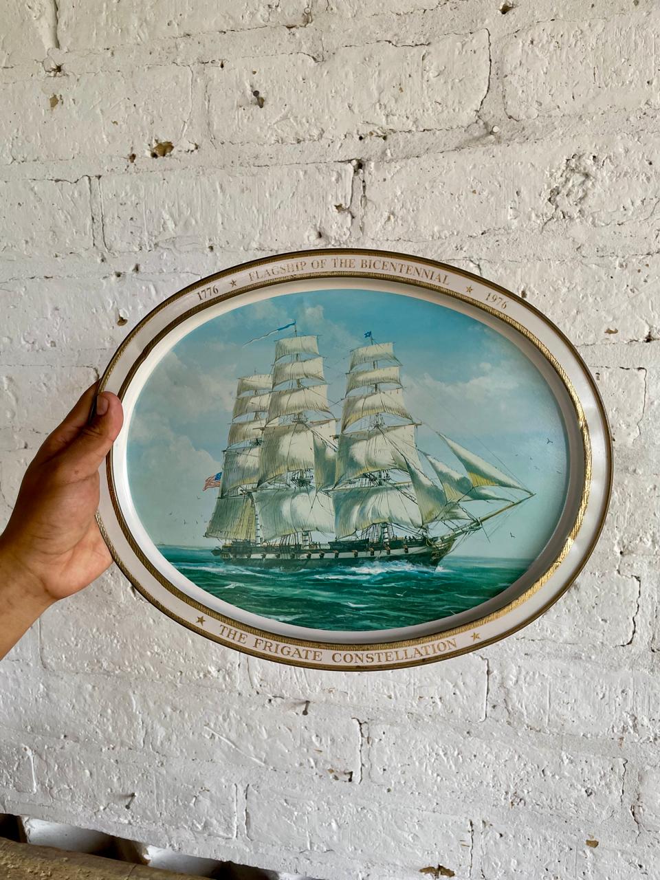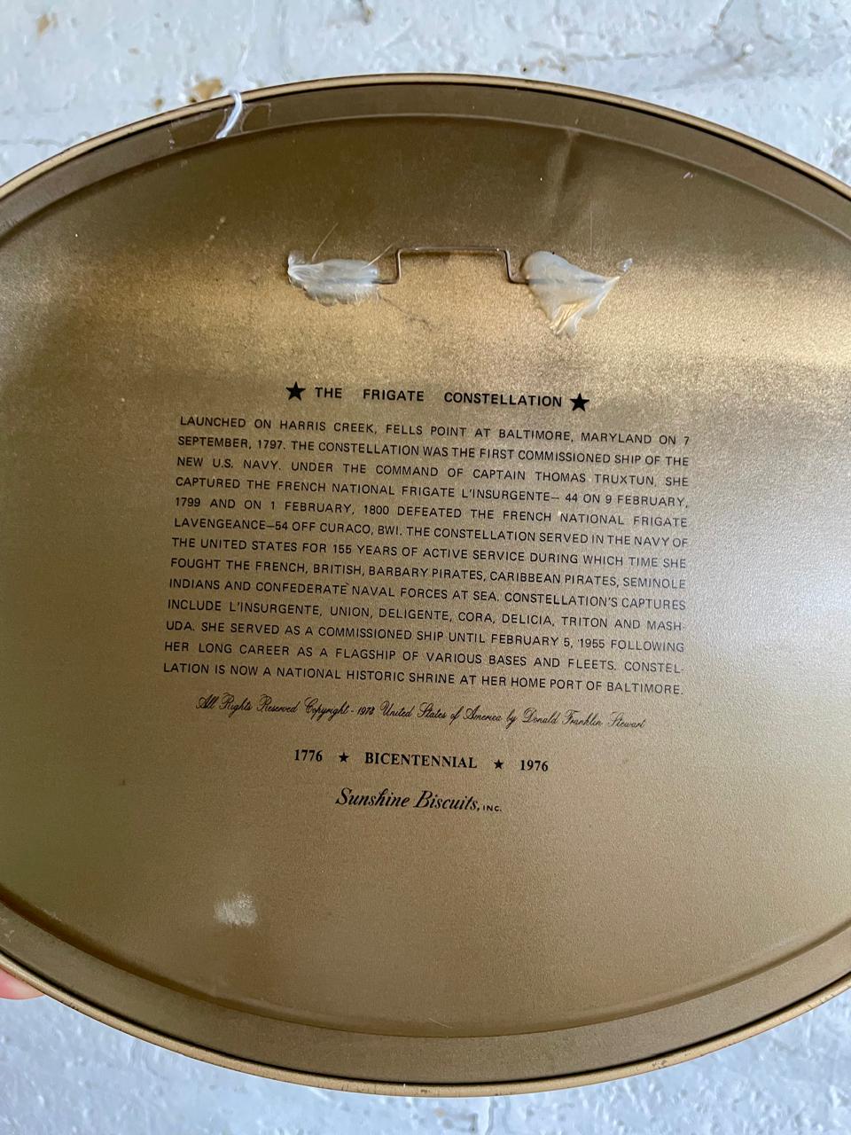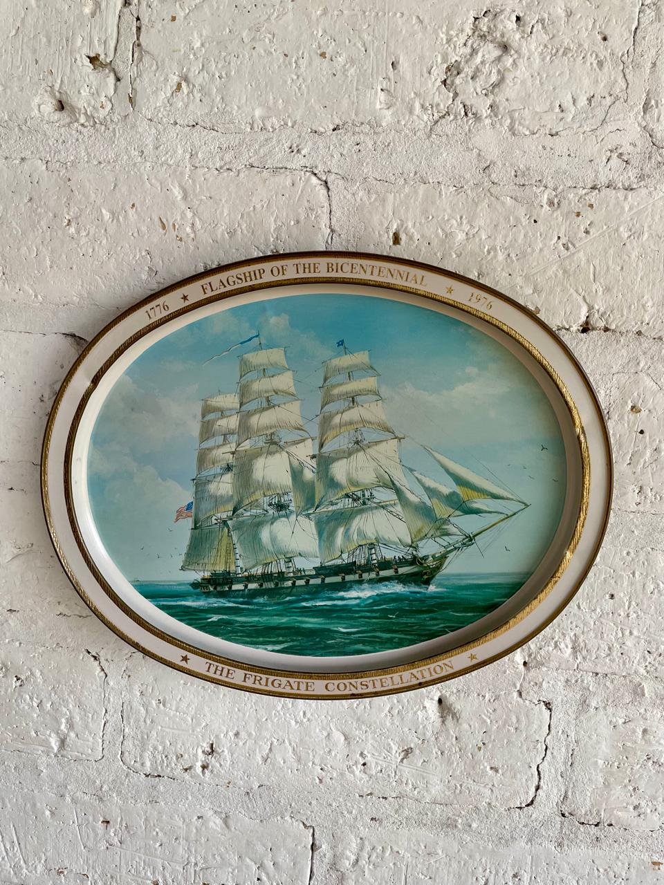 Bandeja metálica, elaborada en U.S.A. en 1976 por Sunshine Biscuits INC, conmemorando el Bicentenario 1776 - 1976 de la Fragata Constelacion, esta embarcación estuvo activa demostrando el poder marítimo de la armada de los Estados Unidos durante 77 años combatiendo principalmente buques Franceces hasta ser considerada obsoleta siendo desbaratada en 1853.