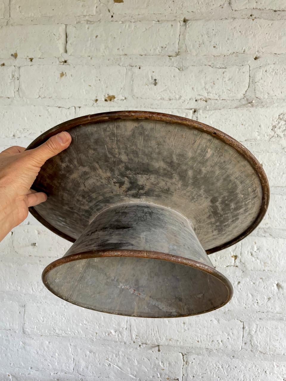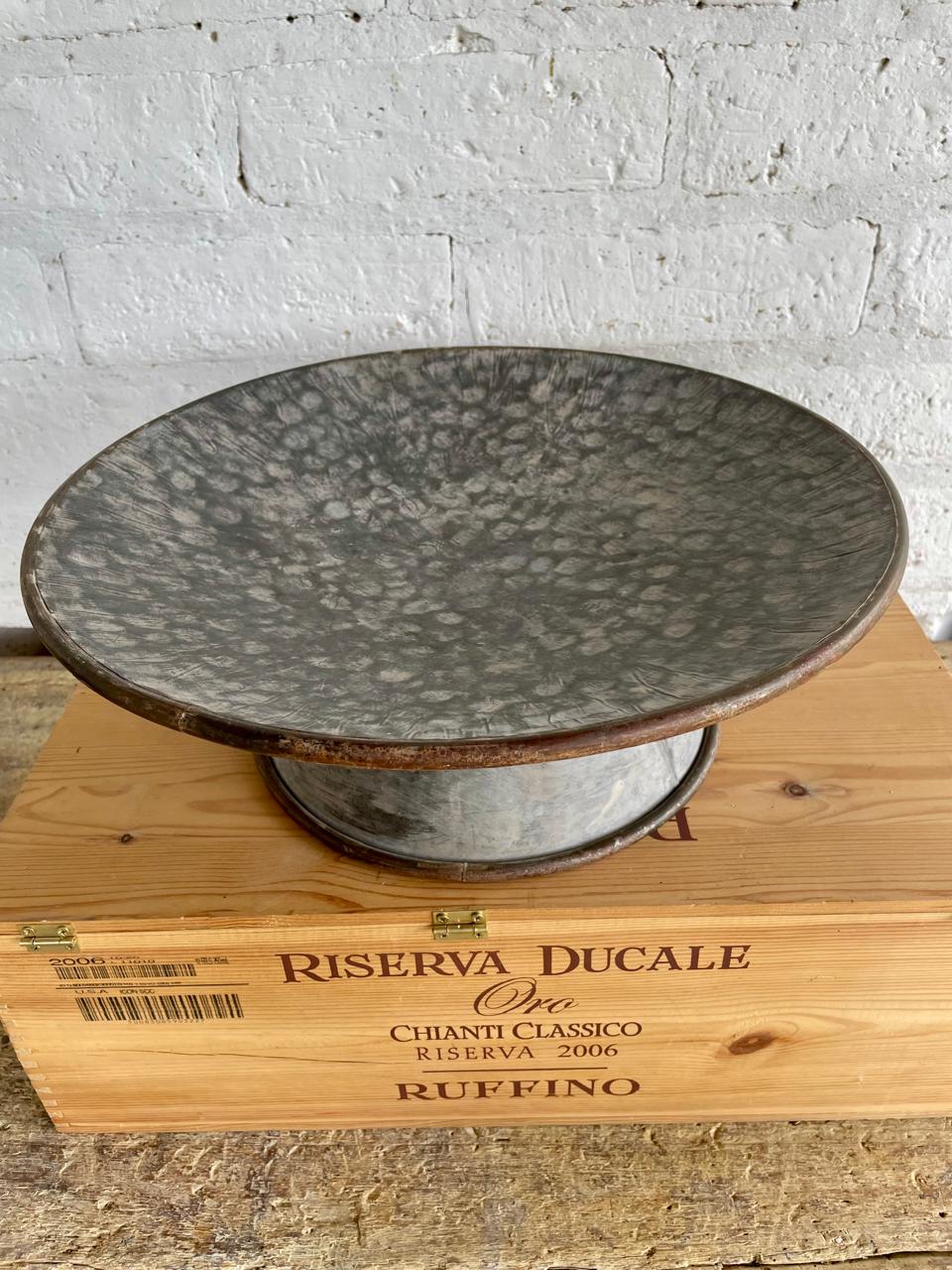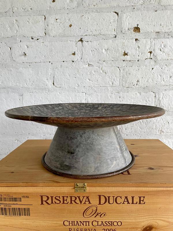 Recipiente cóncavo de estilo country elaborado recientemente en U.S.A de lámina de zinc martillada y decorado con pintura desgastada dando apariencia de antiguo.