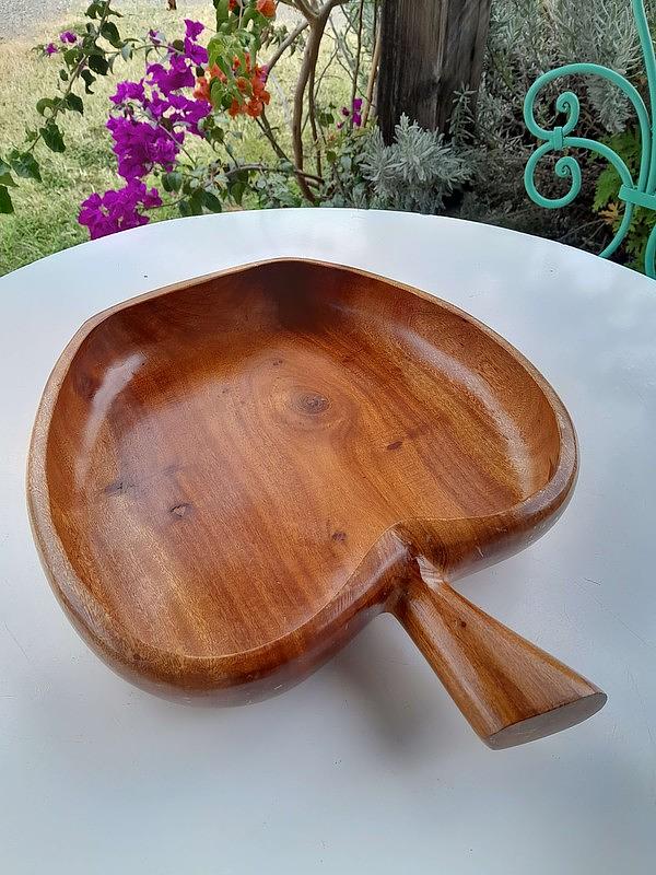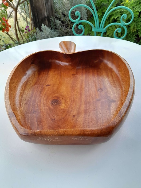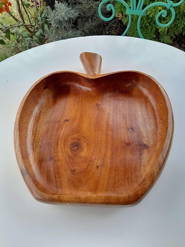 Bandeja de madera tallada con forma de manzana elaborada por artesanos locales.