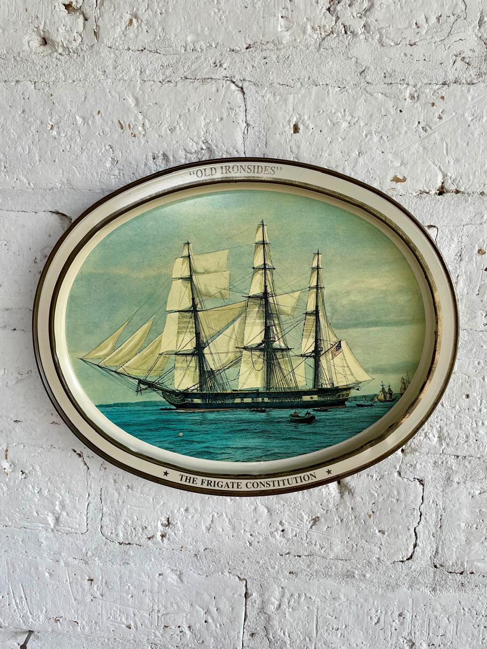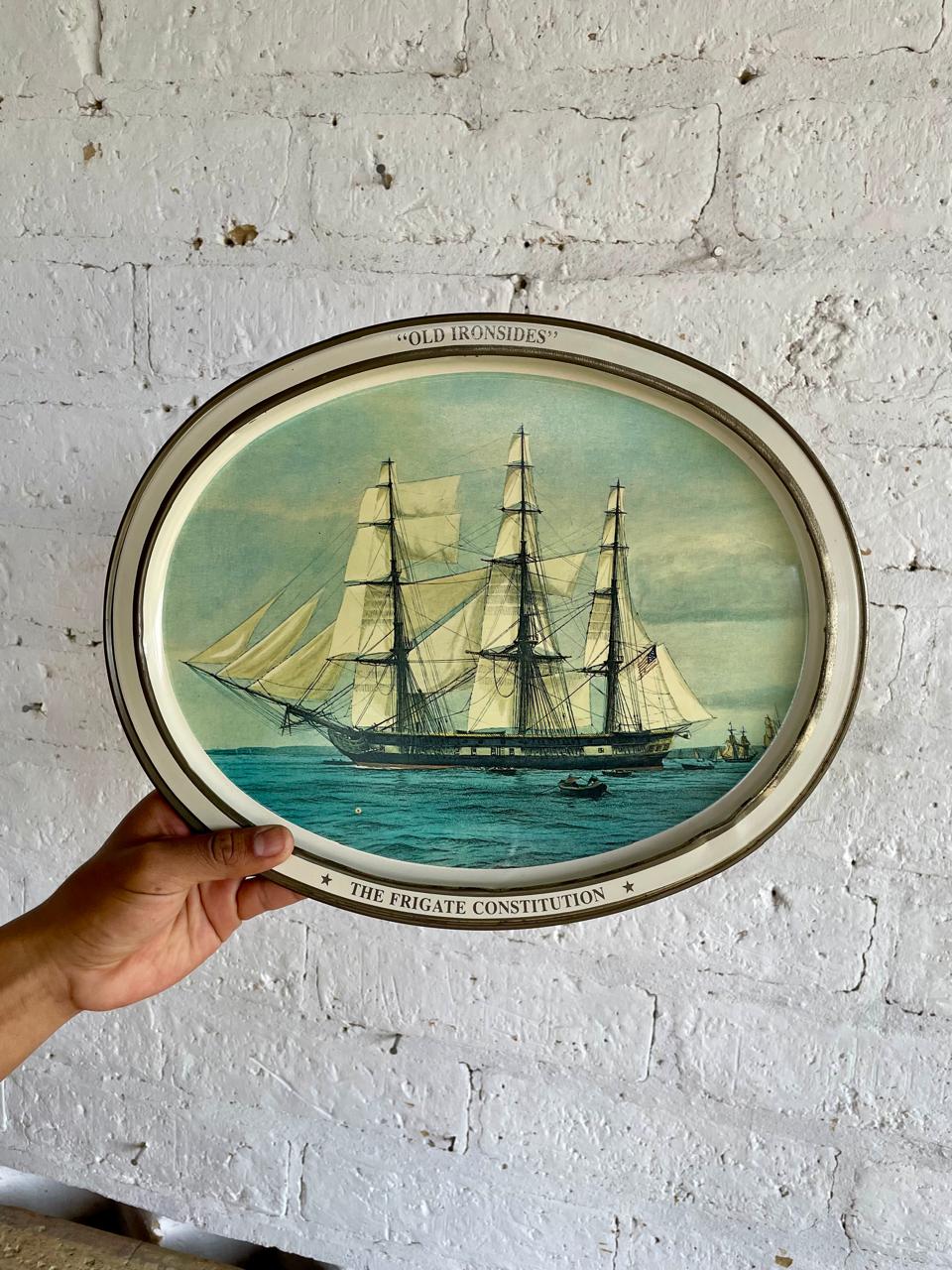 Bandeja metálica, elaborada en U.S.A. en 1976 por Sunshine Biscuit INC, conmemorando el Bicentenario 1776 - 1976 de la Fragata Constitución, esta embarcación es el navío más antiguo que aún se encuentra activo y a flote en todo el mundo, con su tripulación de 60 marineros participa en ceremonias y programas educativos, se mantiene abierta a los visitantes durante todo el año como museo de la historia naval de los Estados Unidos.