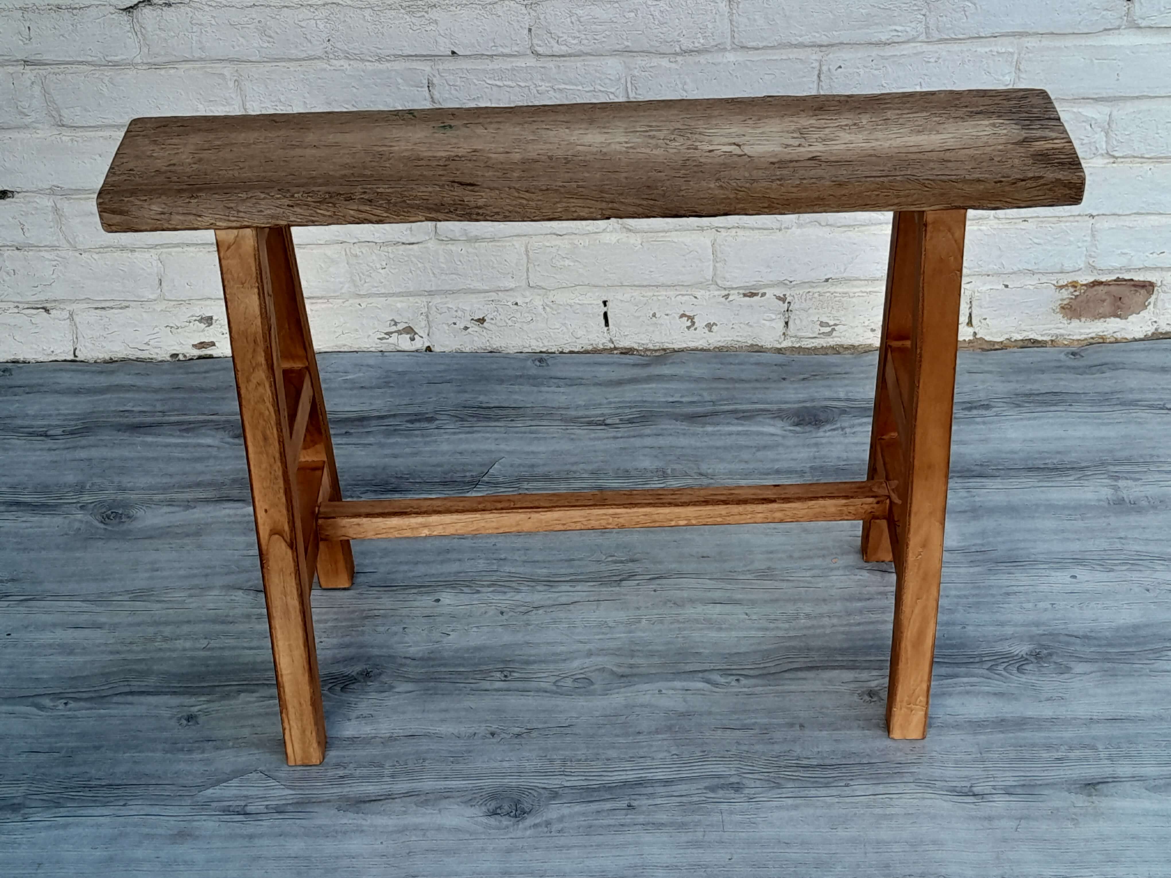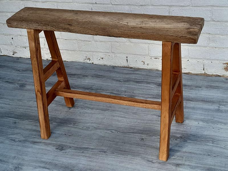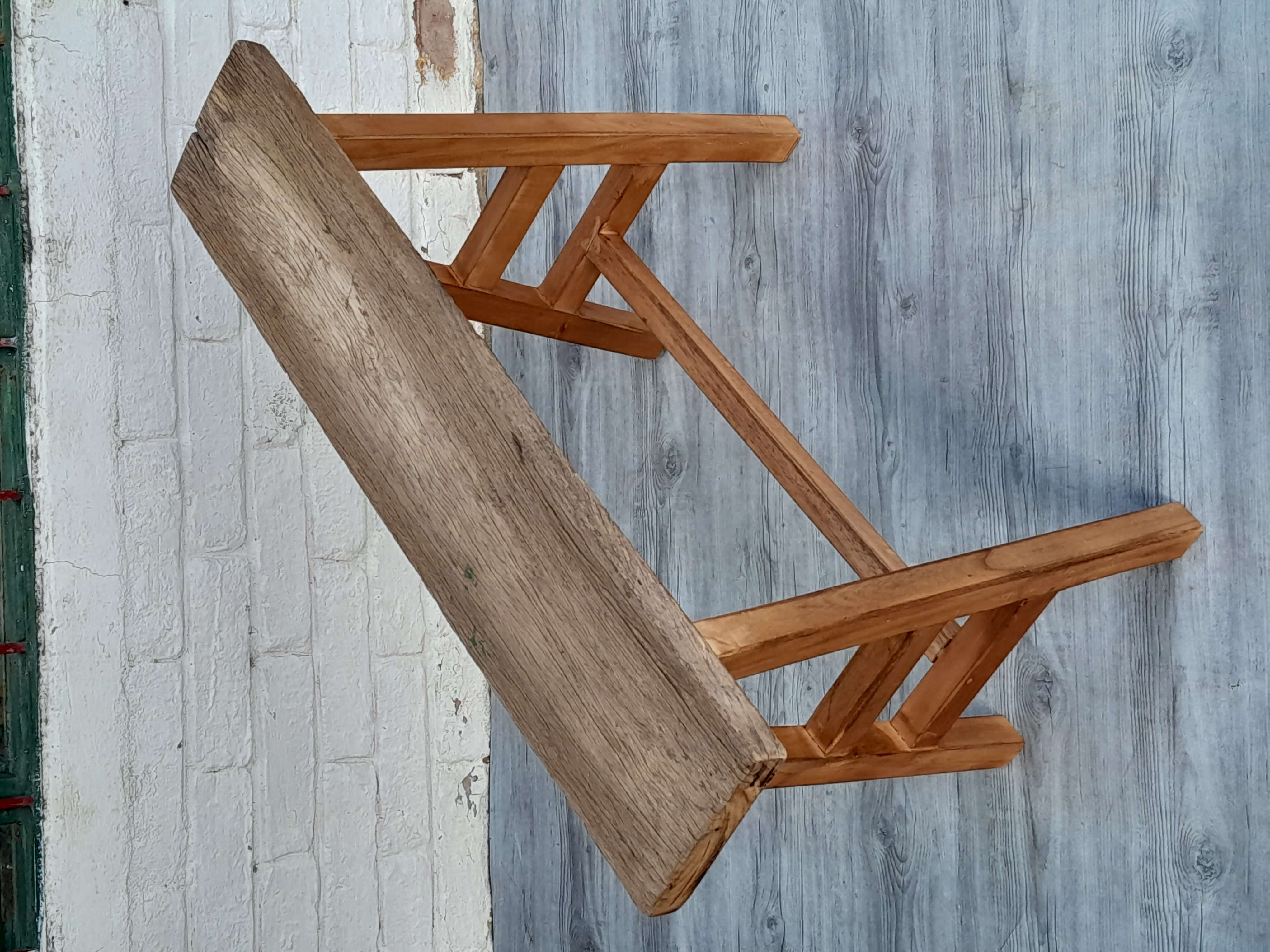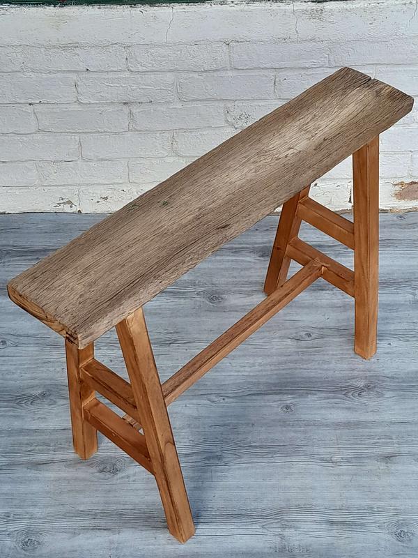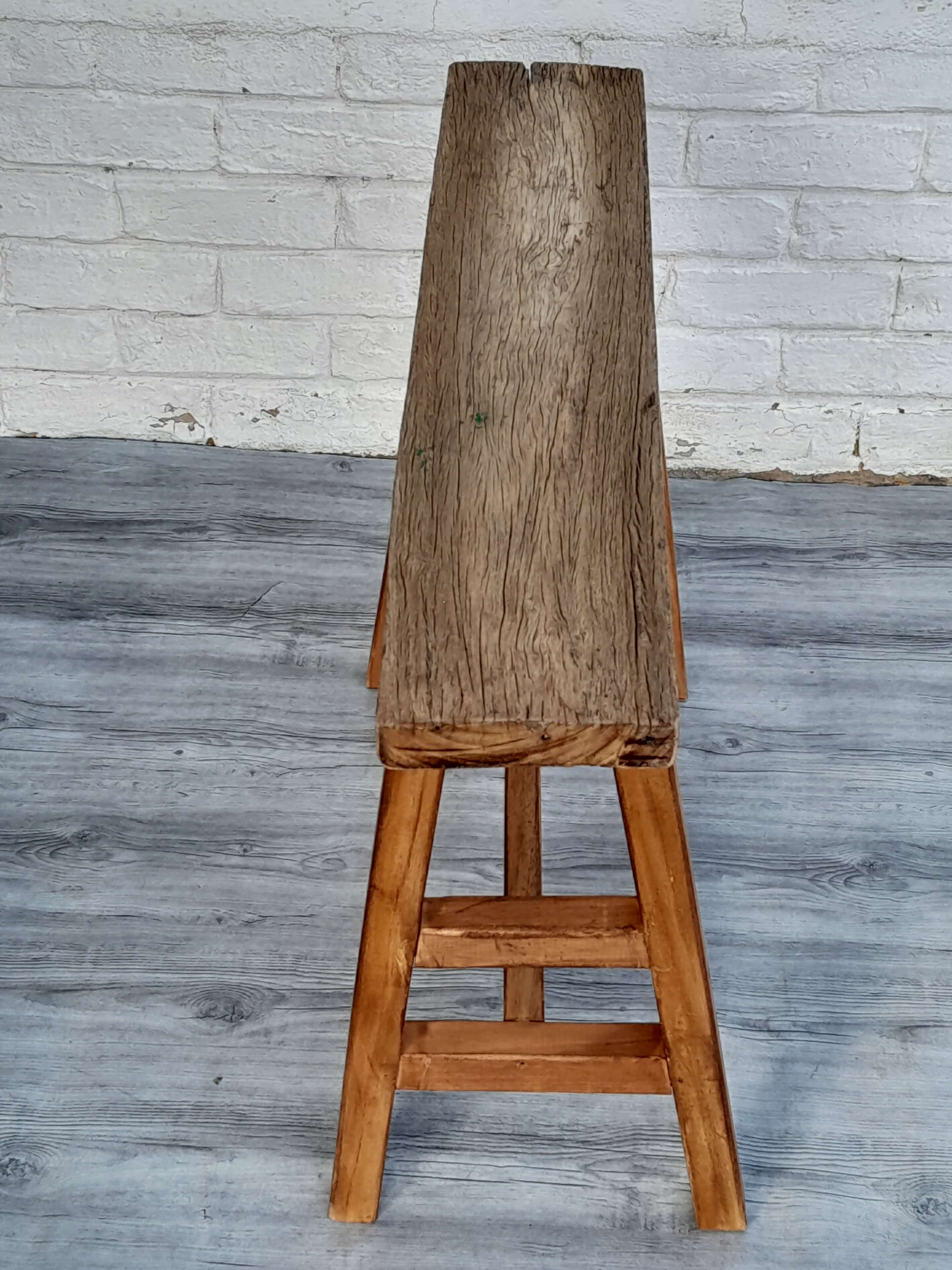 Banqueta recuperada se utilizaba en albañilería y construcción, se ha limpiado quedando a la vista las vetas y color natural de la madera destacando su aspecto rústico. Es muy estable.