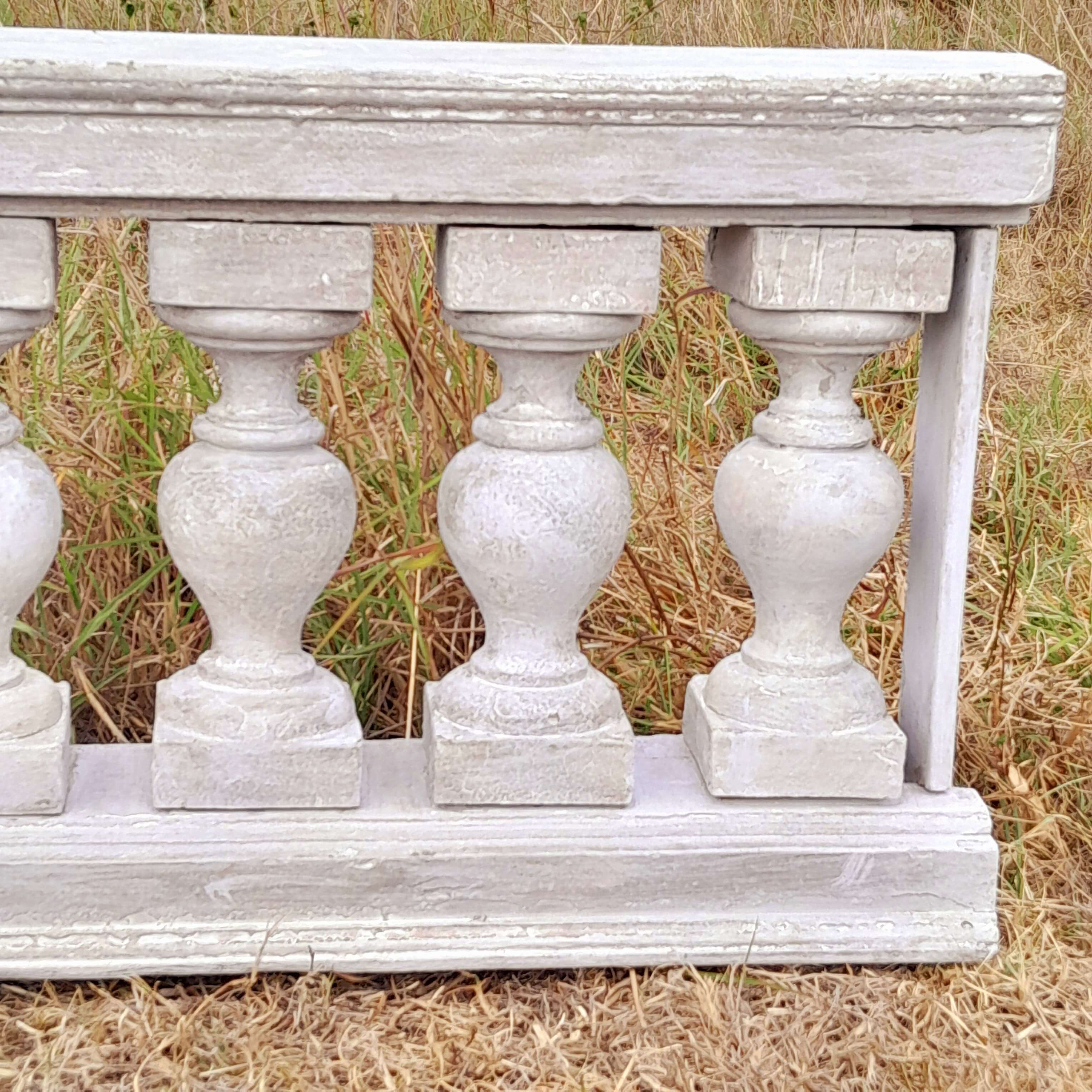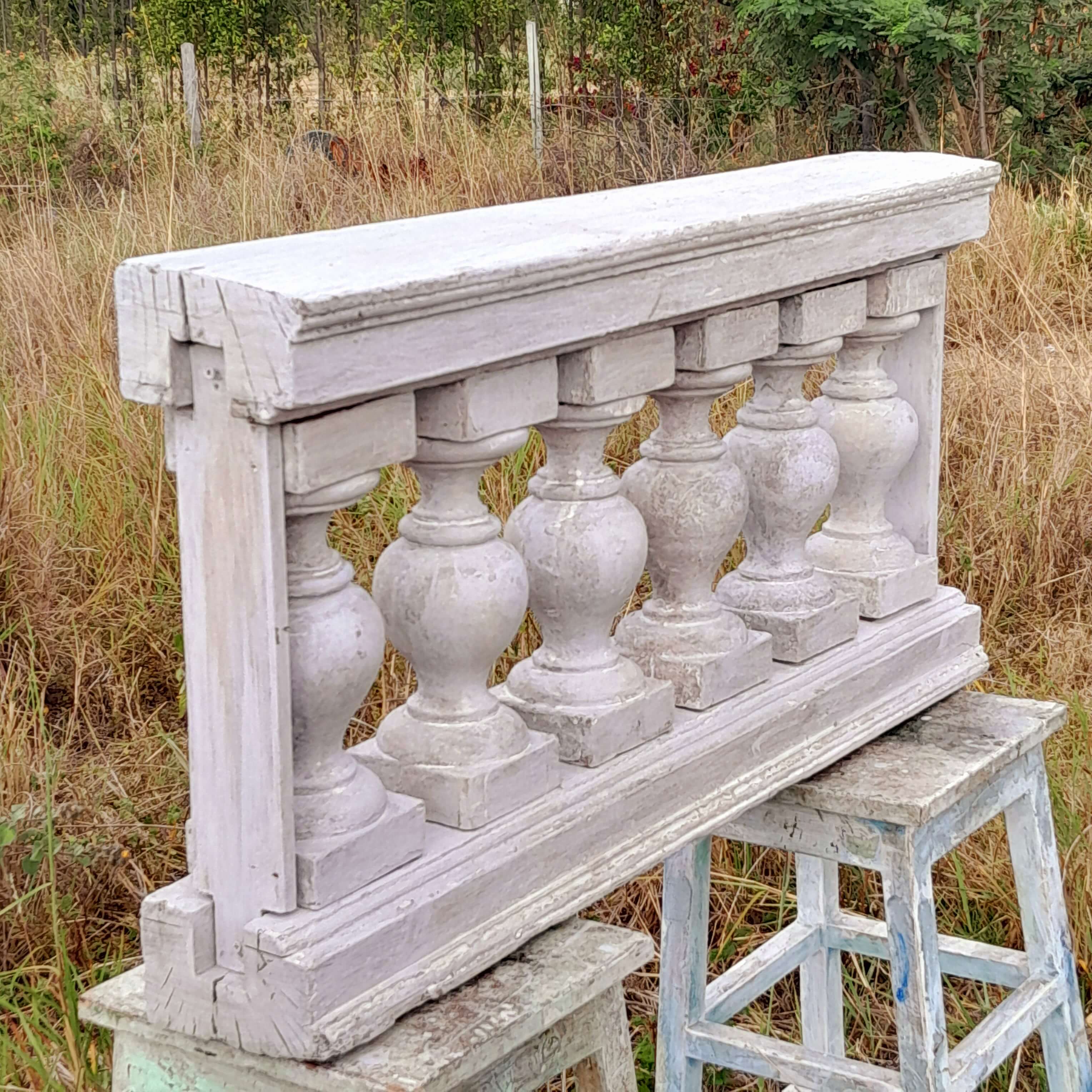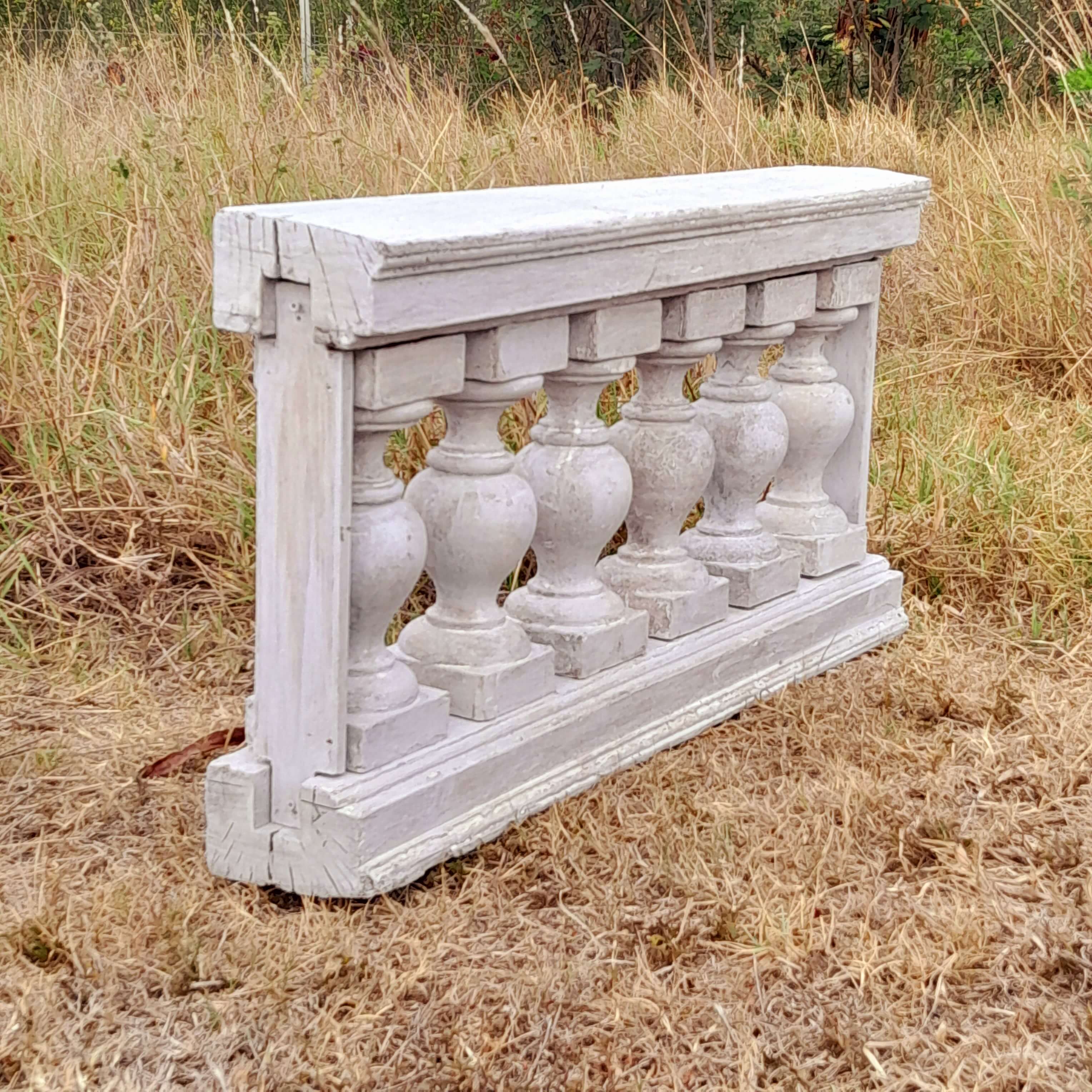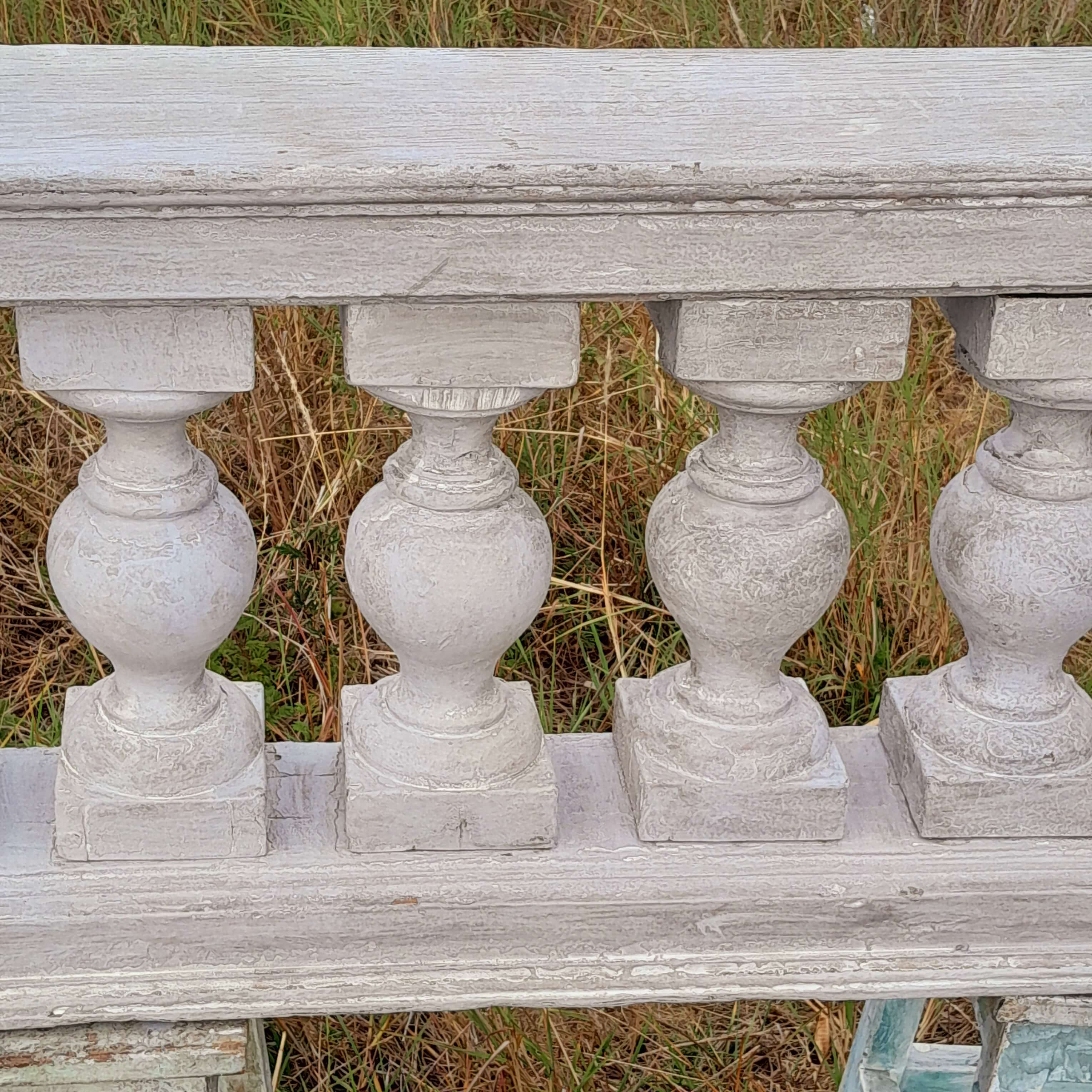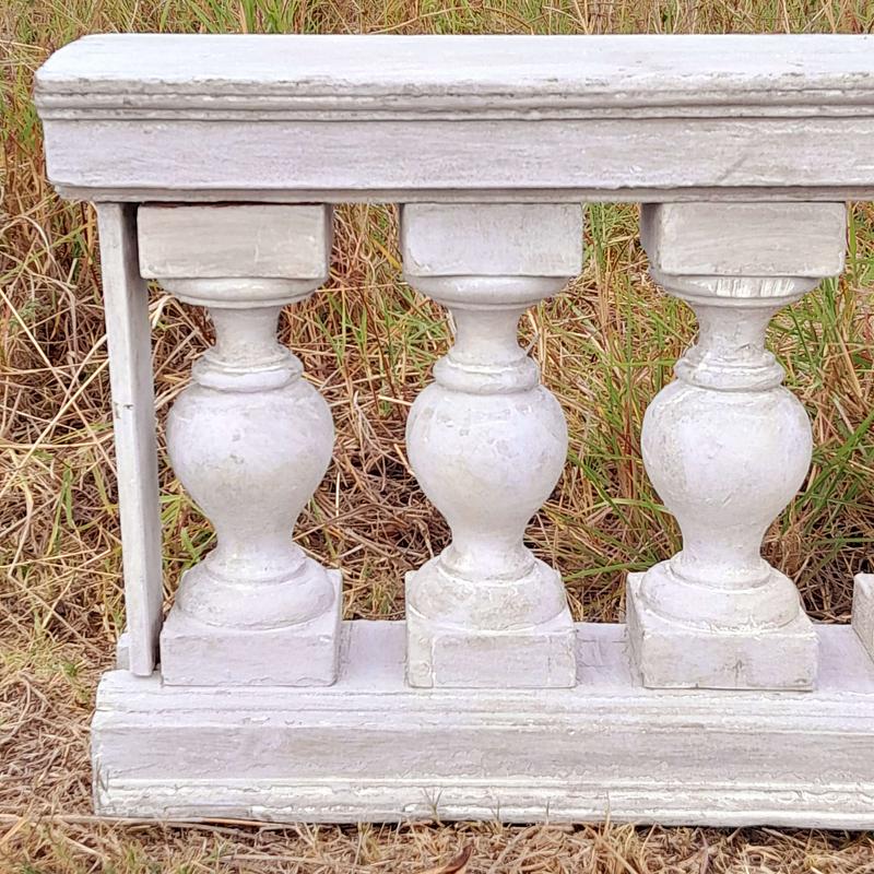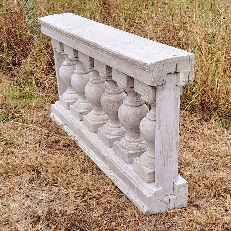 Antigua baranda de madera recuperada en la demolición de una casa del centro de bogotá de finales del S XIX. Los balaustres están ensamblados sin clavos ni tornillos, conserva las diferentes capas de pintura recibidas a lo largo de un siglo. Se encuentra en buen estado.