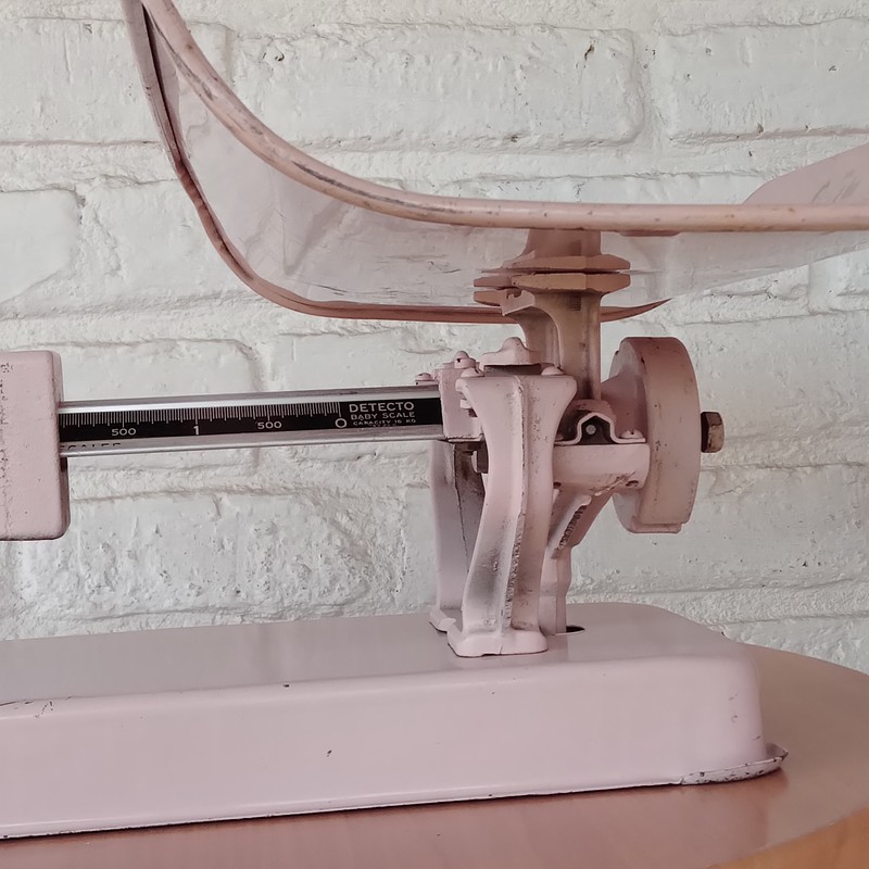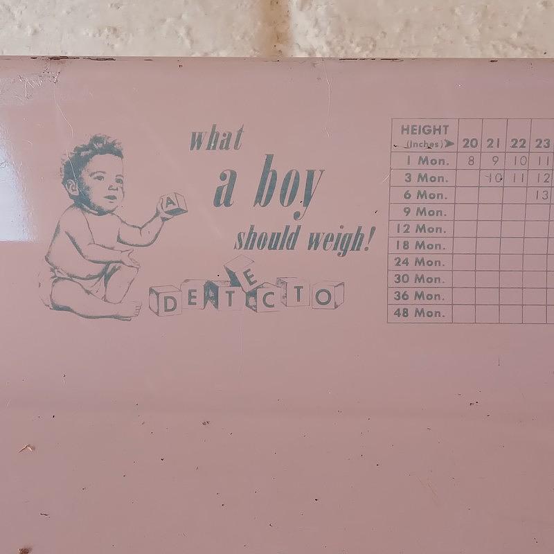 Esta balanza de bebés perteneció al Hospital Lorencita Villegas de Santos en Bogotá, fabricada a mediados del siglo XX por Detecto Scale Inc. Brooklyn, NY, USA, Tiene capacidad para pesar hasta 16 kg, en el platón tiene registrada las tablas de peso-talla-edad para niños y niñas.