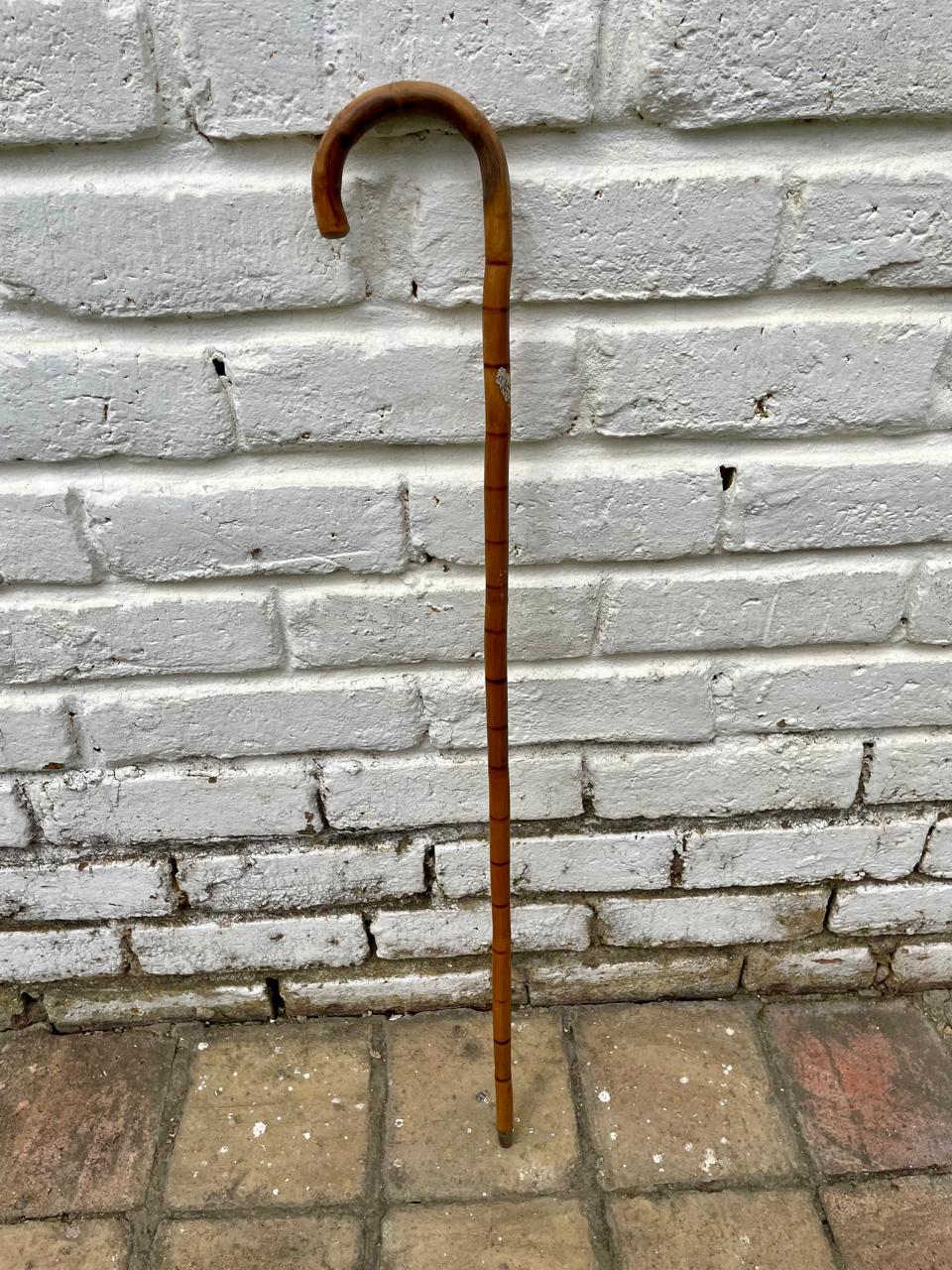 Bastón antiguo de bambú, con mango curvado y punta metálica, presenta desgastes en el barníz por el uso.