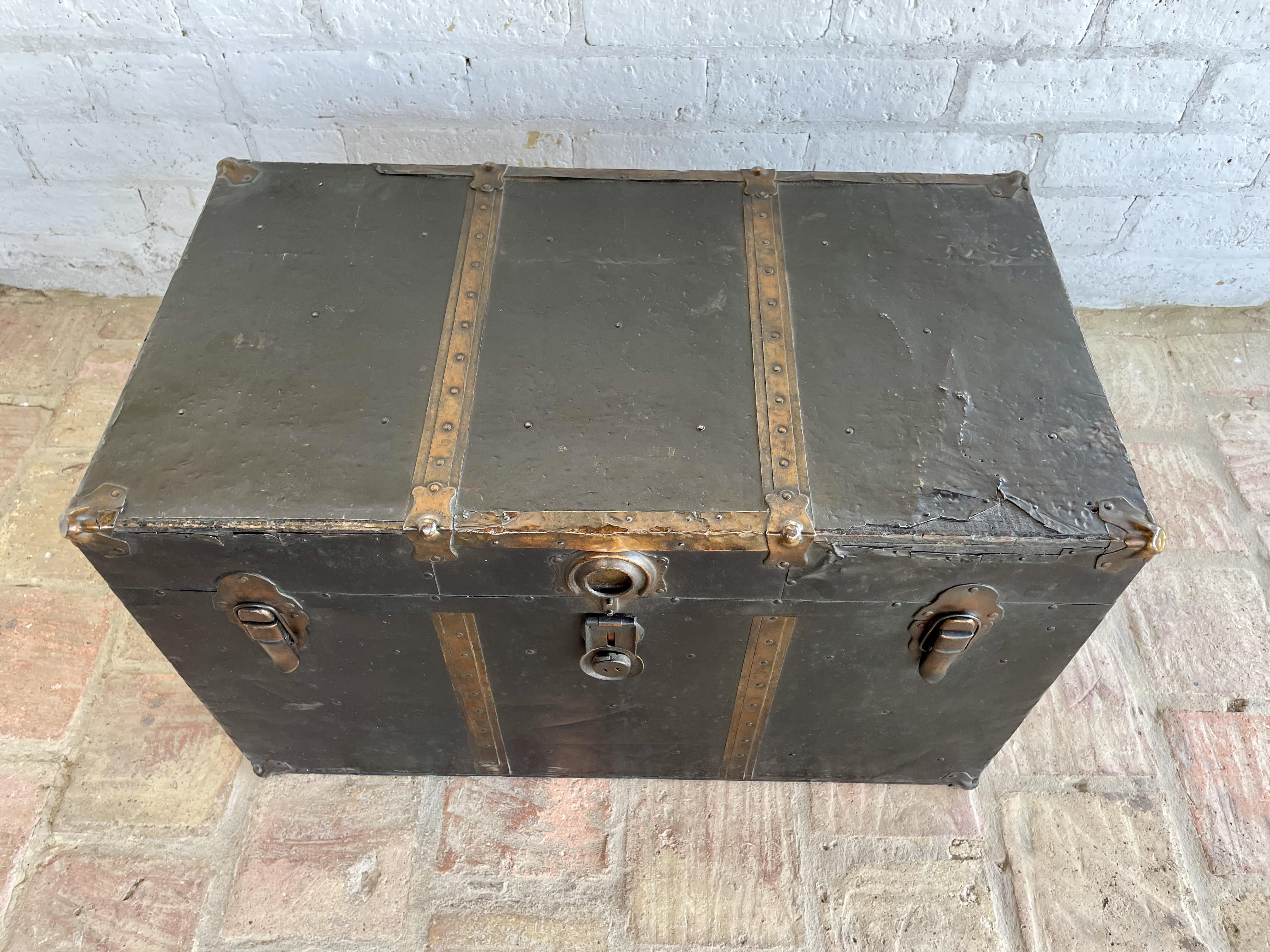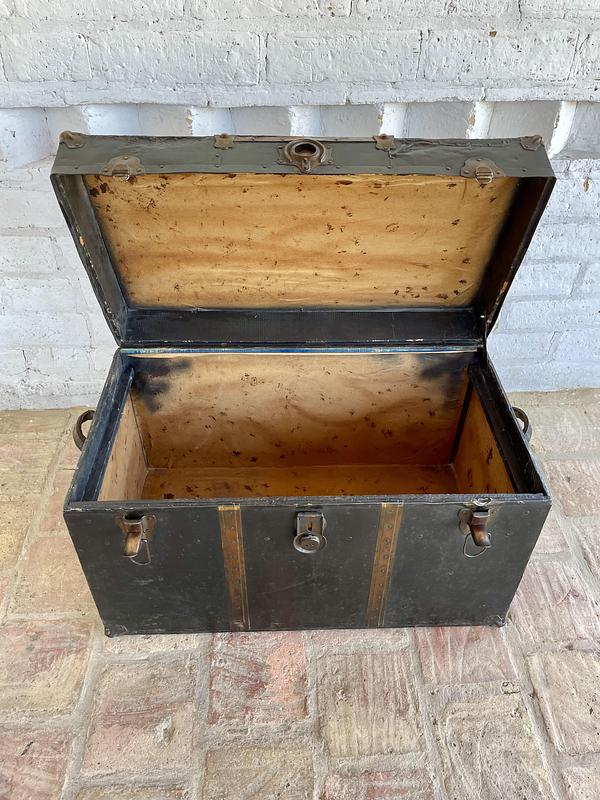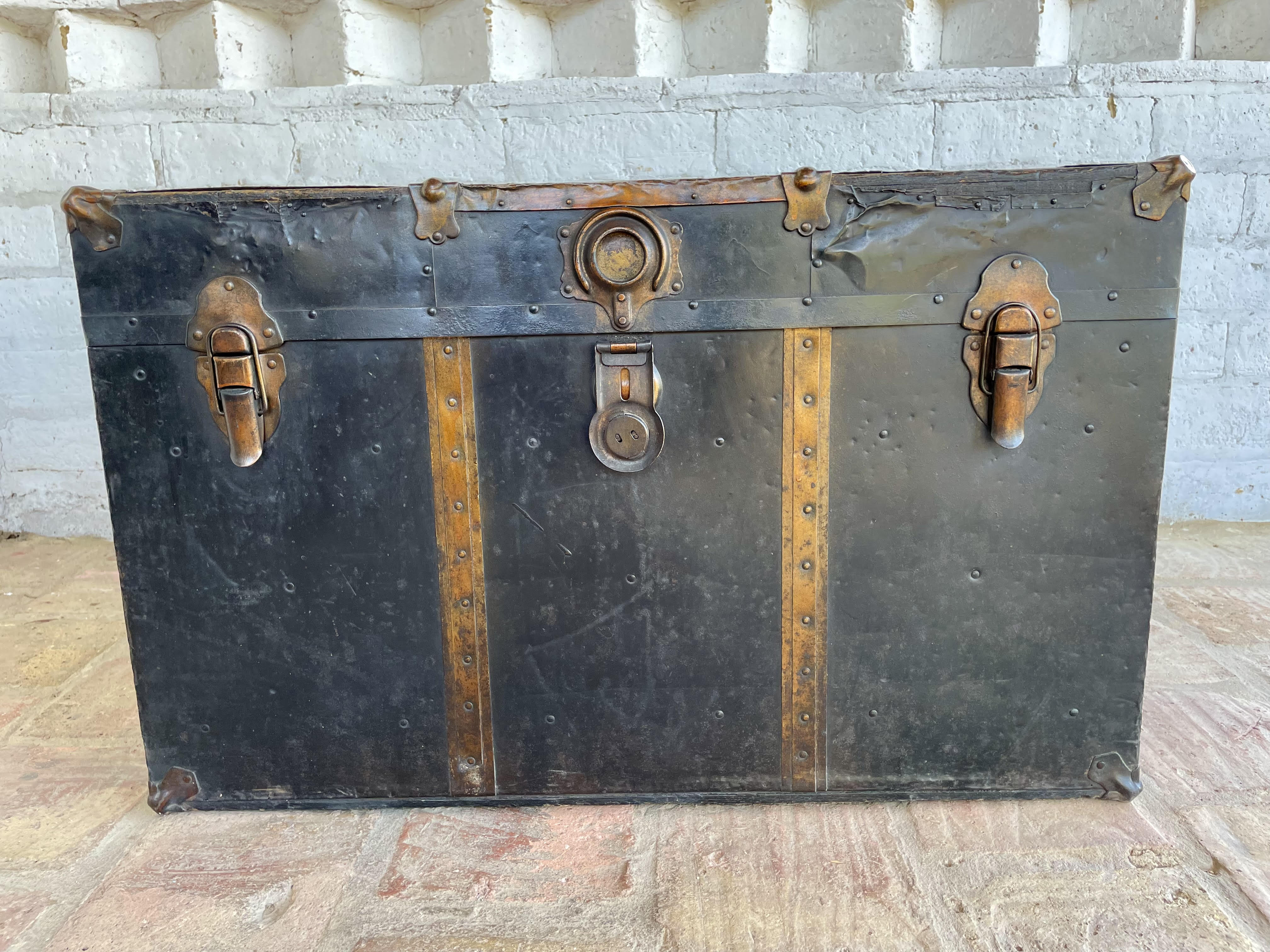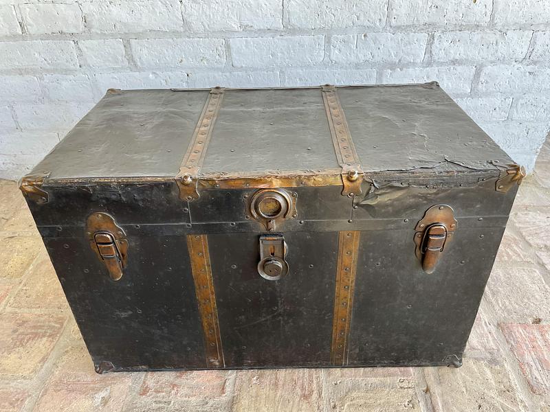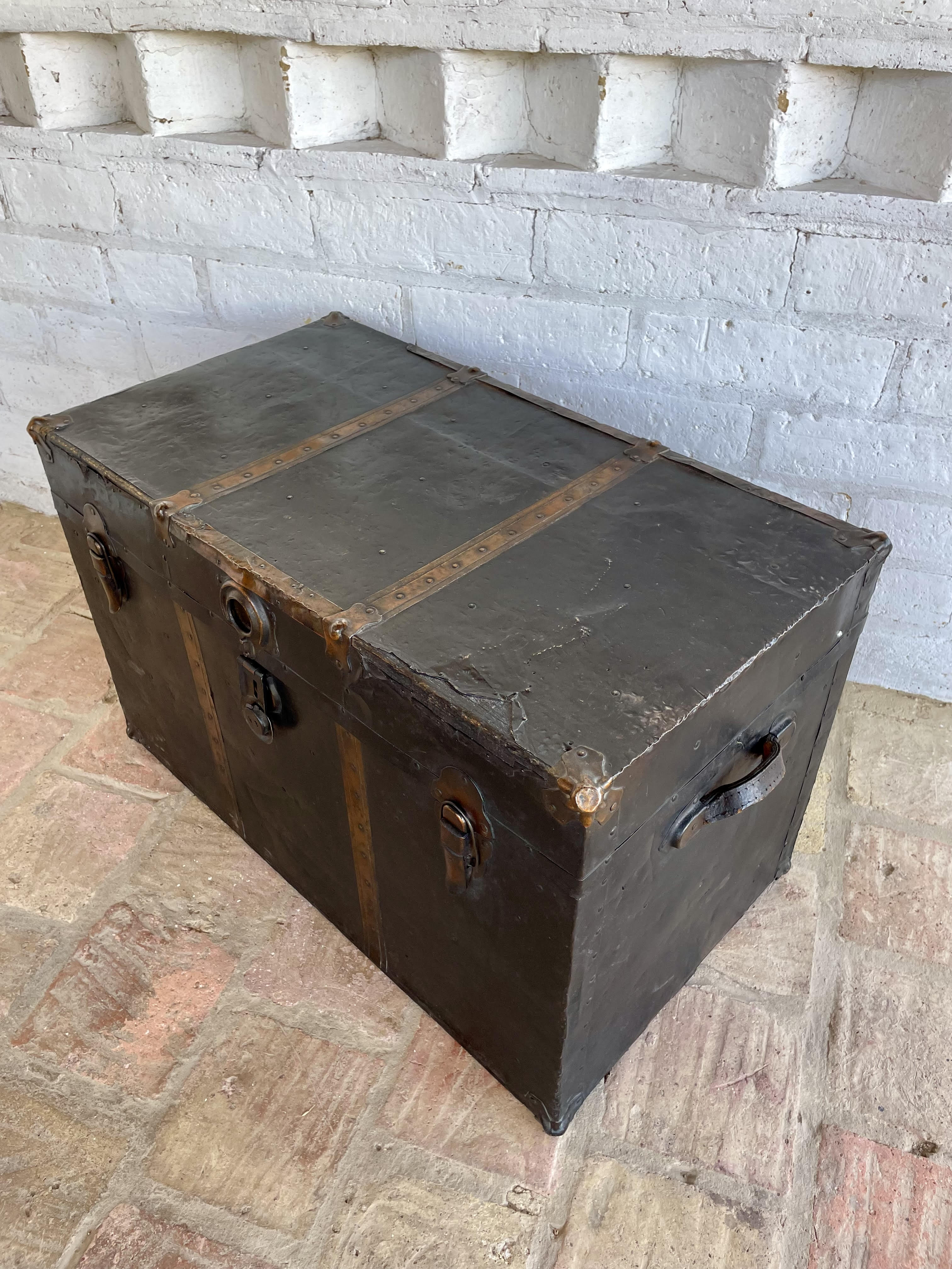 Antiguo baúl de principios del siglo XX, por las características se puede decir que es de fabricación inglesa. Utilizado para viajes en barco y tren, con muchas millas recorridas a lo largo de su vida, ahora lo podemos utilizar como mesa de centro con espacio en su interior de almacenaje. Fabricado en madera recubierta en lámina metálica, con bordes y refuerzos en cobre y manijas de cuero. La madera se encuentra en buen estado, algunas partes de los bordes en cobre están desgastados y faltan pedazos, no tiene llave, el forro interno no es original. La madera se encuentra en buen estado libre de termitas y comején