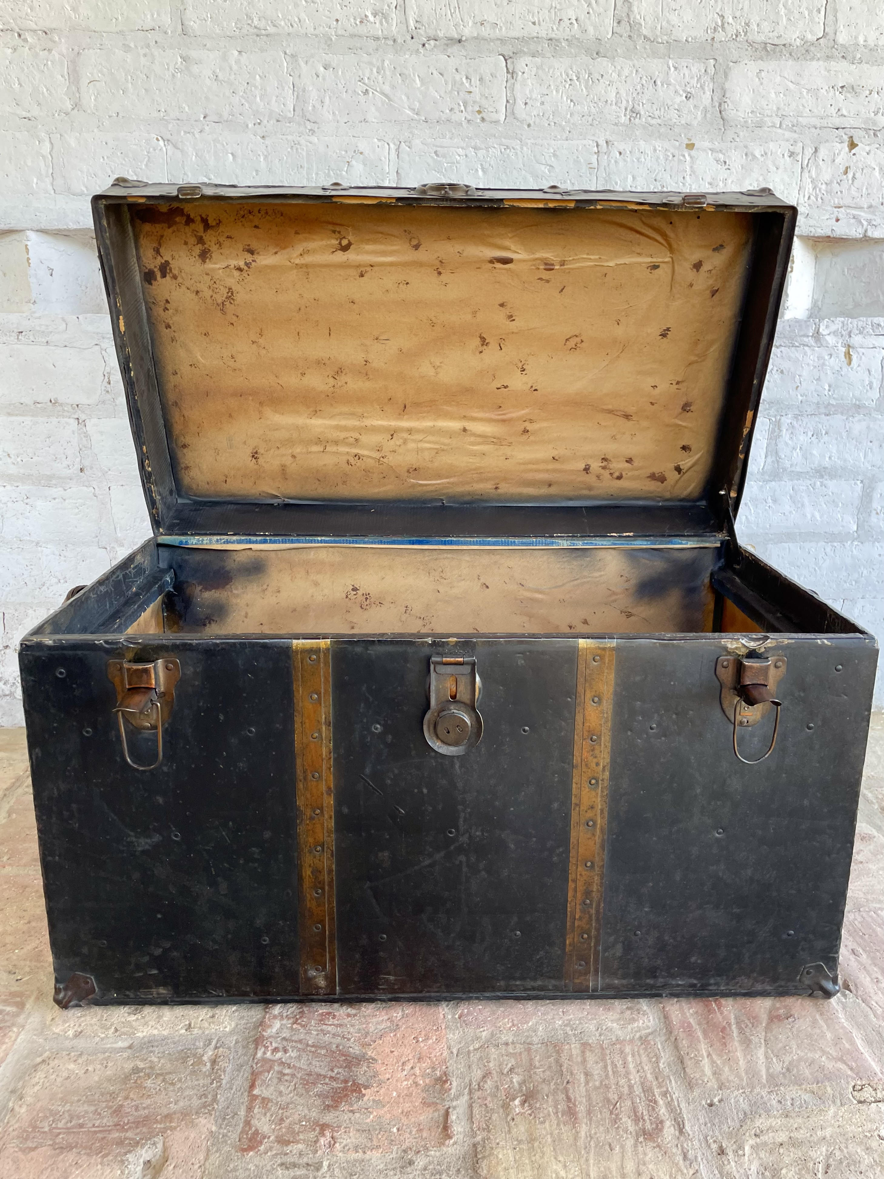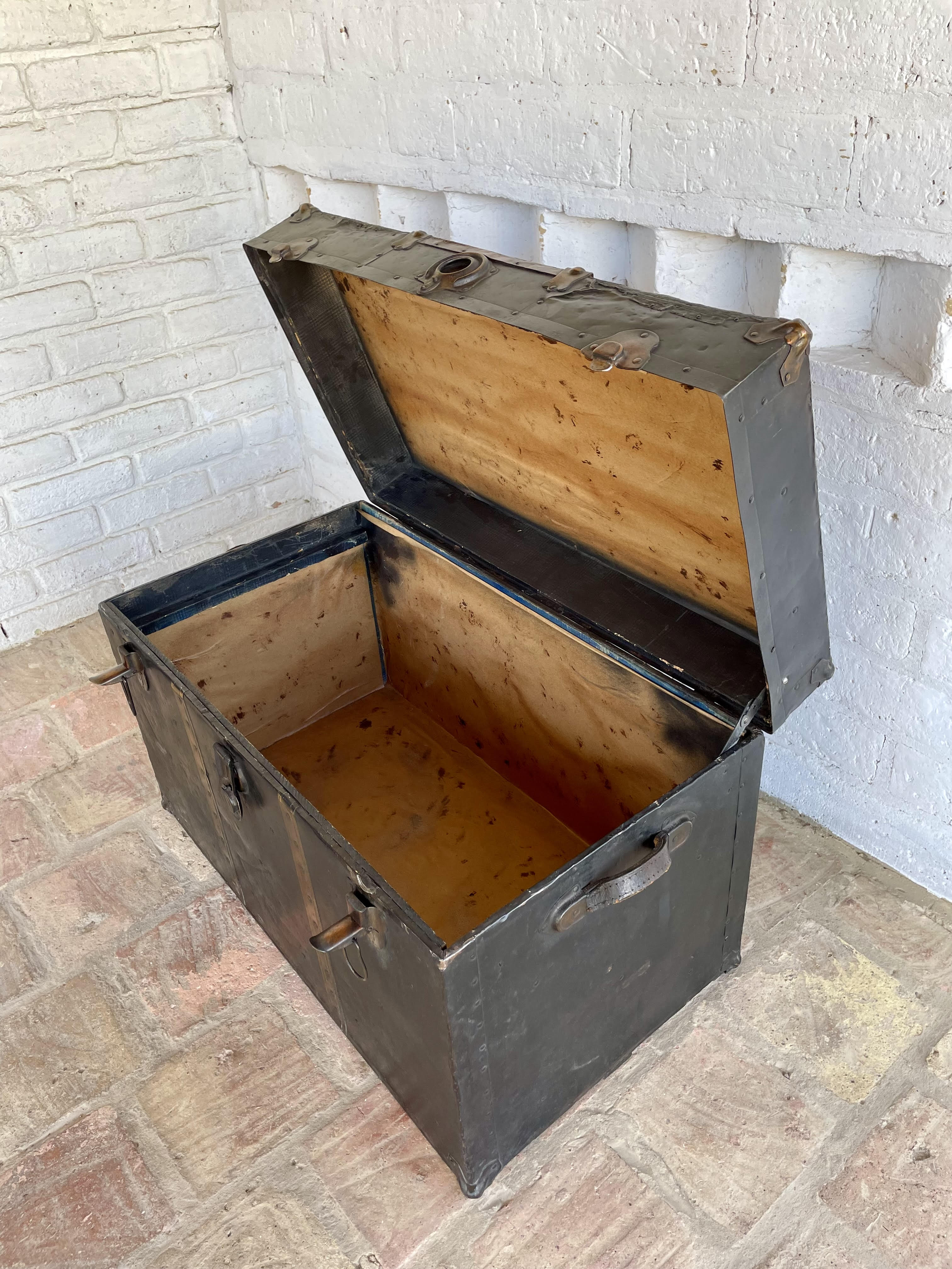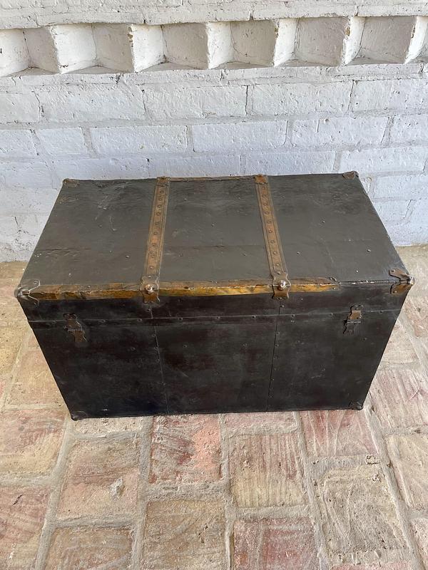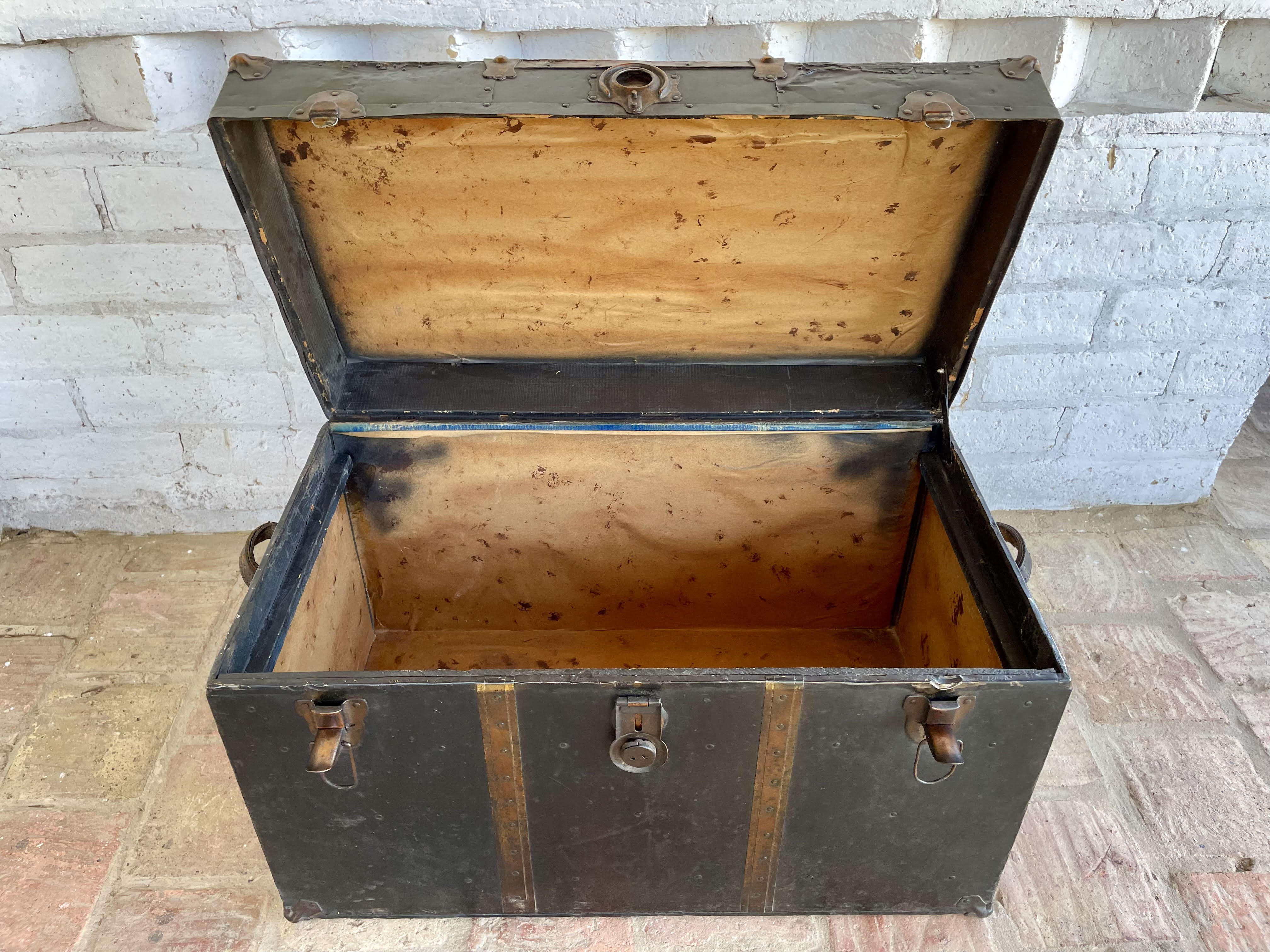 Antiguo baúl de principios del siglo XX, por las características se puede decir que es de fabricación inglesa. Utilizado para viajes en barco y tren, con muchas millas recorridas a lo largo de su vida, ahora lo podemos utilizar como mesa de centro con espacio en su interior de almacenaje. Fabricado en madera recubierta en lámina metálica, con bordes y refuerzos en cobre y manijas de cuero. La madera se encuentra en buen estado, algunas partes de los bordes en cobre están desgastados y faltan pedazos, no tiene llave, el forro interno no es original. La madera se encuentra en buen estado libre de termitas y comején