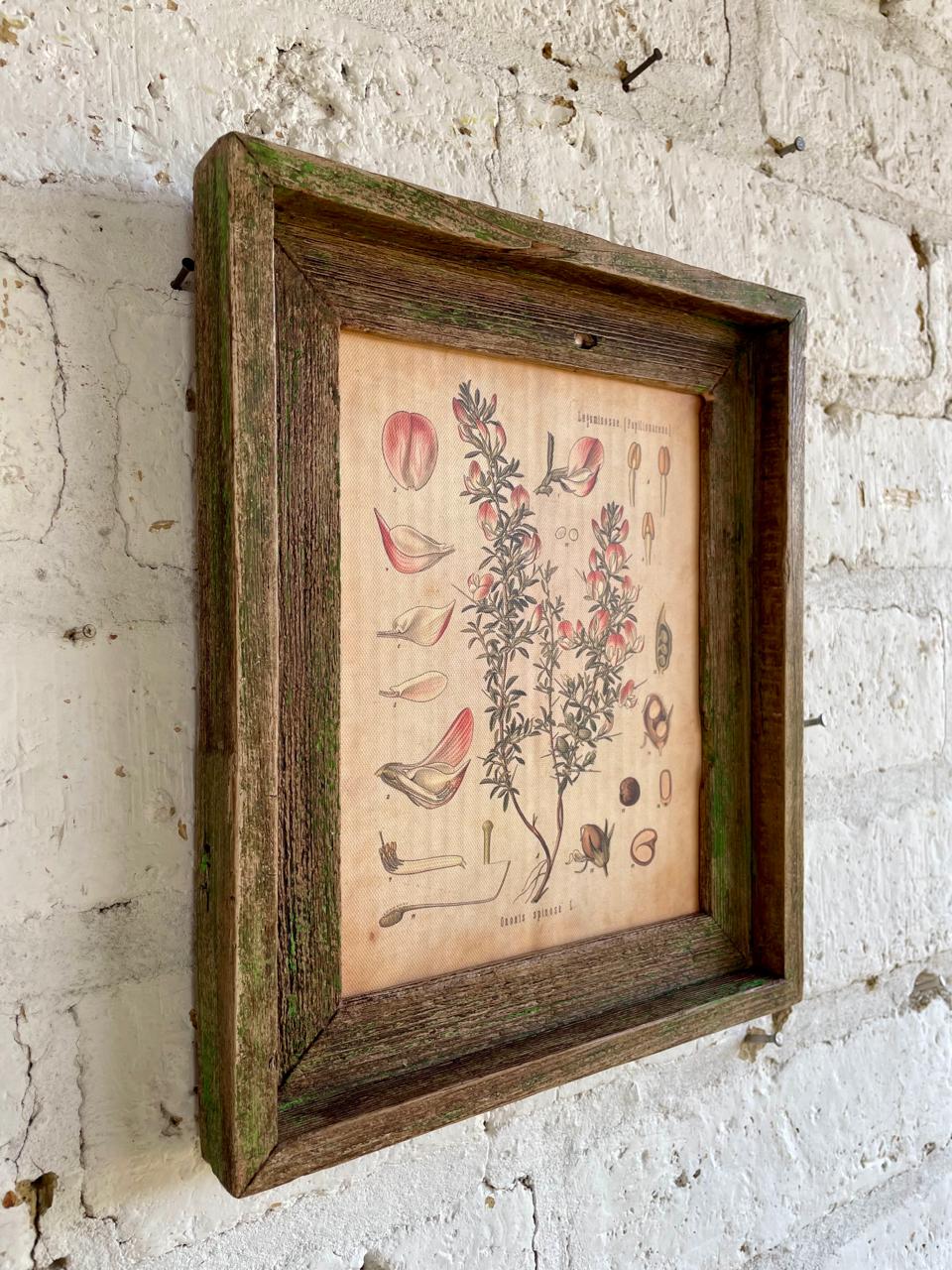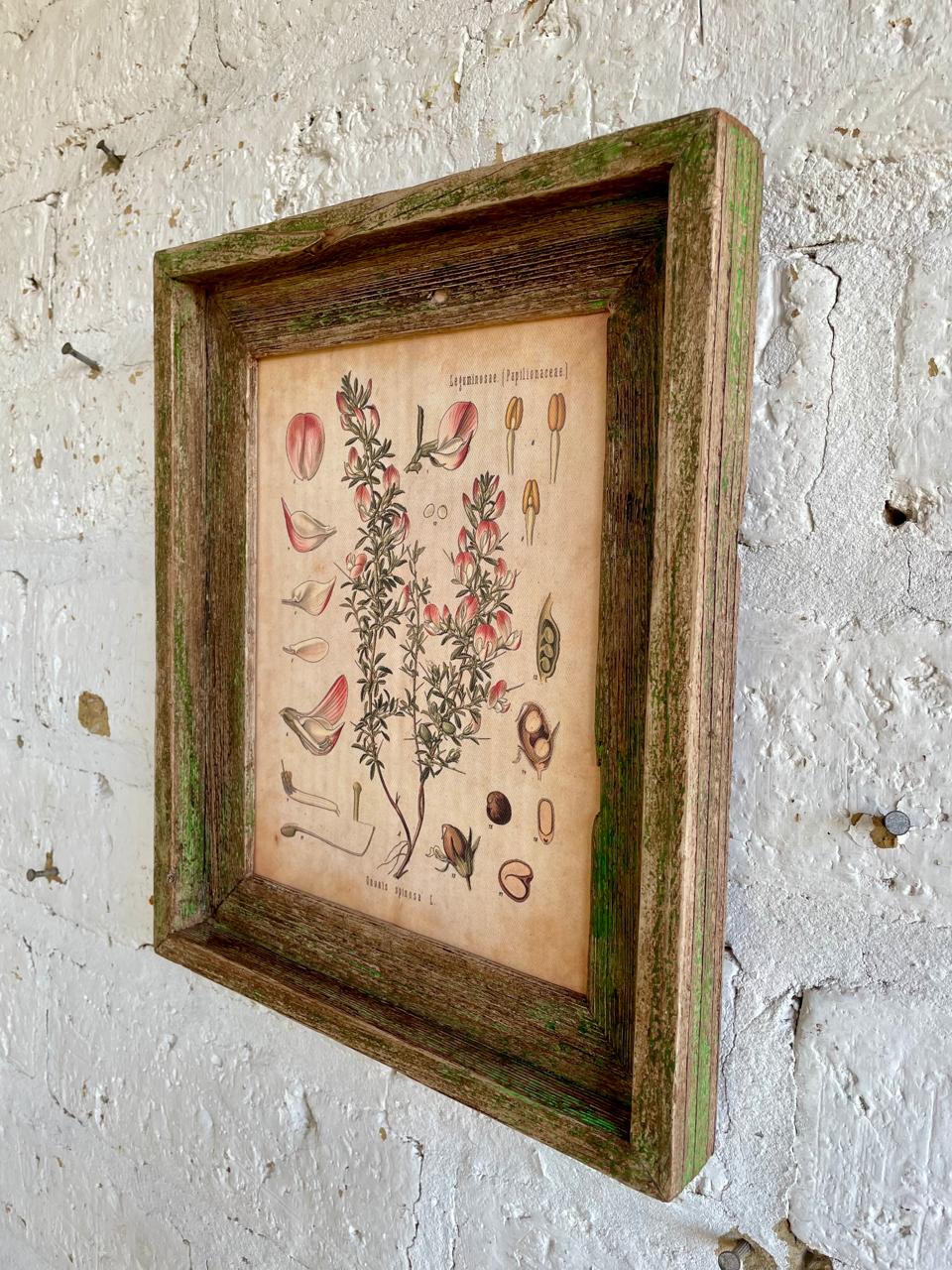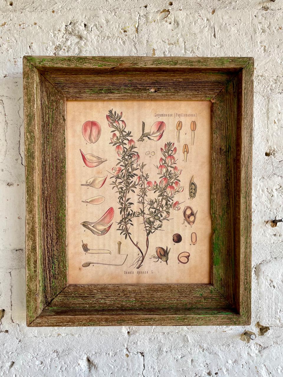 Lámina impresa en lona sintética enmarcada con moldura de madera rústica, elaborada en el taller de la tienda. La lámina es una copia del dibujo ononis spinosa del Atlas de plantas medicinales publicado en 1887 por el alemán Hermann Adolph Köhler. El marco de madera rústica decorada con pintura desgastada ha sido una elección acertada para resaltar la reproducción de un dibujo antiguo.