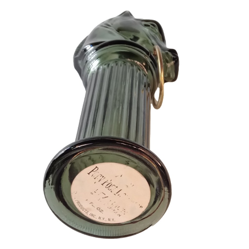 Frasco de vidrio verde de loción con forma de cabeza de caballo producida en Nueva York por Avon. Se encuentra en buen estado.