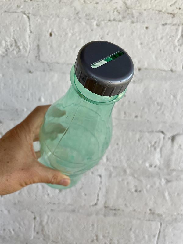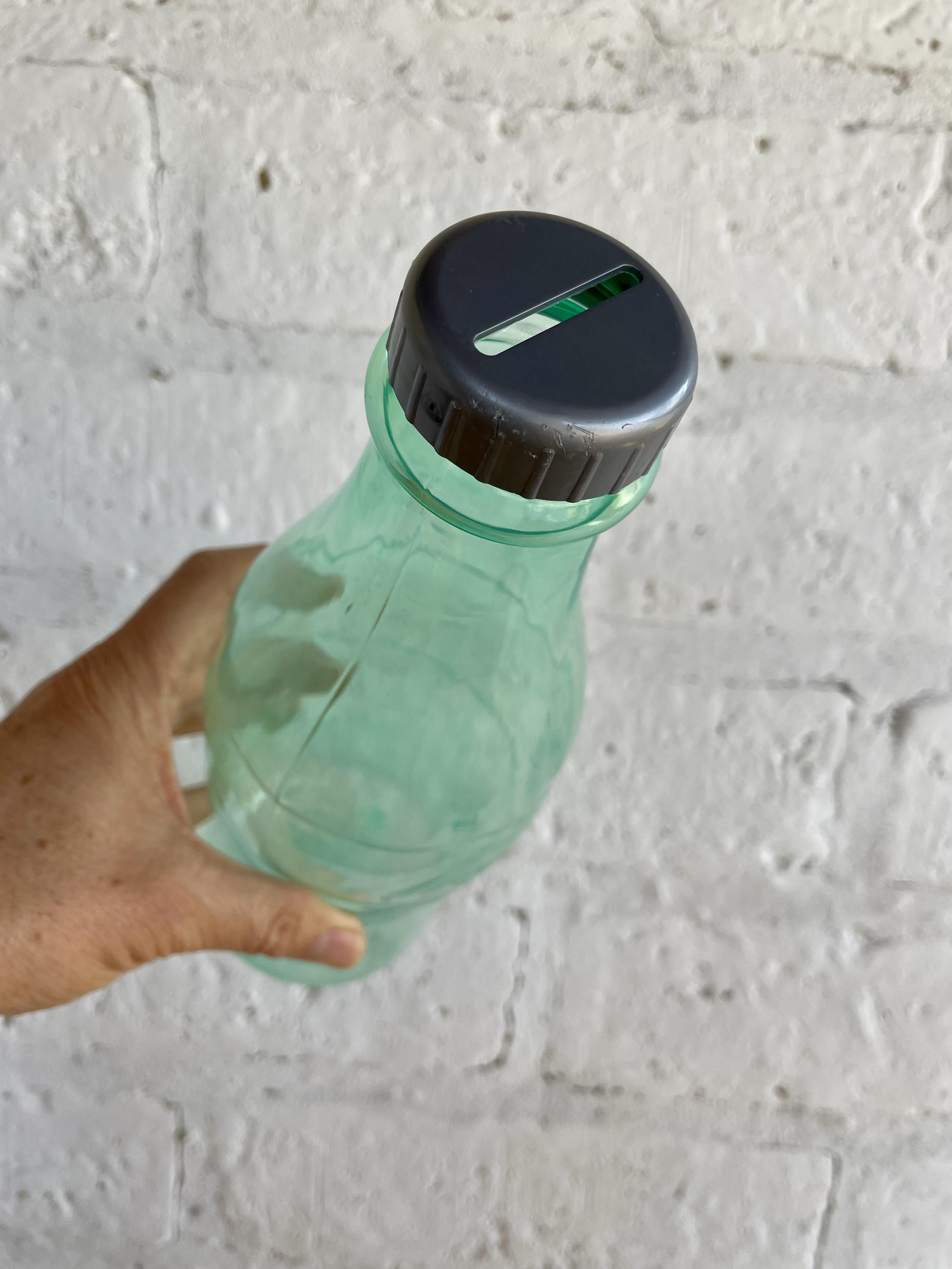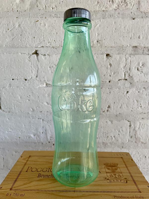 Alcancía botella de Coca Cola plástica. En la tapa tiene una ranura para introducir las monedas. La tapa es de rosca y se puede quitar y poner.
