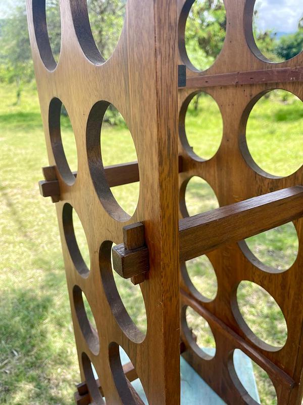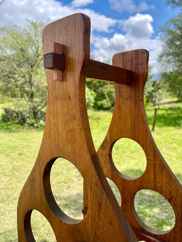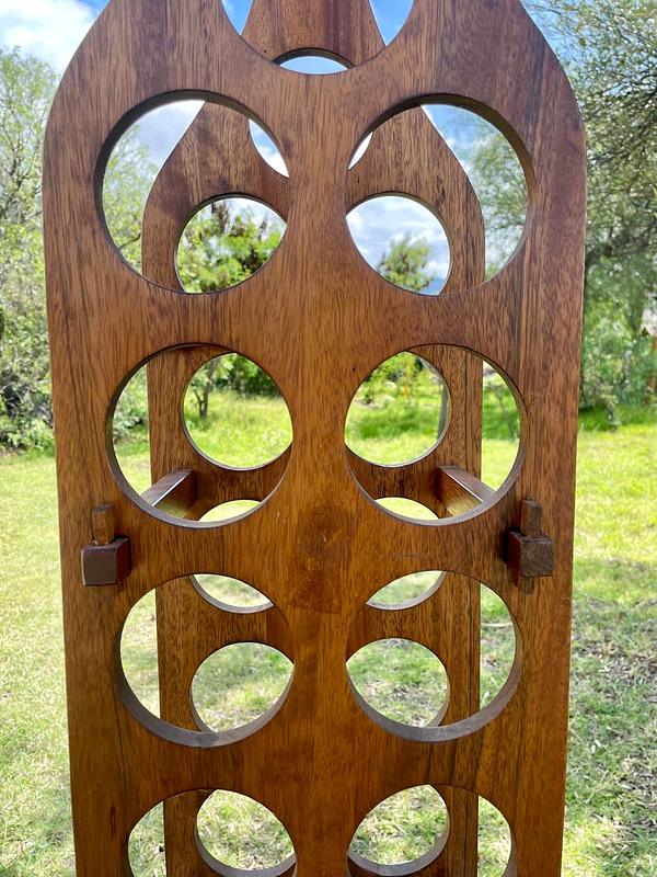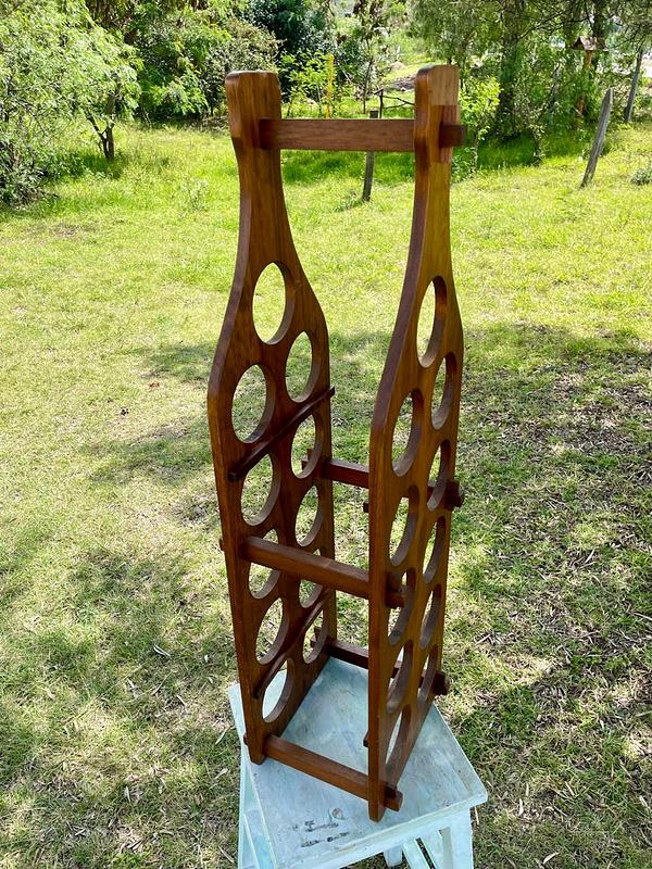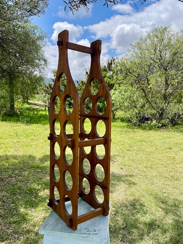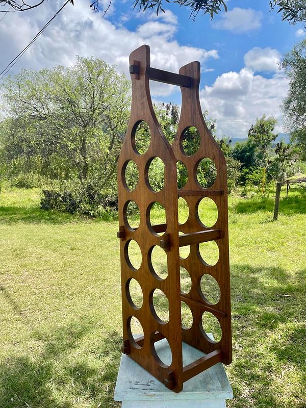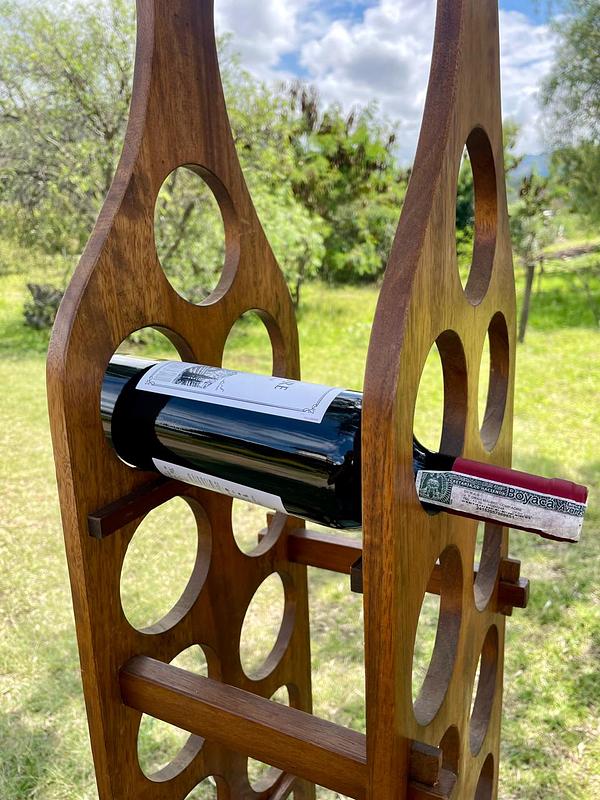 Soporte con espacio para almacenar 11 botellas de vino, elaborado con tablas de madera maciza que se puenden desarmar y armar asegurándolas con unas pequeñas cuñas. La madera se encuentra en buen estado con algunos desgastes en la pintura transparente de la superficie.