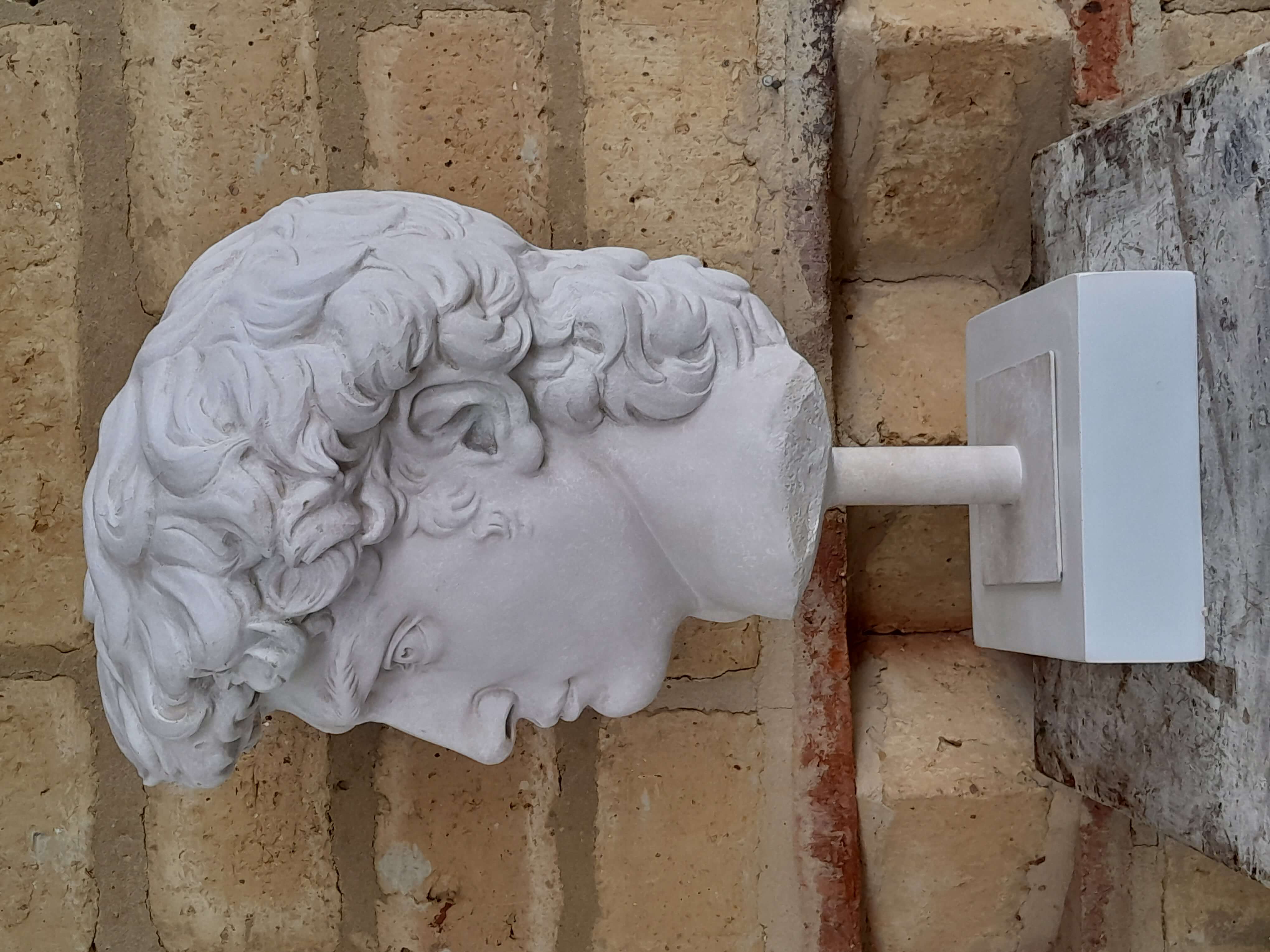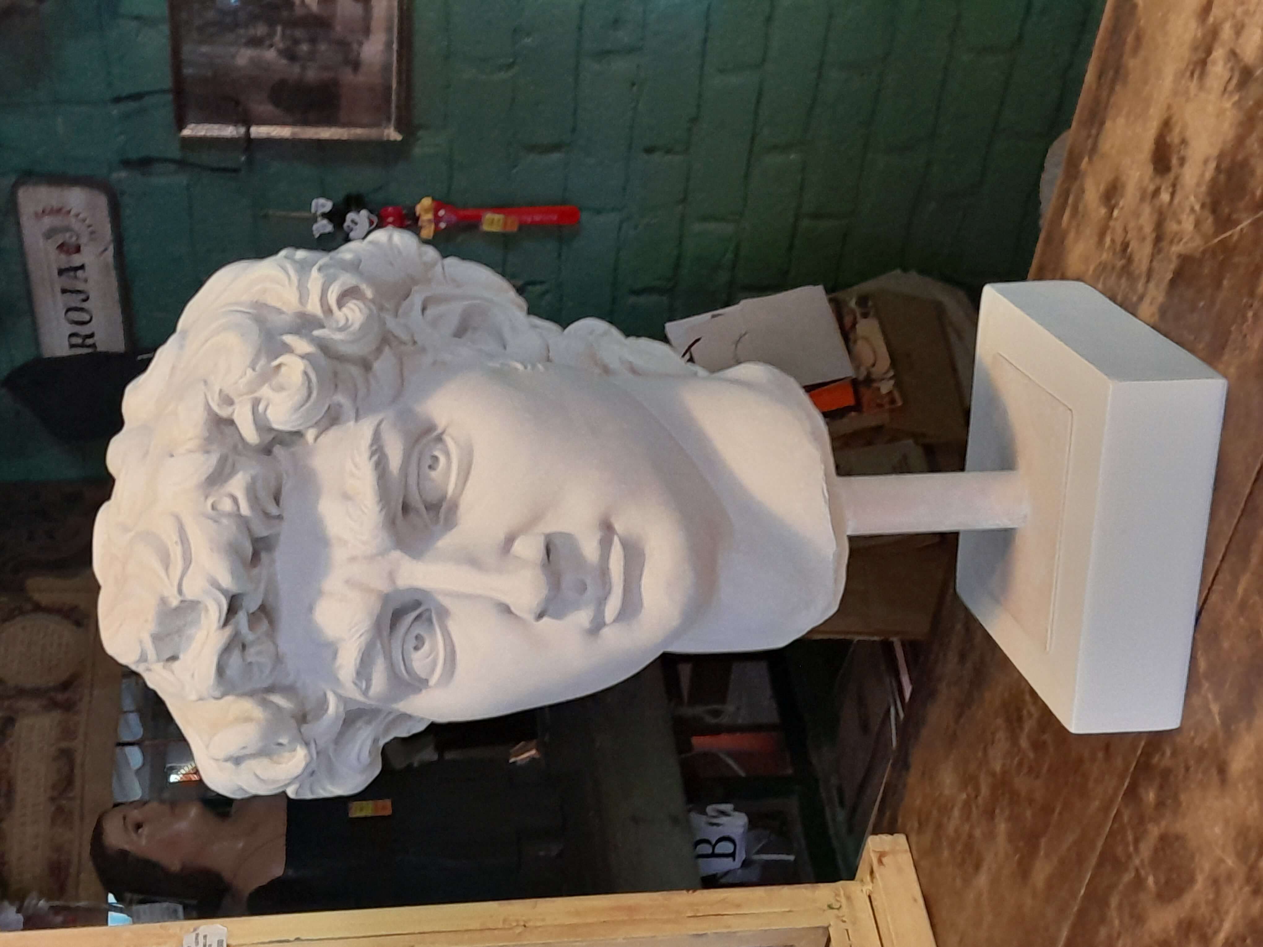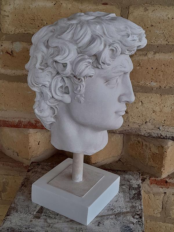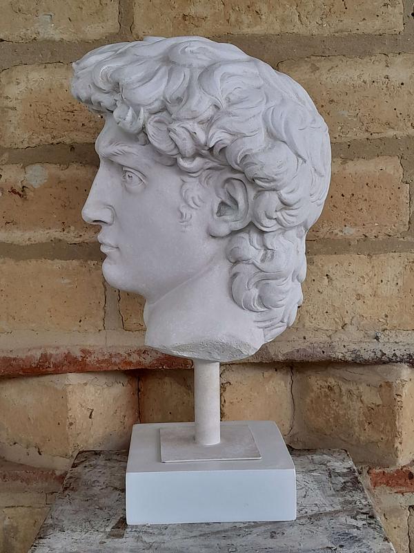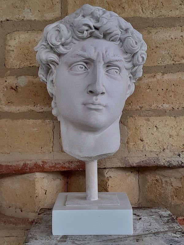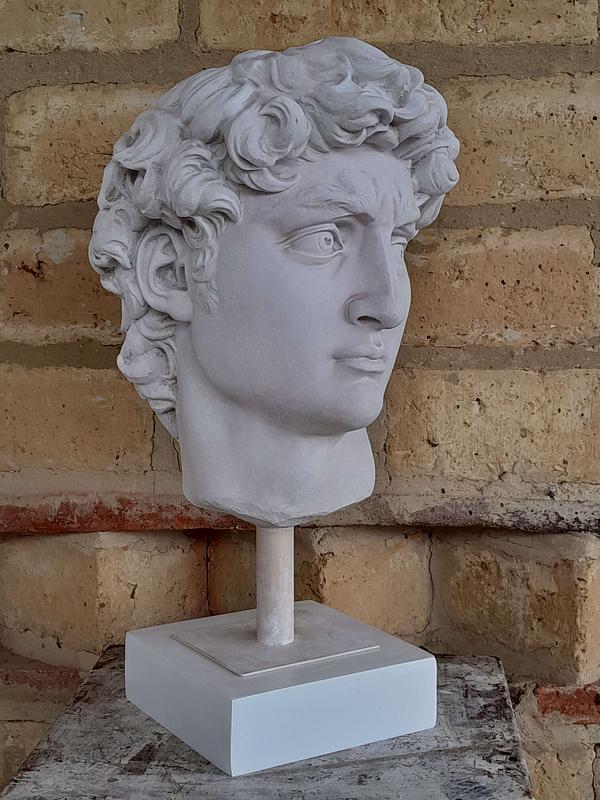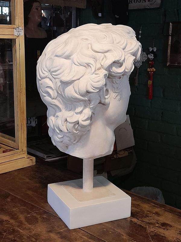 Reproducción en resina de la cabeza de David de Miguel Angel. Fundida en resina con apariencia de mármol blanco.