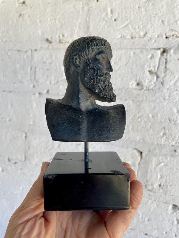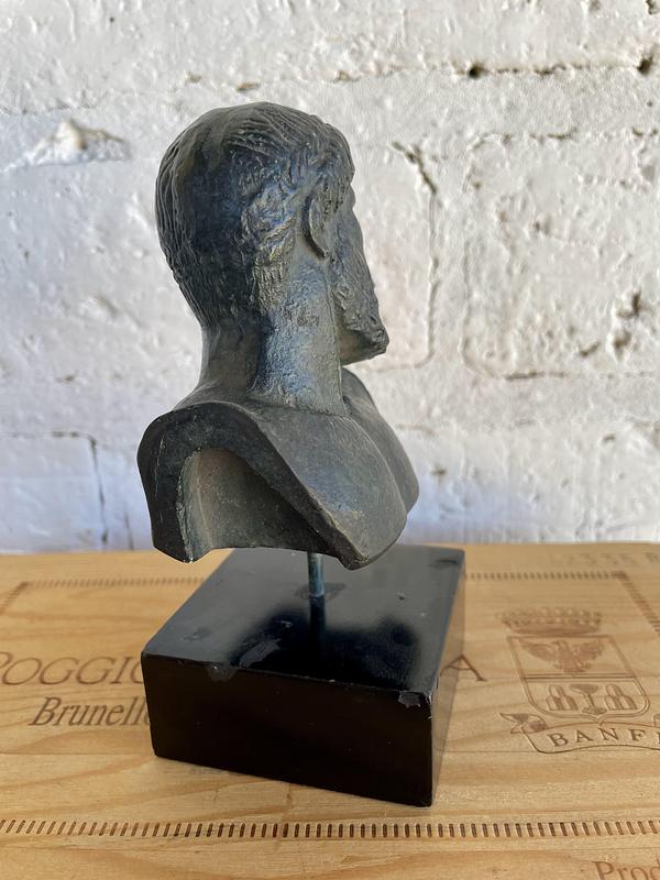Busto en resina con apariencia metálica y base de madera. La base tiene peladuras en la pintura.