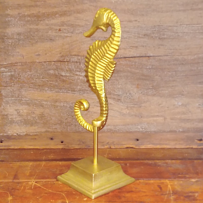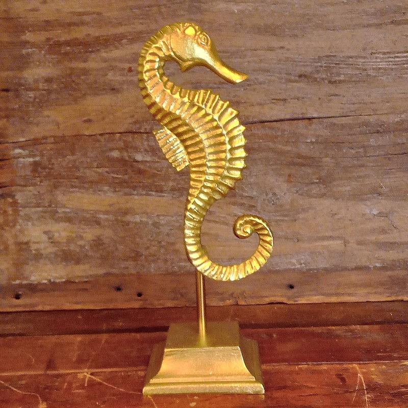 Figura de caballito de mar en metal con base decorado con pintura dorada.