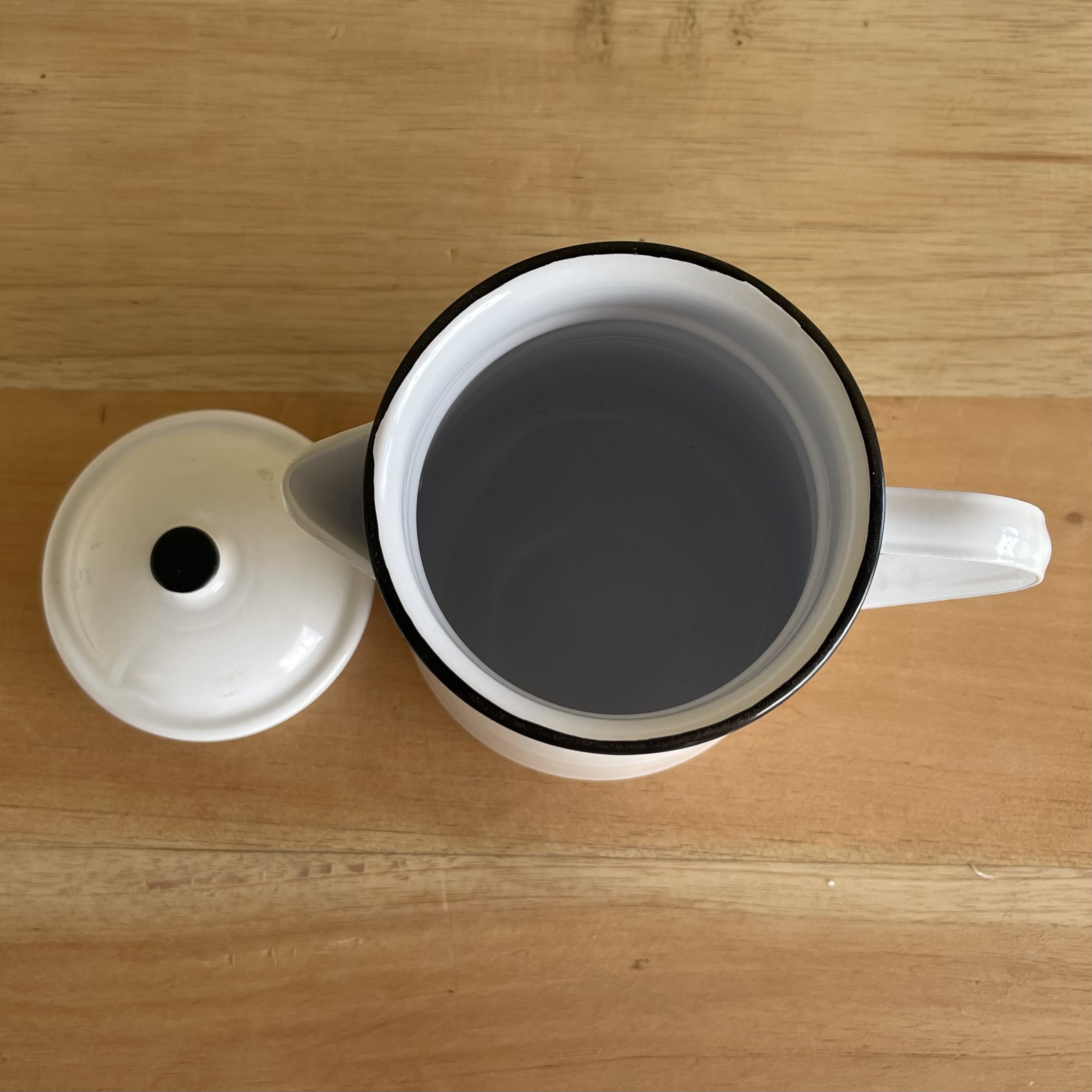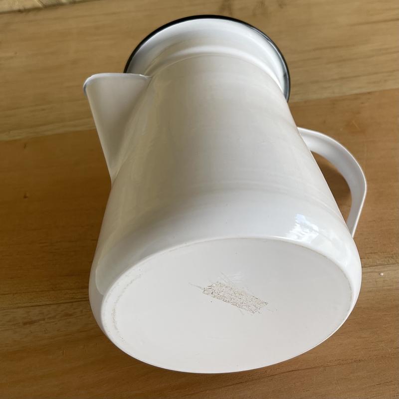 Cafetera metálica producida recientemente con apariencia de los utensilios antiguos de peltre, esmaltada en color blanco.