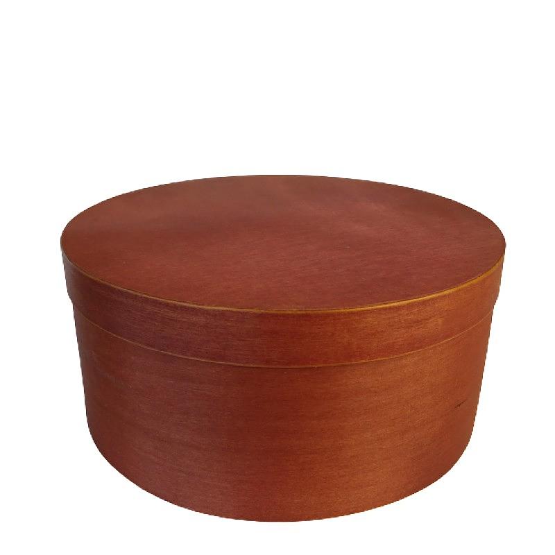 Caja de madera "primitive box", con remaches en cobre, color rojo. Artesanía popular de los Estados Unidos de mediados del siglo XX. Estas cajas redondas se utilizaban para guardar cereales y quesos en las cocinas.