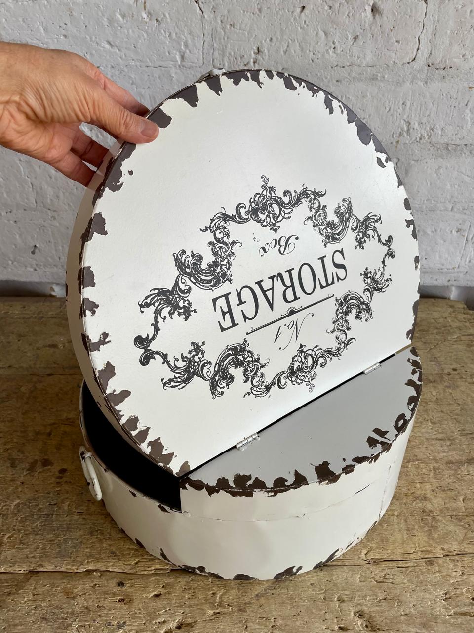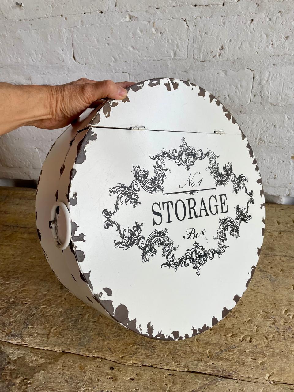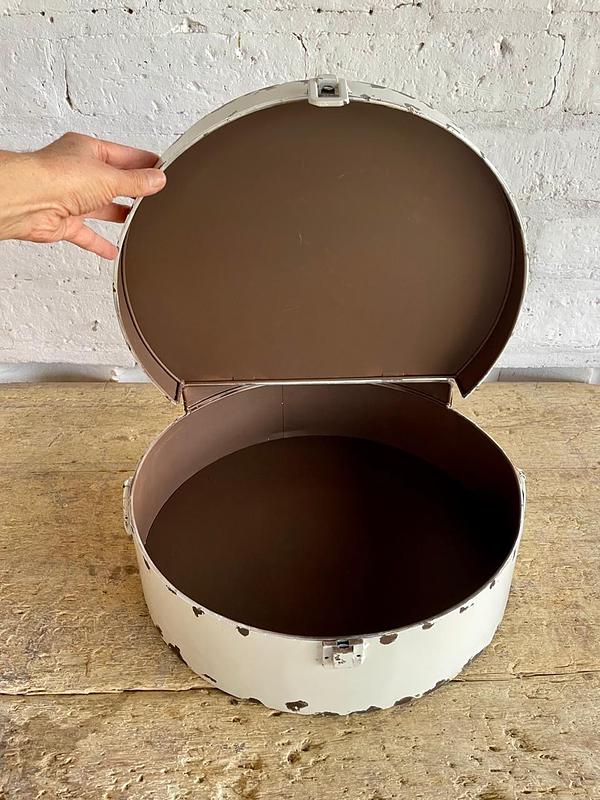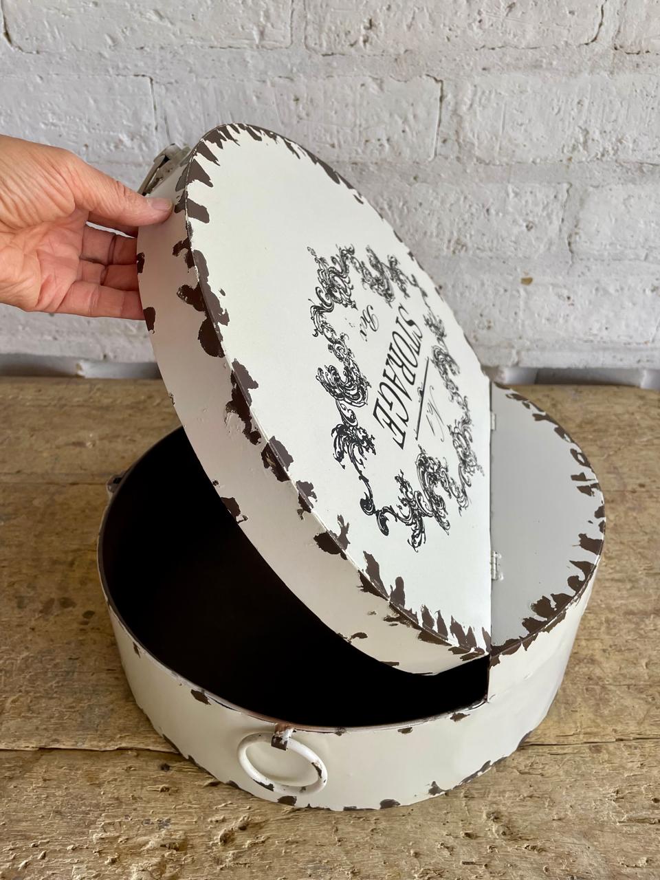 Caja elaborada en los años ochenta, con lámina metálica gruesa y decorada con pintura desgastada dando la apariencia de una caja antigua de sombreros. La tapa tiene dos bisagras. Se encuentra en buen estado.