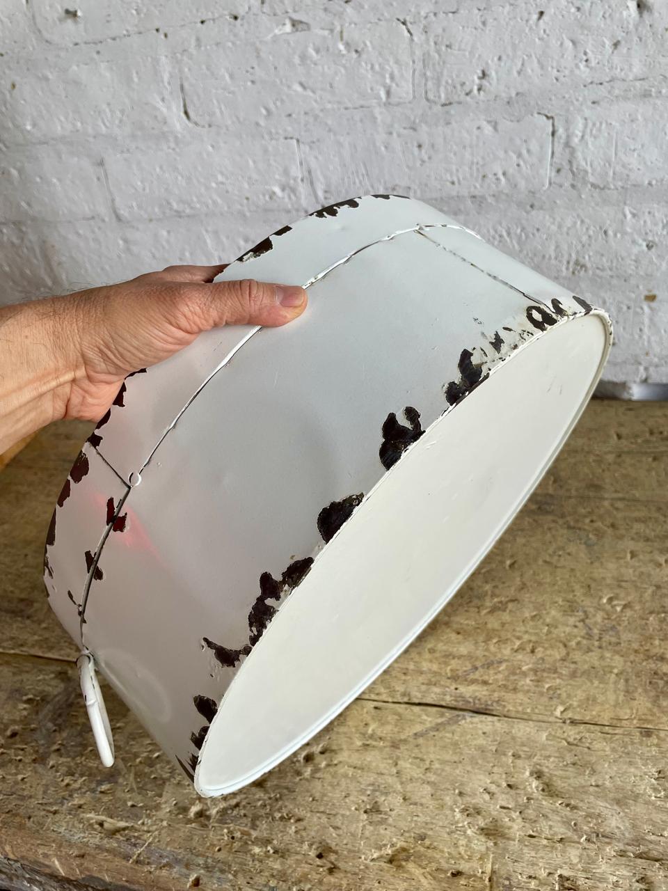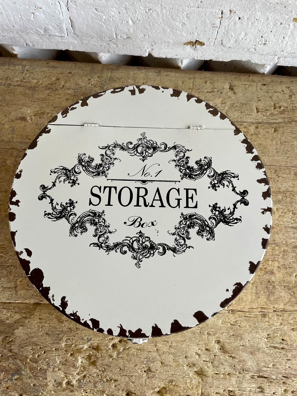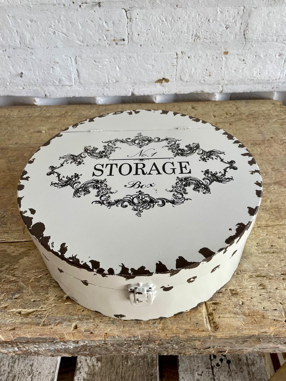 Caja elaborada en los años ochenta, con lámina metálica gruesa y decorada con pintura desgastada dando la apariencia de una caja antigua de sombreros. La tapa tiene dos bisagras. Se encuentra en buen estado.