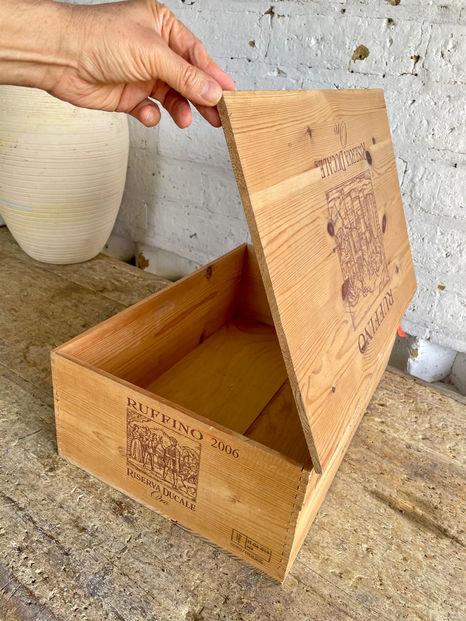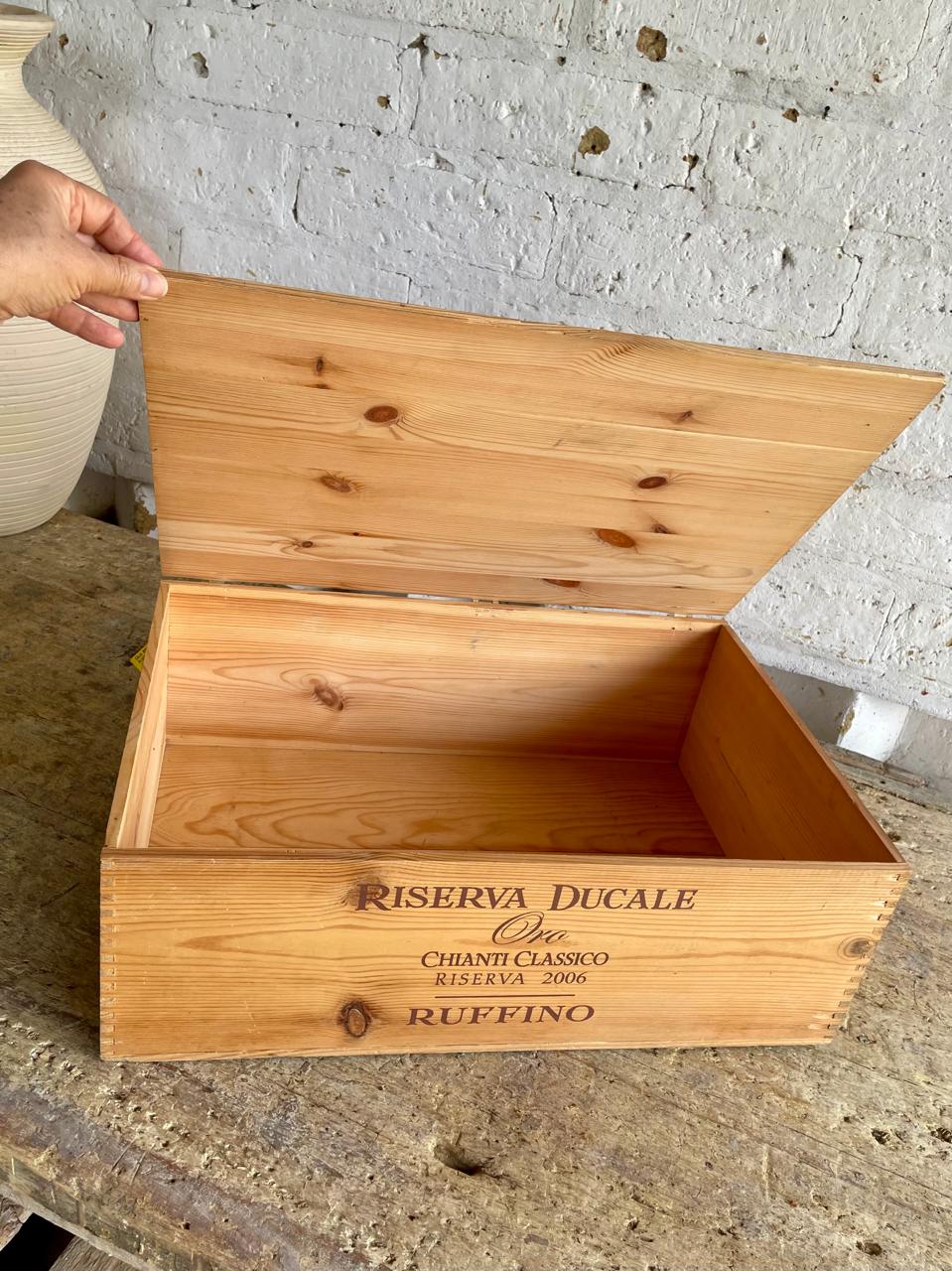 Caja vacía de madera de pino italiana de la Toscana, Rufino producido en la colinas del Chianti con denominación de origen controlado. La caja se encuentra en buen estado y tiene la tapa original. Presenta desgastes por el paso del tiempo y el uso.