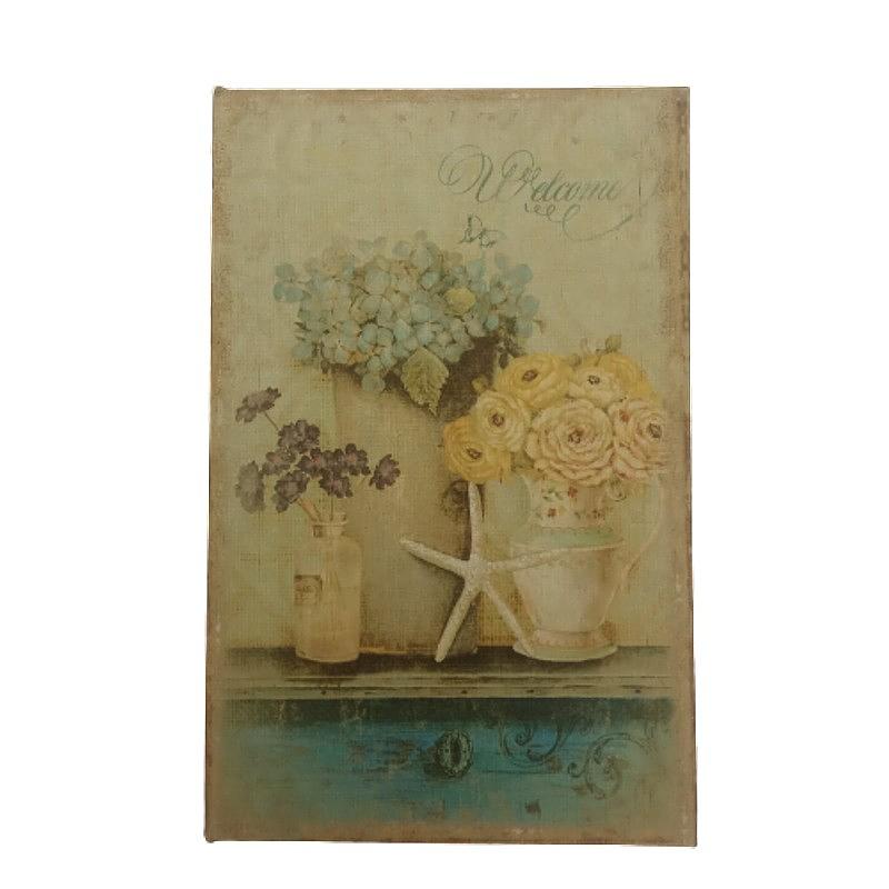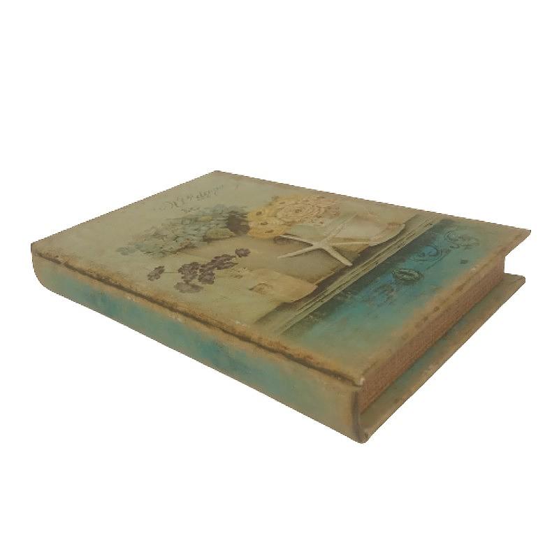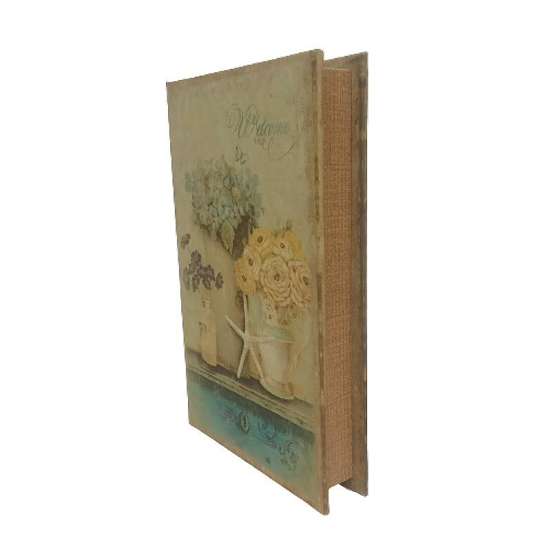 Caja en madera con pastas forradas en lona decorada con flores y el interior en gamuza. Tiene un sistema de cierre imantado. La apariencia es de un libro antiguo