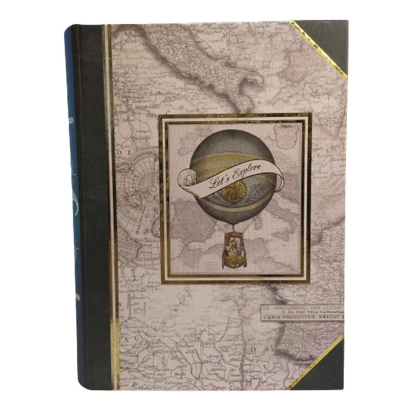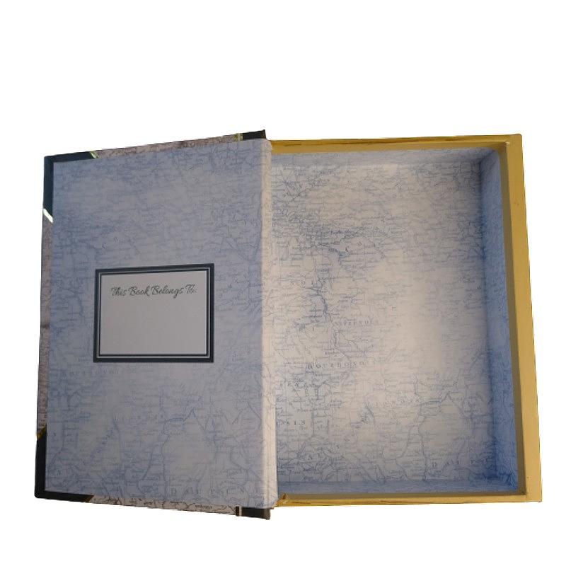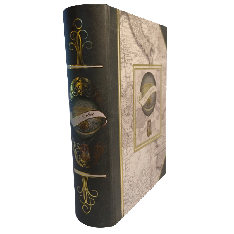 Esta caja de cartón forrada en fino papel decorado con motivos de mapas, tiene apariencia de libro antiguo y cierre imantado.