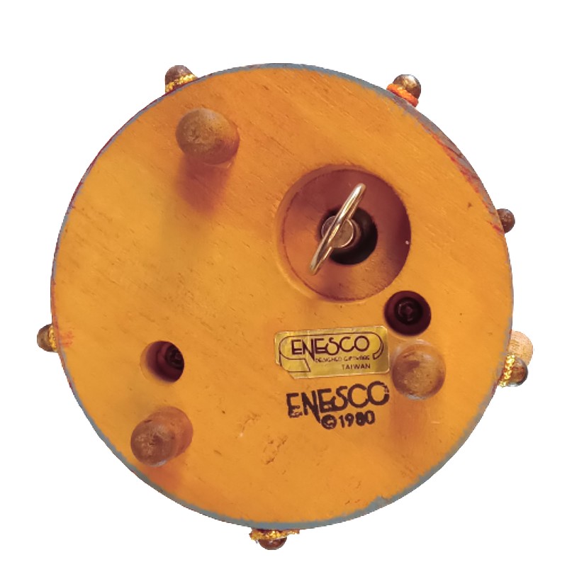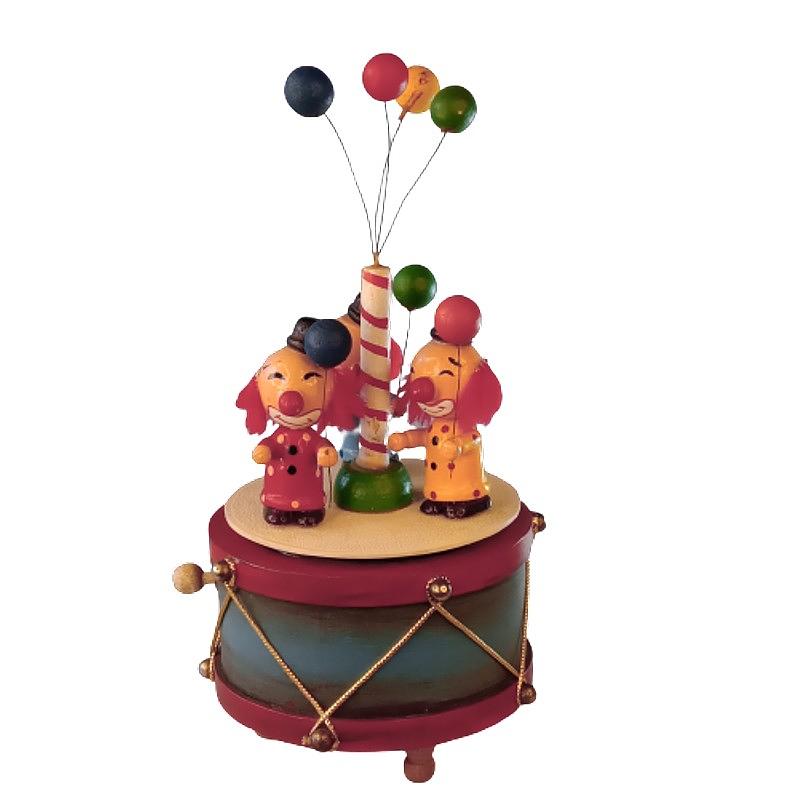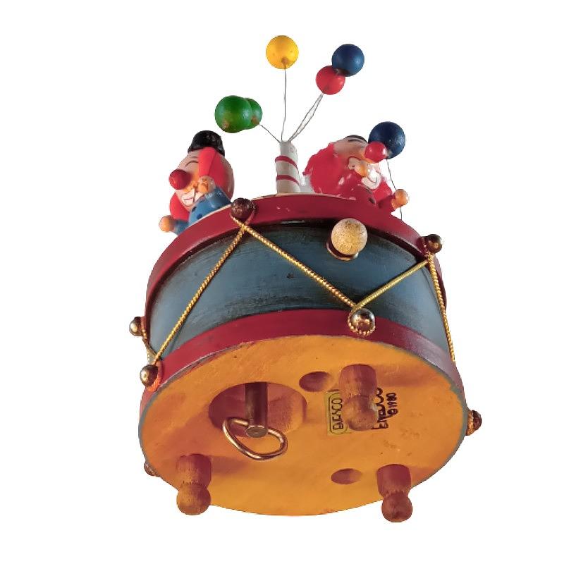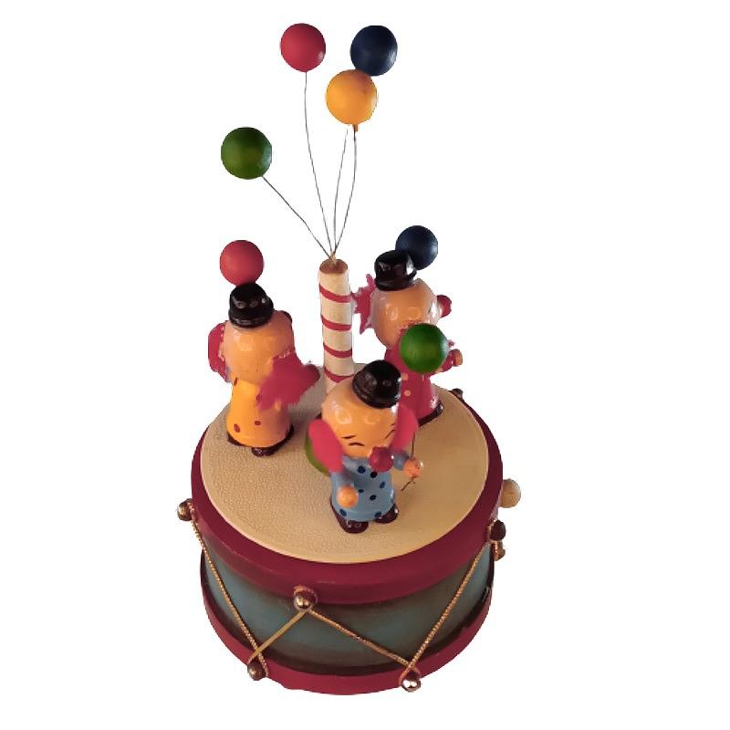 Caja musical de tres payasos que giran sosteniendo en la mano globos de madera, fabricada en 1980 por Enesco empresa Inglesa líder en la producción de muñecos para Disney y otras marcas.