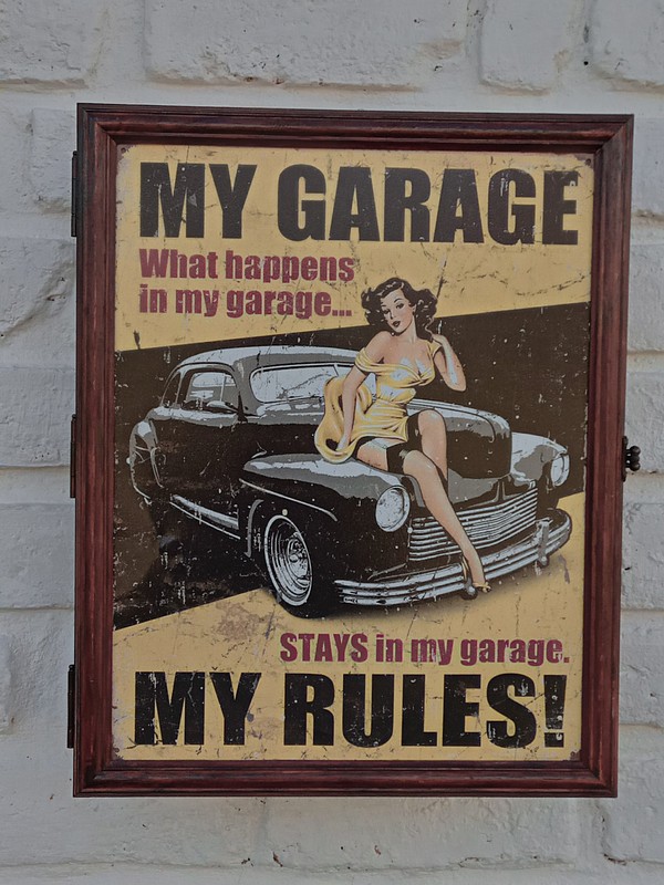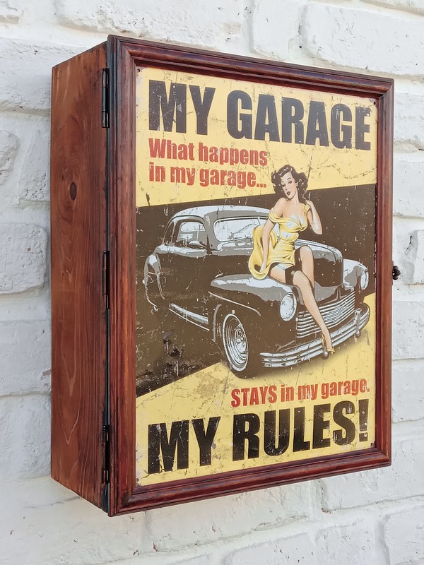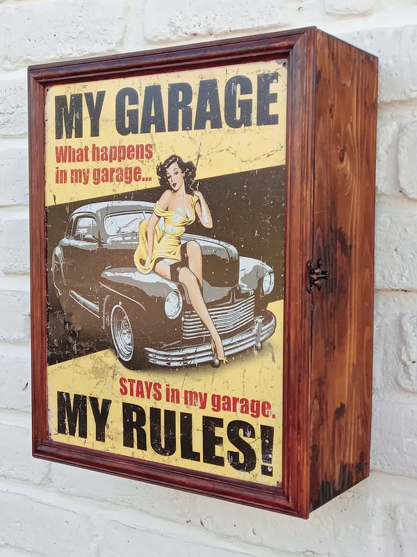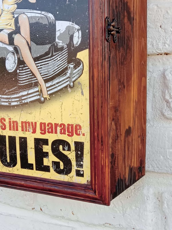 Caja en madera de pino. La tapa está decorada con una lámina metálica retro.