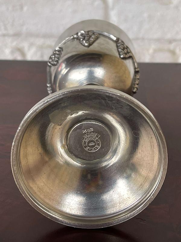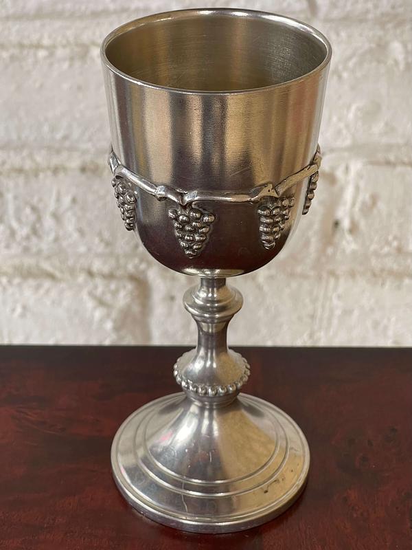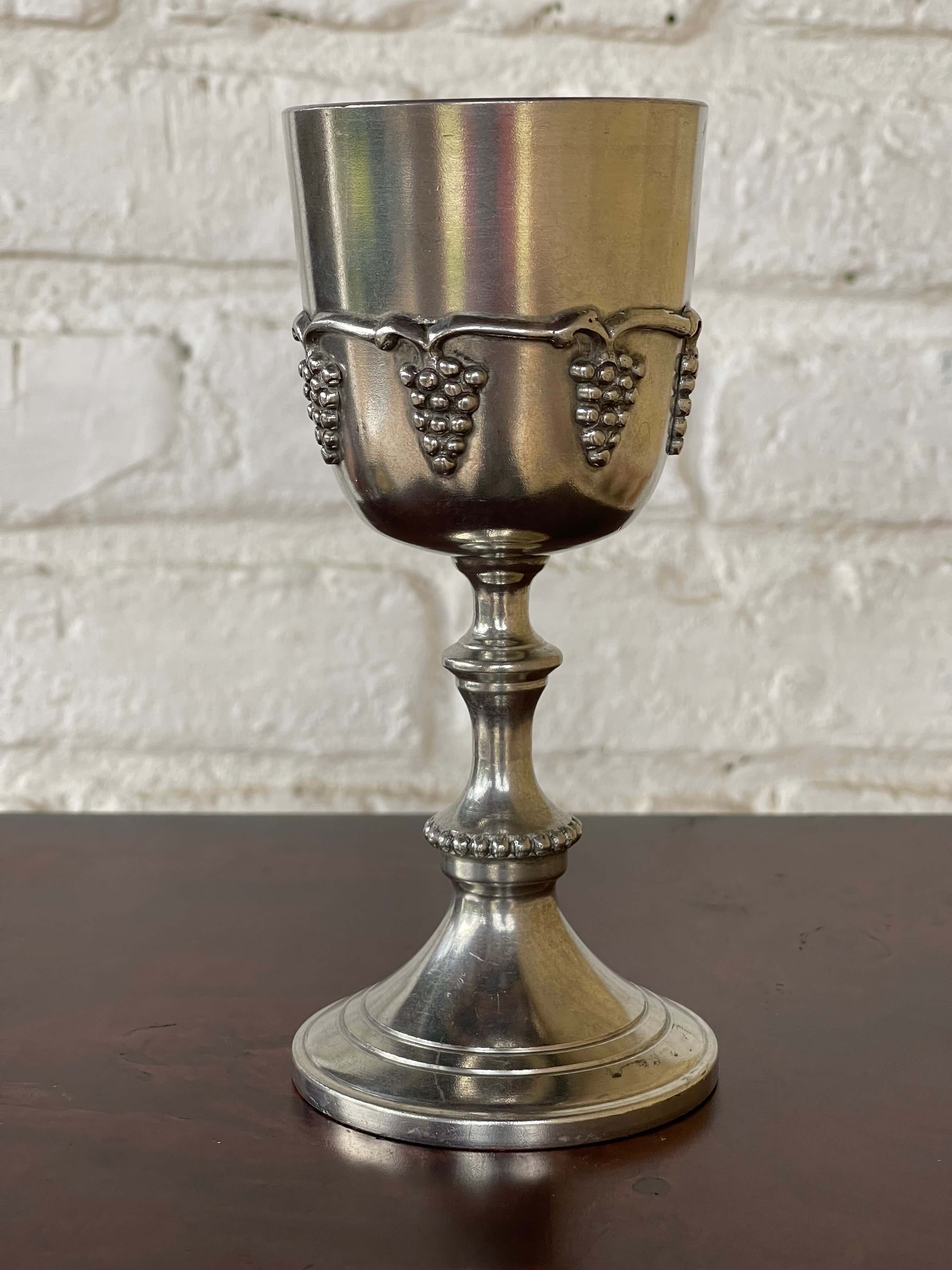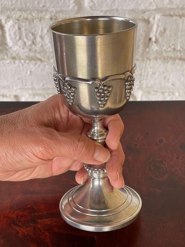 Cáliz de peltre macizo Olde World elaborado en Viale, Italia. La base está marcada EPU 107 EUROPE PEWTER 95%. Decorado en alto relieve con racimos de uvas.