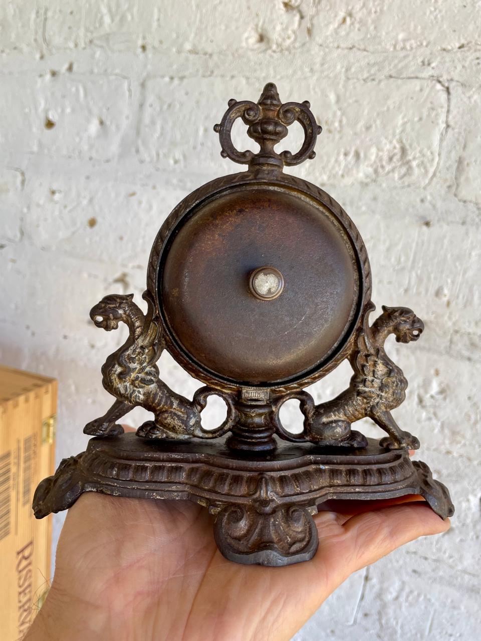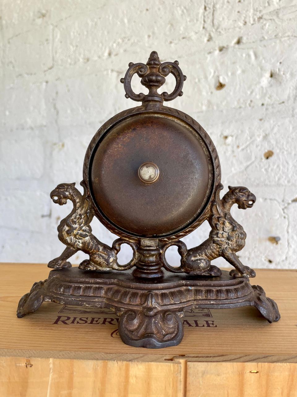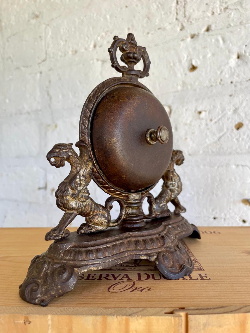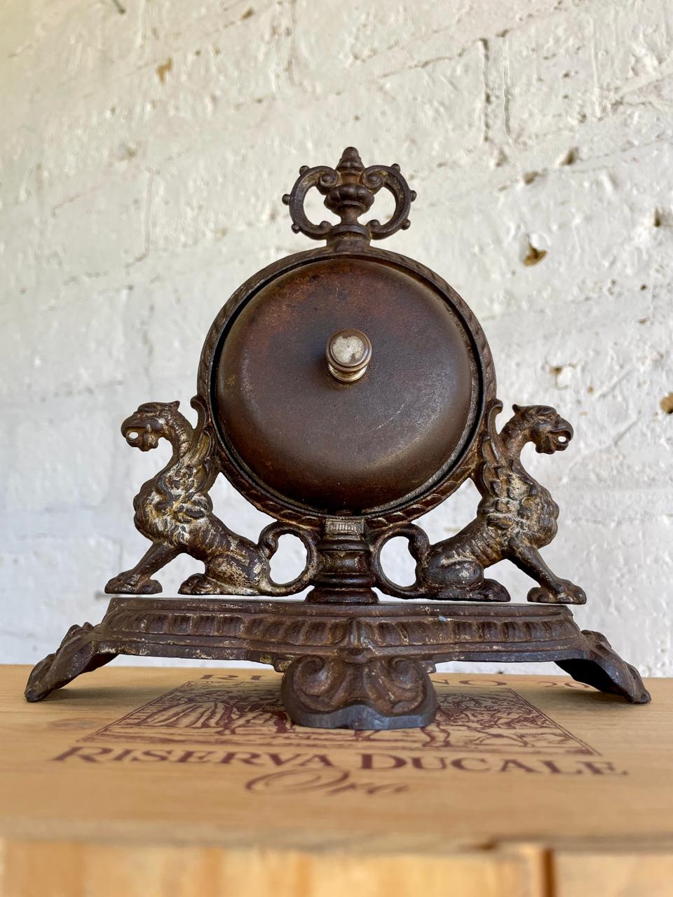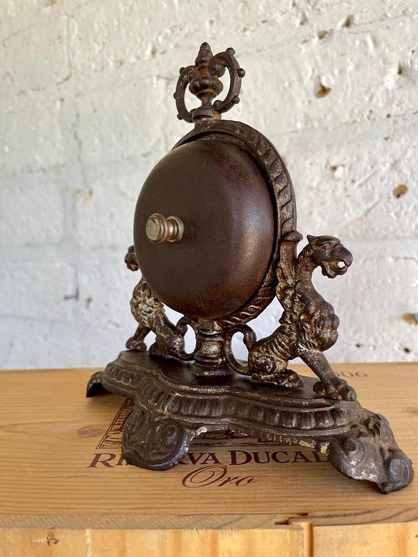 Antiguo timbre de recepción de hotel fabricado en Francia cerca de 1890 en hierro fundido con señas de plateado, tiene una campana a cada lado con sendas perillas que suenan correctamente al girarlas. La base está decorada con dos dragones y remata un copete en la parte superior. Su anterior dueño contó que este timbre perteneció al Hotel Regina de Bogotá en los años veinte y que había otro igual en el Hotel Granada también ubicado en Bogotá.