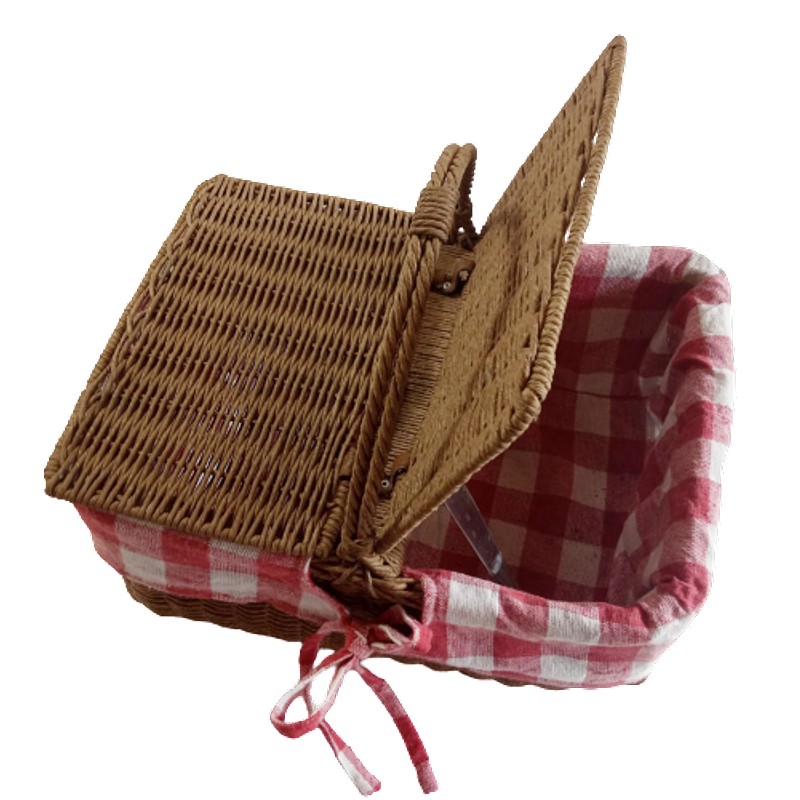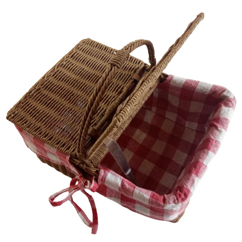 Elaborada en cordón de papel craft tejido sobre un armante metálico. Forrada en tela de algodón de cuadros rojos y blancos. Tiene dos tapas unidas en el centro.