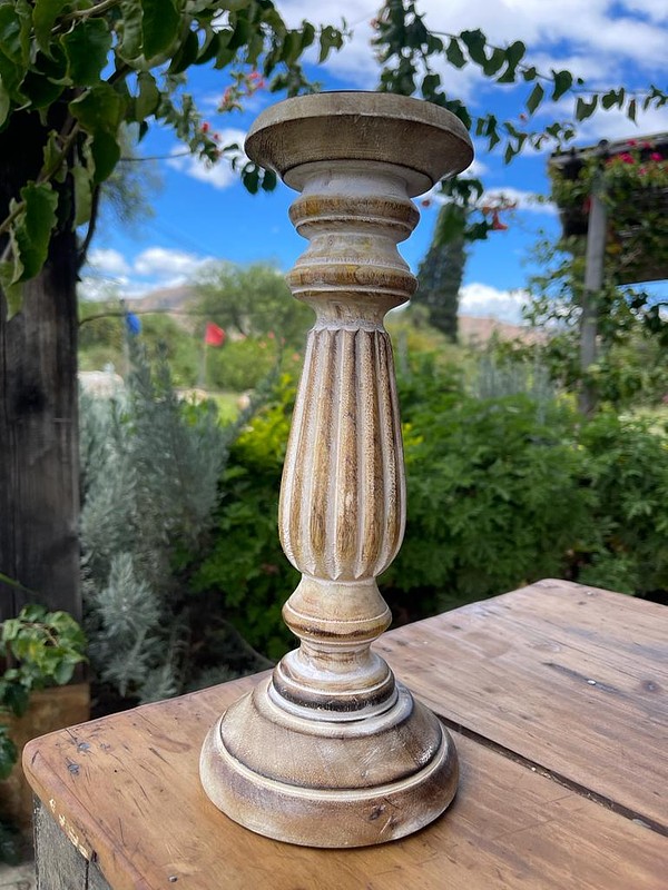 Candelabro artesanal en madera tallada estilo columna, con pintura desgastada. Se encuentra en buen estado