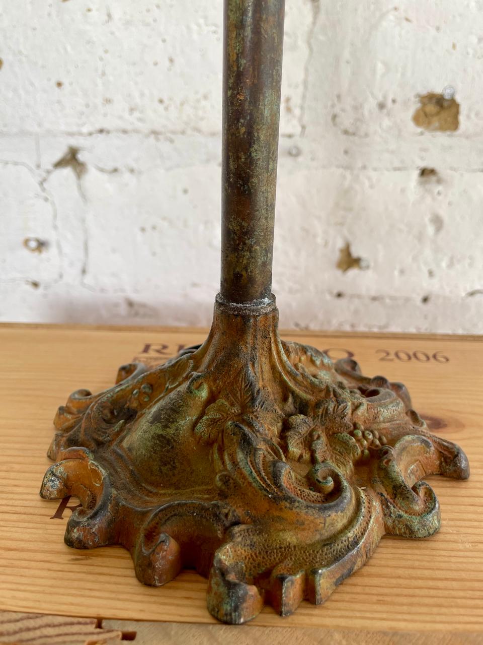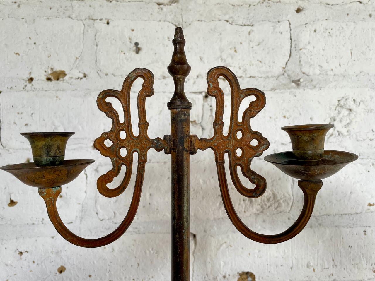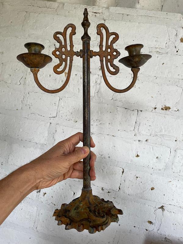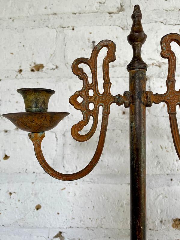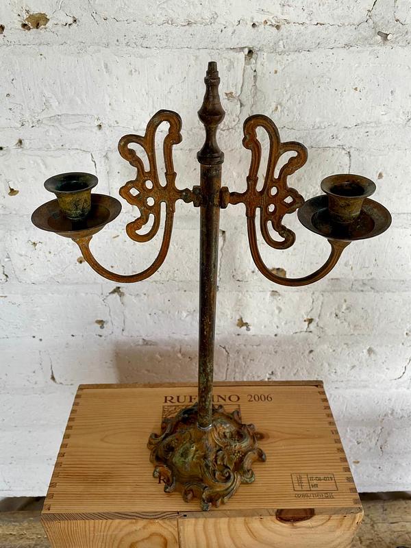 Candelero elaborado en el taller de supra reciclaje de Bonito Bonito ensamblando piezas de metal fundido, tubo y elementos antiguos procedentes de diferentes objetos y lugares. Una segunda oportunidad para piezas metálicas desechadas generando un candelabro funcional y decorativo. Una pieza única.