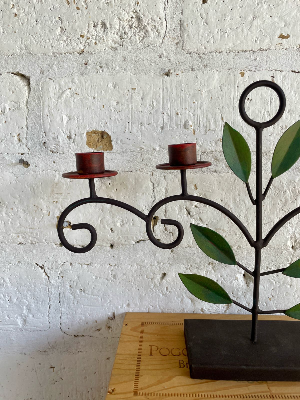 Candelabro metálico con espacio para 4 velas decorado con hojas de latón grueso.