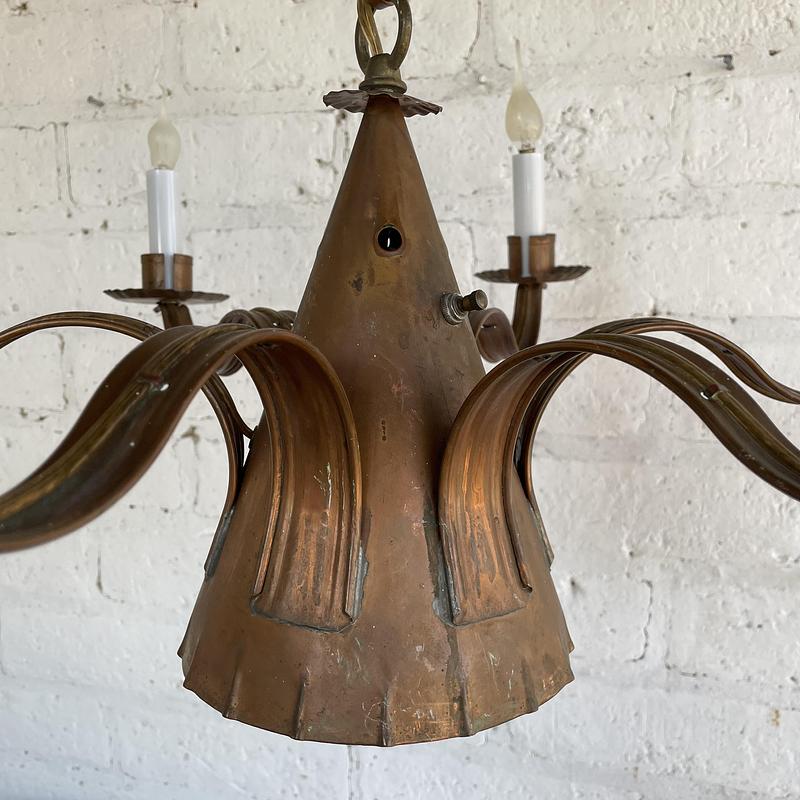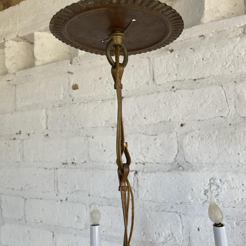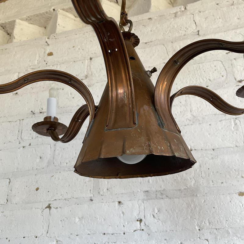 Lámpara rústica elaborada en lámina gruesa de cobre en EE.UU. a inicios del S XX. Tiene 6 brazos que terminan con bombillo tipo vela, al centro tiene roseta para poner otro bombillo de rosca corriente E27. Un interruptur permite encender los bombillos de los brazos o el bombillo central. La parte eléctrica se renovó y se encuentra funcionando bien.