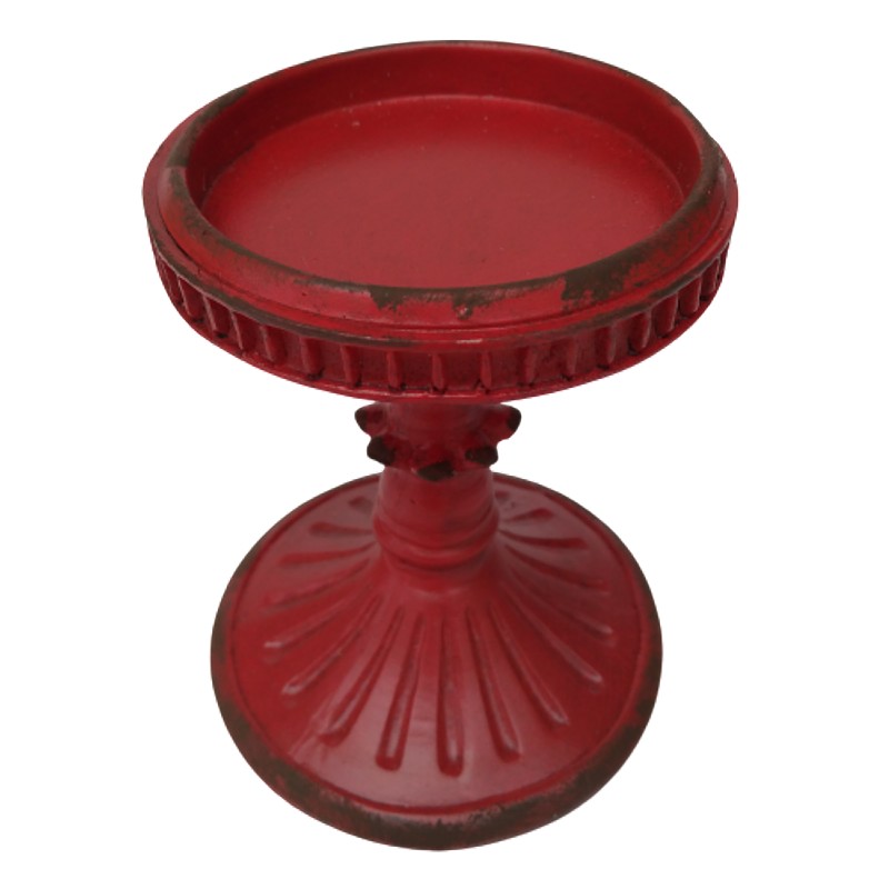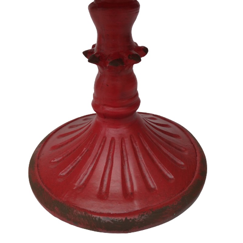 Elaborado en resina de alta calidad con apariencia metálica, decorado con pintura roja desgastada, la parte superior donde se introduce la vela está recubierto en latón.