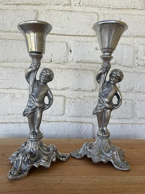 Pareja de candelabros artesanales Mexicanos de la década de los setenta fabricados en aluminio fundido, la base está formada por querubines apoyados sobre un trípode de arabescos en alto relieve.