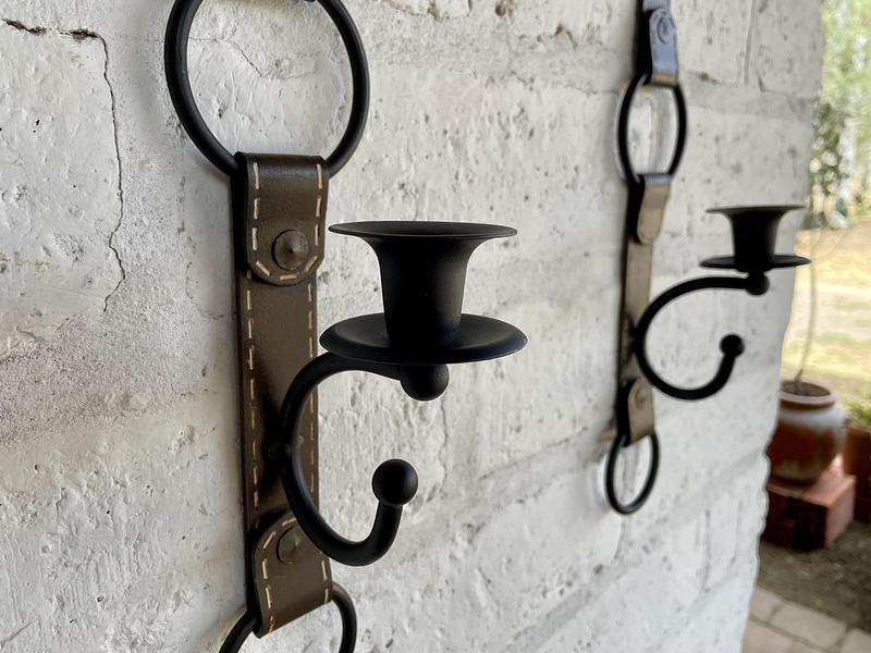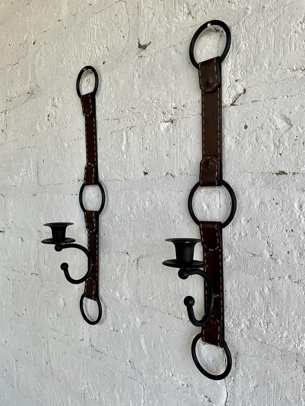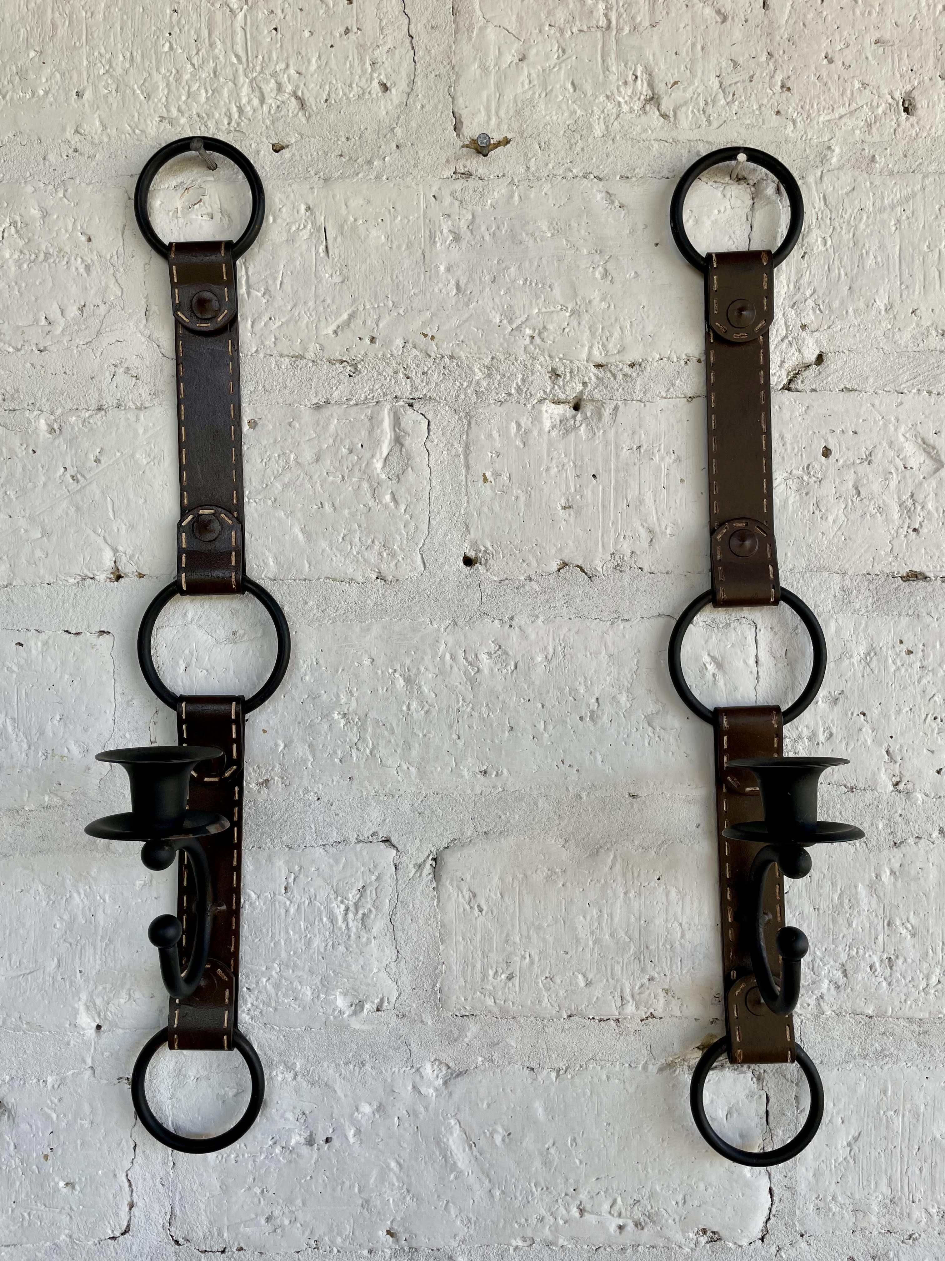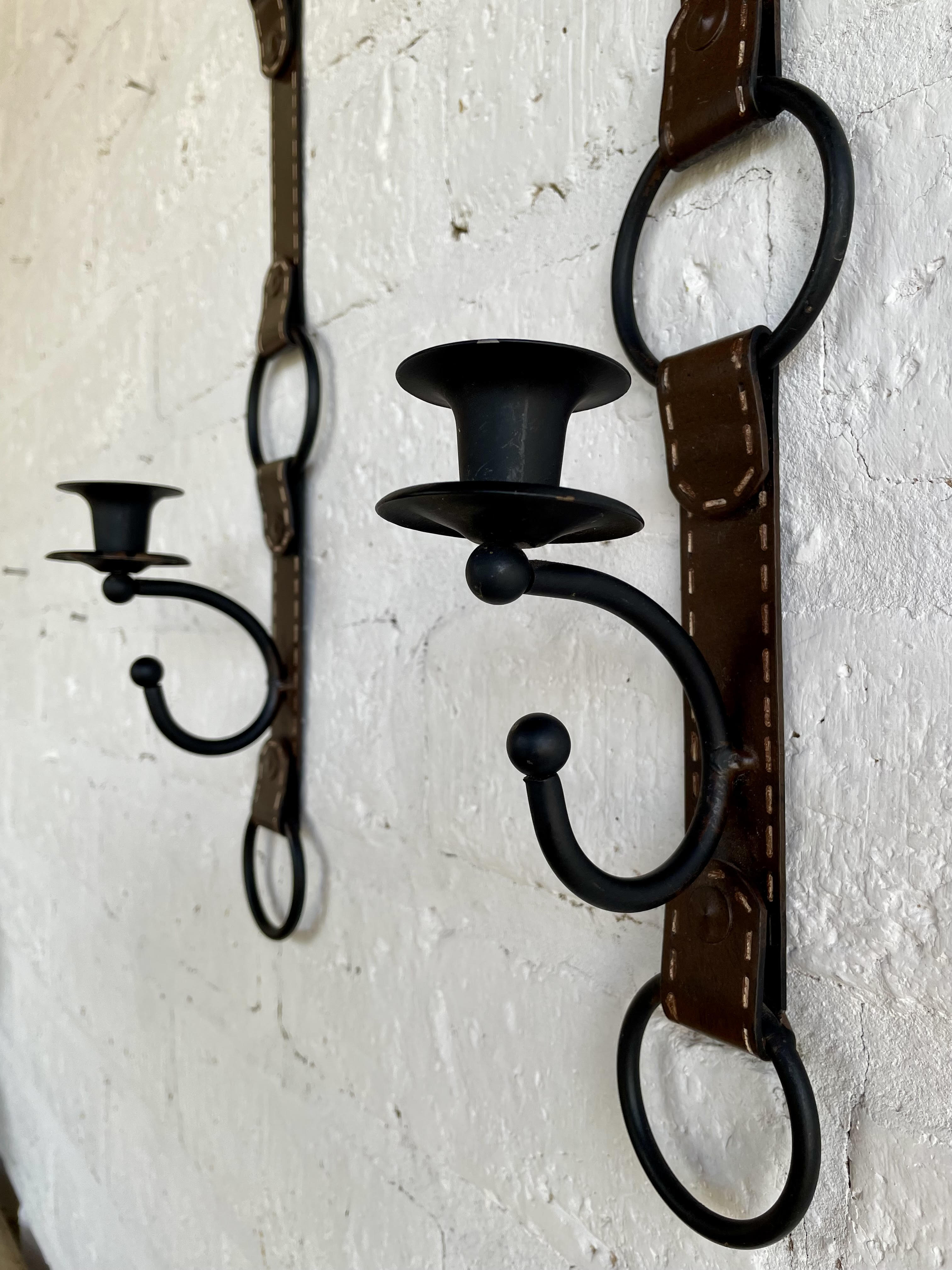 Pareja de curiosos candelabros de pared elaborados en platina metálica gruesa con apariencia de correas de cuero cosidas con pespuntes. Al verlas pareciera que fueran de cuero.